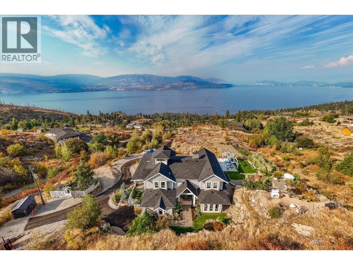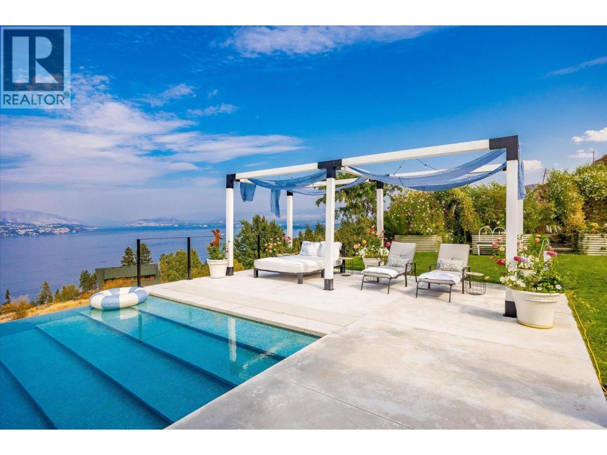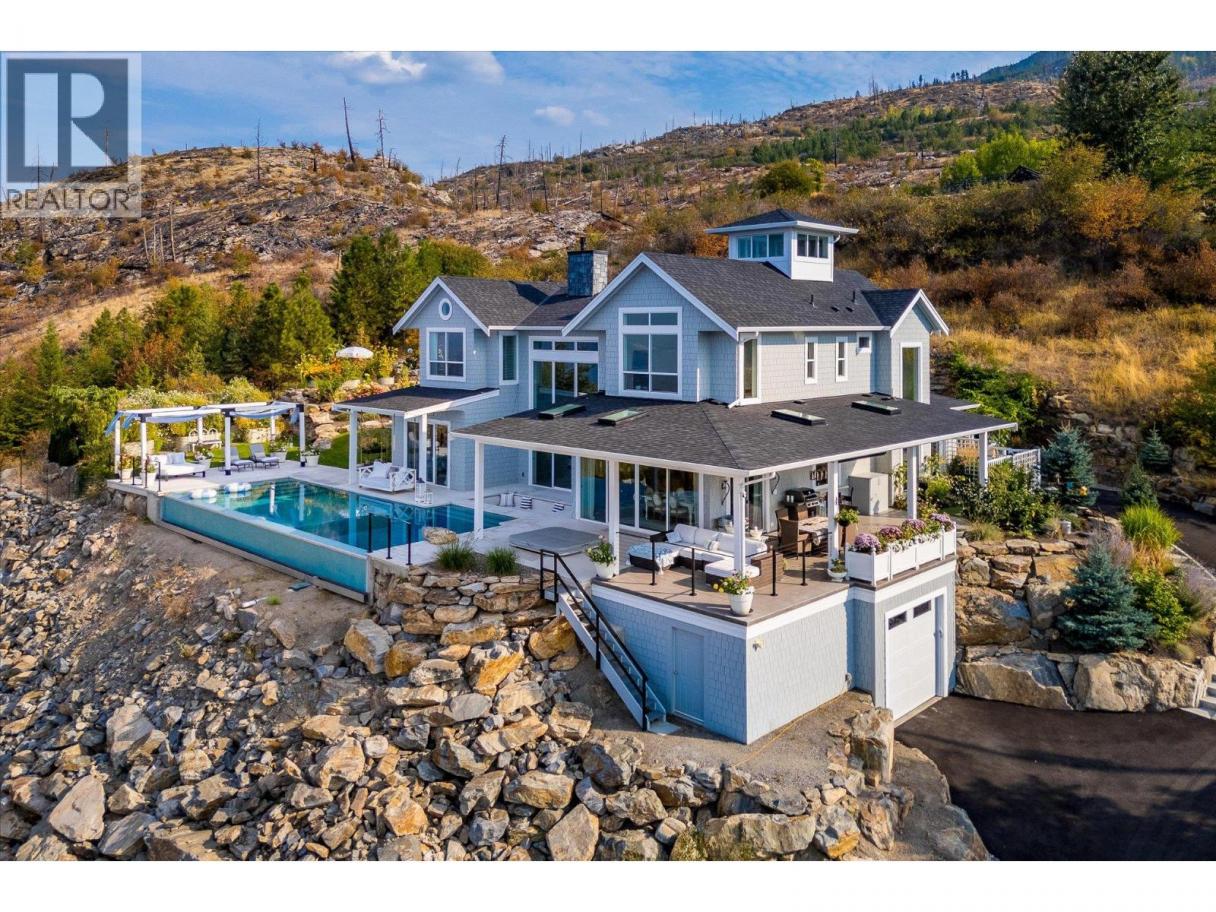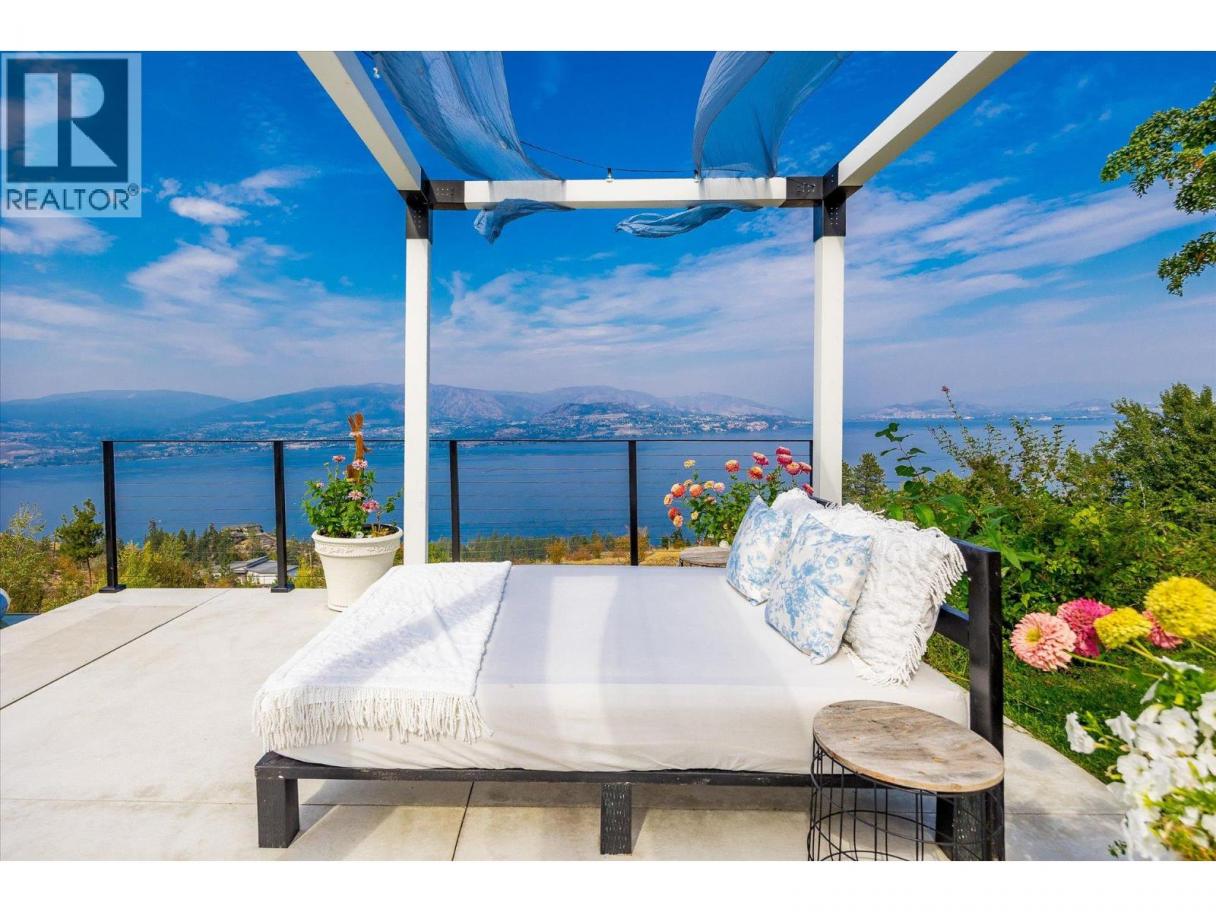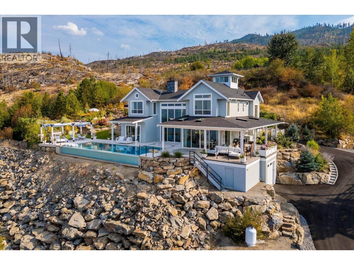 The best view in Kelowna. 2019-built 4 bedroom, 5 bathroom, 5,100+ square foot Modern Hamptons residence perched on a 5.129-acre lot in the Upper Mission area of Kelowna! Upon entering the property, you're greeted with your substantive driveway that carves through the rock, creating a unique estate feel. The grounds include substantial mature landscaping, a custom greenhouse/garden area, a large 30'x60' open-air structure at the top of the property (Wedding venue, workshop conversion, greenhouse, etc), a waterfall & pond feature at your central entry, and several raised planter bed areas; a rare property where even the garden gets a view. Upon entering the home, you are greeted with soaring 20' ceilings in the living room that flow straight ahead to the infinity pool that blends into Okanagan Lake ahead. The main floor offers this stunning living room, a kitchen with a pass-through to the outdoor BBQ area, and a dining room with perfect indoor/outdoor transitions. The master on the main offers the same panoramic views, and a 5-piece private ensuite. The main floor is finished off with a powder room, laundry, and an additional bedroom/office. Upstairs via the floating staircase are two complete master bedrooms with their own en-suites, as well as a private ""perch"" one further level up as a viewpoint. Downstairs, there is a tandem-car garage and a full recreation room that features a bar, room for a pool table, a full bathroom, and a private, fully outfitted theatre room. Outdoor amenities include the covered deck with heaters, BBQ area, hot-tub, tiled infinity pool, and sunken fire pit with seating area. This property uniquely has the modern features of a high-end residence but with 5+ acres, stunning views, full privacy, and extras like the detached structure, and plenty of uncovered parking. (id:6769)