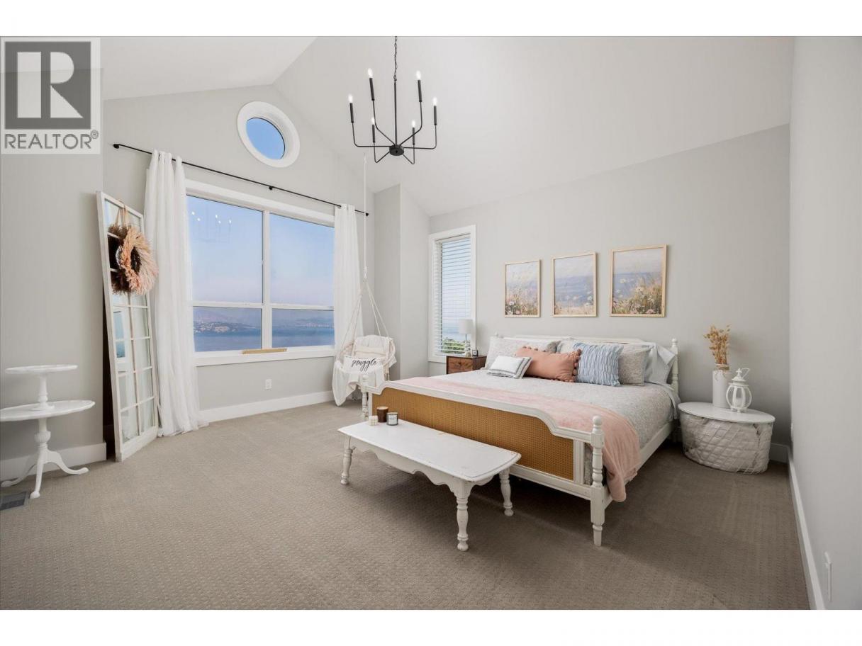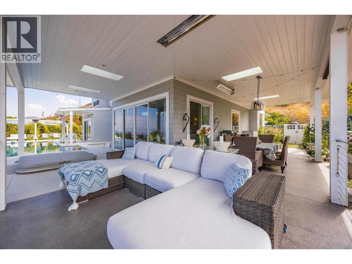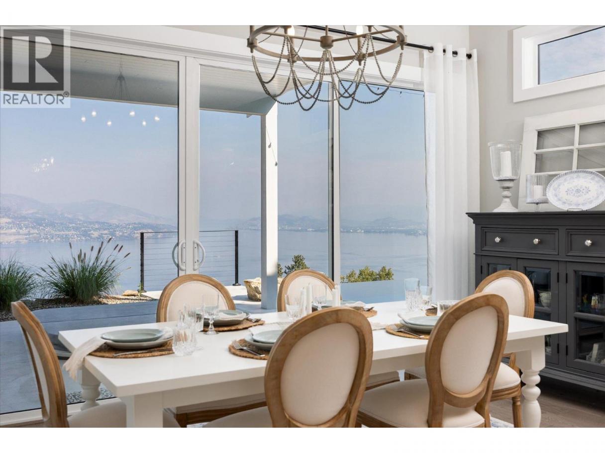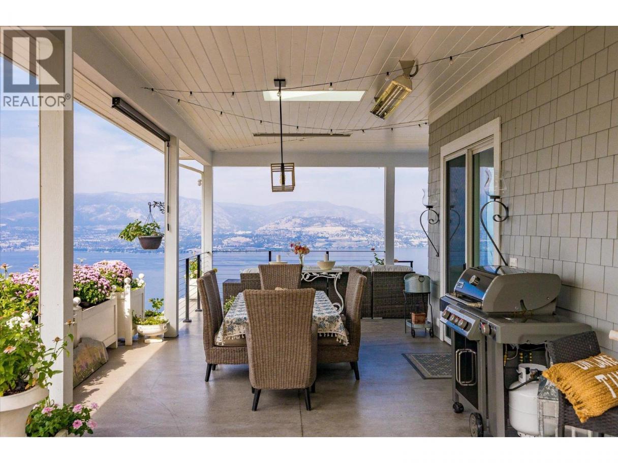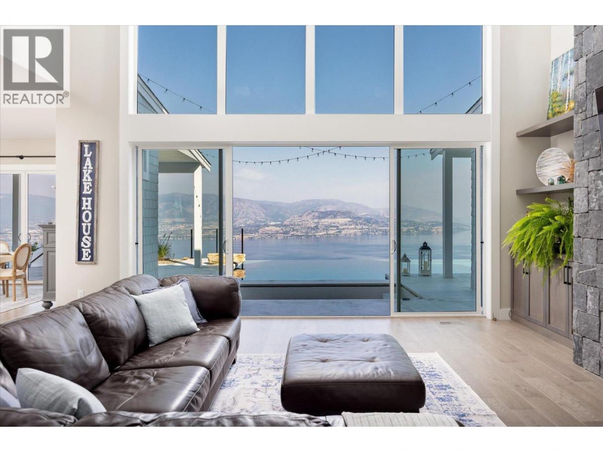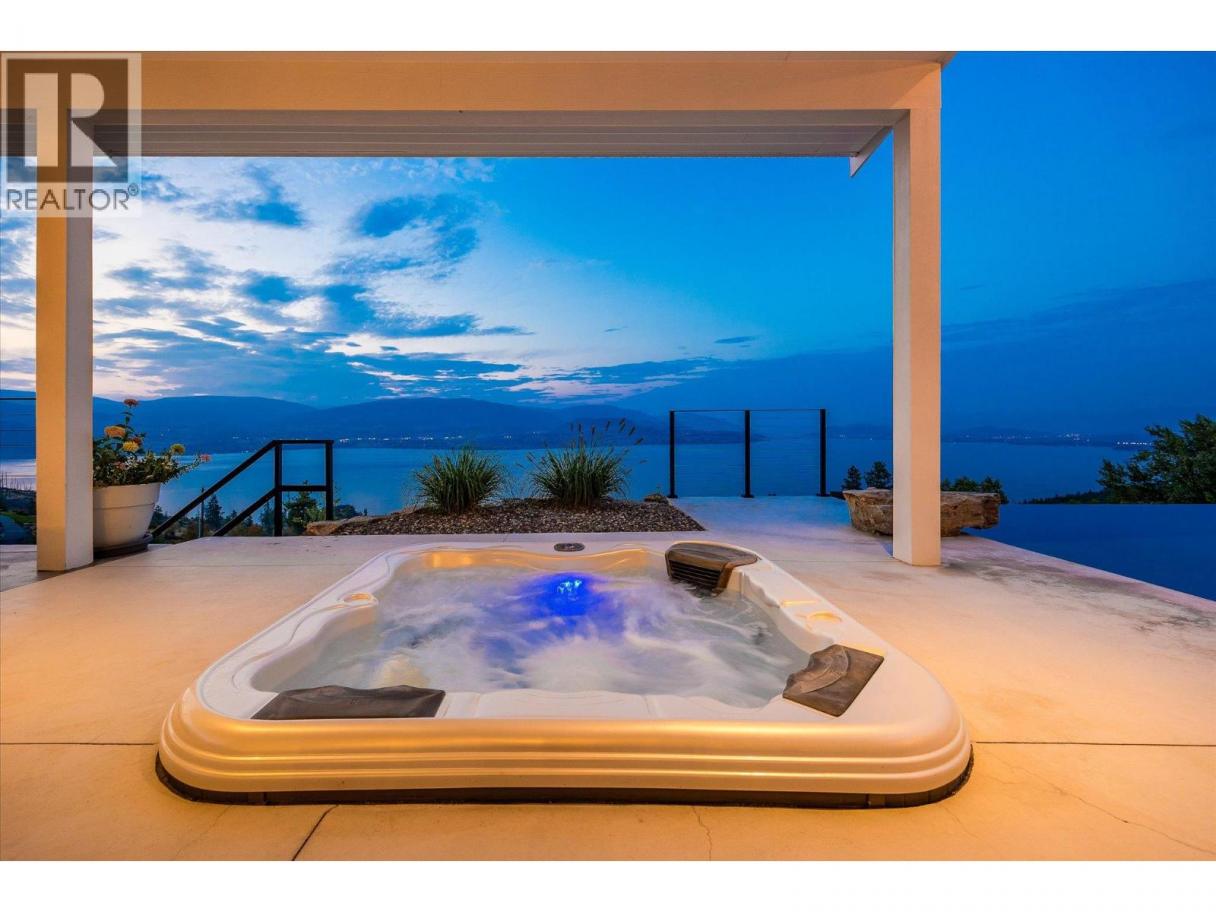 The best view in Kelowna. 2019-built 4 bedroom, 5 bathroom, 5,100+ square foot Modern Hamptons residence perched on a 5.129-acre lot in the Upper Mission area of Kelowna! Upon entering the property, you're greeted with your substantive driveway that carves through the rock, creating a unique estate feel. The grounds include substantial mature landscaping, a custom greenhouse/garden area, a large 30'x60' open-air structure at the top of the property (Wedding venue, workshop conversion, greenhouse, etc), a waterfall & pond feature at your central entry, and several raised planter bed areas; a rare property where even the garden gets a view. Upon entering the home, you are greeted with soaring 20' ceilings in the living room that flow straight ahead to the infinity pool that blends into Okanagan Lake ahead. The main floor offers this stunning living room, a kitchen with a pass-through to the outdoor BBQ area, and a dining room with perfect indoor/outdoor transitions. The master on the main offers the same panoramic views, and a 5-piece private ensuite. The main floor is finished off with a powder room, laundry, and an additional bedroom/office. Upstairs via the floating staircase are two complete master bedrooms with their own en-suites, as well as a private ""perch"" one further level up as a viewpoint. Downstairs, there is a tandem-car garage and a full recreation room that features a bar, room for a pool table, a full bathroom, and a private, fully outfitted theatre room. Outdoor amenities include the covered deck with heaters, BBQ area, hot-tub, tiled infinity pool, and sunken fire pit with seating area. This property uniquely has the modern features of a high-end residence but with 5+ acres, stunning views, full privacy, and extras like the detached structure, and plenty of uncovered parking. (id:6769)