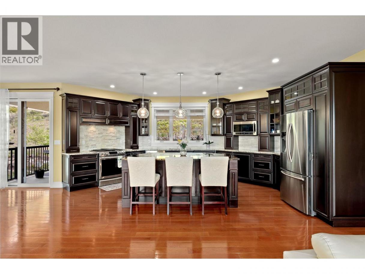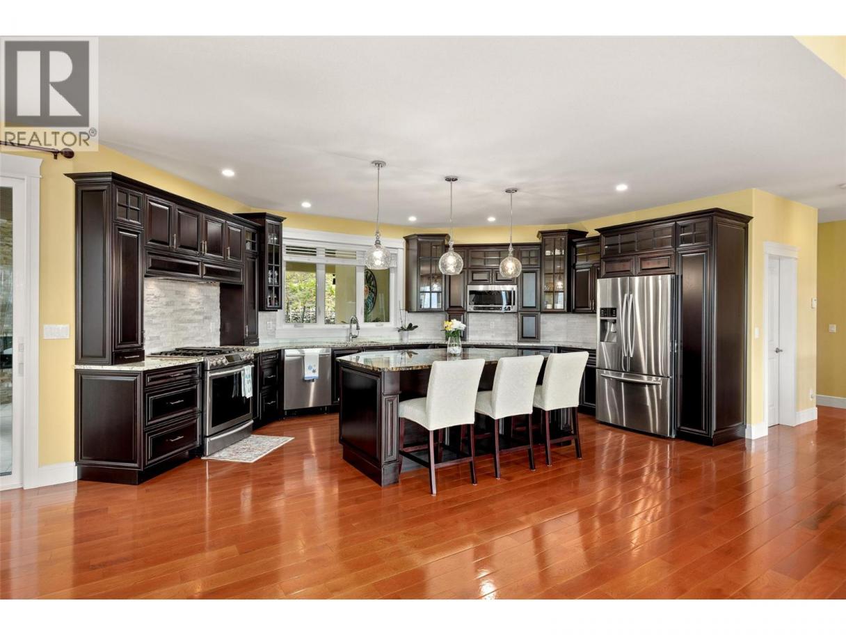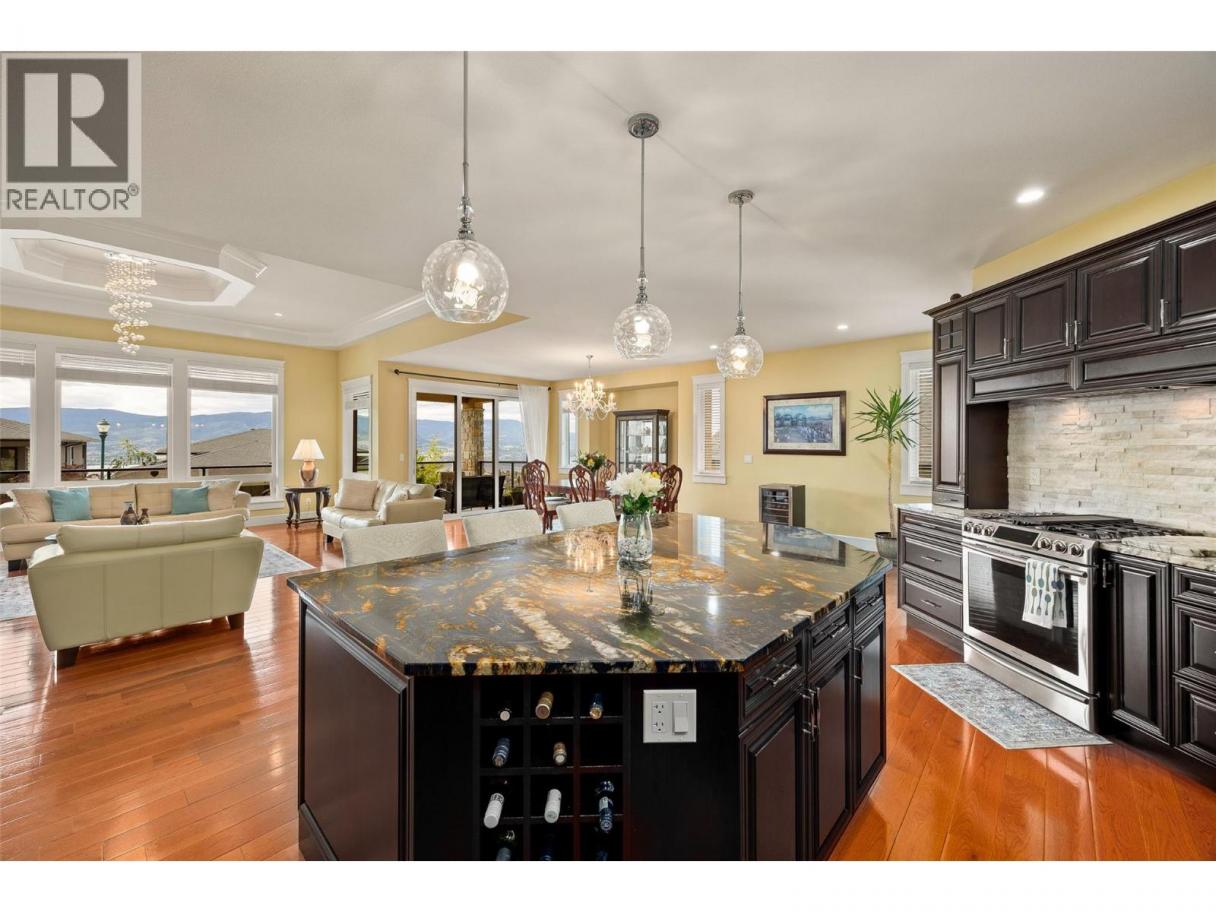 Set in the heart of Kettle Valley, this exceptional 4 bed + den / 3 bath home boasts 3,800 sqft of beautifully designed living space with stunning lake and valley views. The open floor plan is highlighted by rich cherry wood floors, granite countertops throughout, and a spacious kitchen and living area perfect for entertaining. Enjoy Okanagan sunsets from the front deck or the private balcony off the primary bedroom. The triple-car garage includes a tandem stall for added flexibility, and the versatile den is ideal as a home gym or theatre. Outside, the landscaped and fully fenced backyard features grapevines, strawberries, and tomatoes—with plumbing in place for a future pool. Situated on a quiet, no-thru road, the property offers a peaceful and private setting on a .21-acre lot in the highly desirable neighbourhood near parks, schools, restaurants and more. Want to learn more? Contact our team today to book your private viewing! (id:6769)