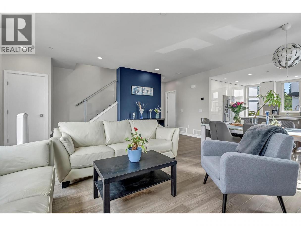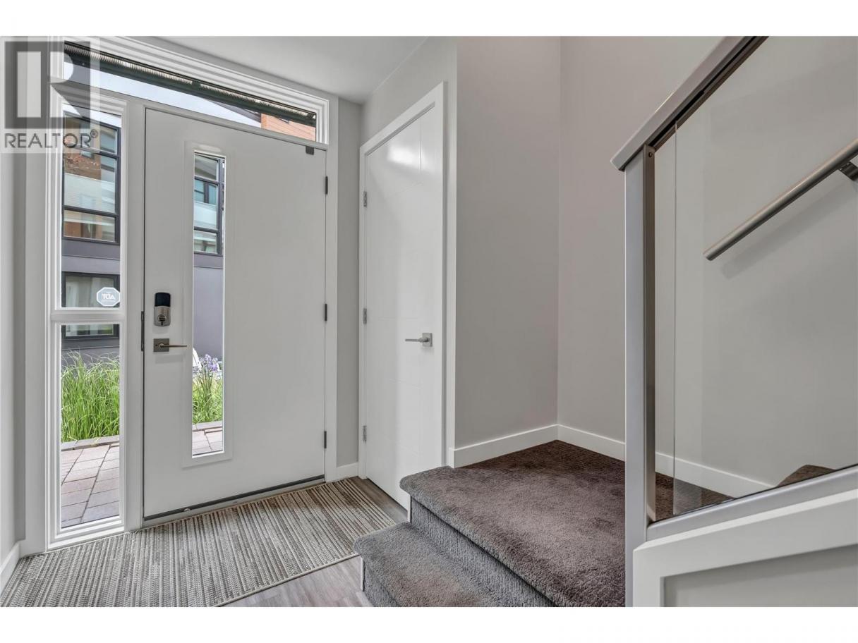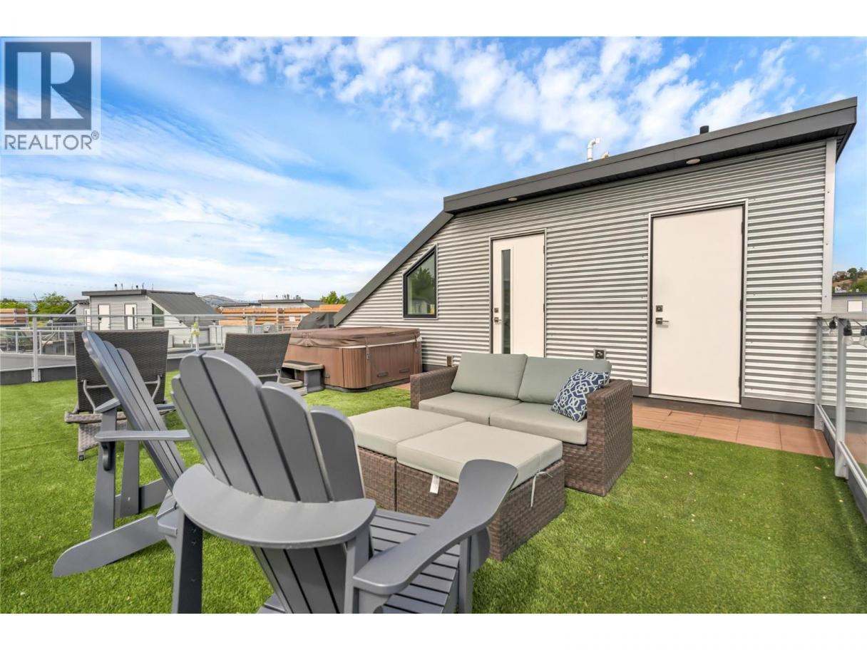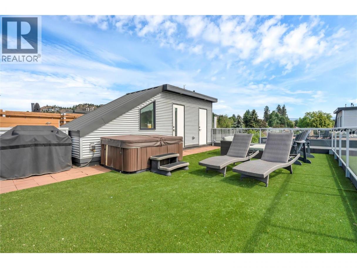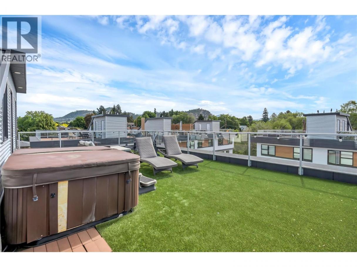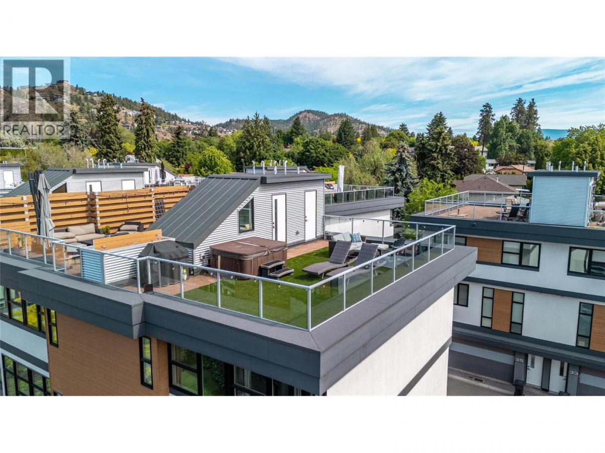 Welcome to Skyview Terraces, where form and function blend perfectly with upscale design and finishings, away from the hustle and bustle of downtown, but conveniently located within a short bike ride to all that downtown Kelowna has to offer. This end unit is located within a quiet location in the complex, near to visitor parking, and has an array of extra windows for added natural light. From the front door you are welcomed to a warm and inviting foyer, with access to the ground level bedroom/office and double car garage. Up from here you will find the inside entertainment level, with designer two tone kitchen including gas stove, cabinet space galore, light and bright living space, and the guest bath/laundry room, complete with newer Samsung washer and dryer. On the next floor are three well sized bedrooms, including the primary with 4 piece ensuite including heated floors and heated towel rack. The upper most level is the real focal point of this entire property, with the roof top deck, including synthetic lawn, a hot tub, and natural gas bib for your bbq; this is the space to soak in the sun and entertain your friends and family on a golden Kelowna summer night. The strata allows 1 dog or 1 cat and a minimum 3 month rental. Heating and cooling is through Geothermal, and there is newly installed hot water on demand unit. (id:6769)