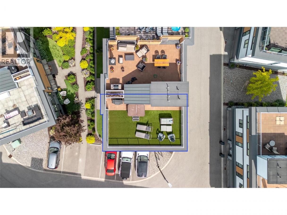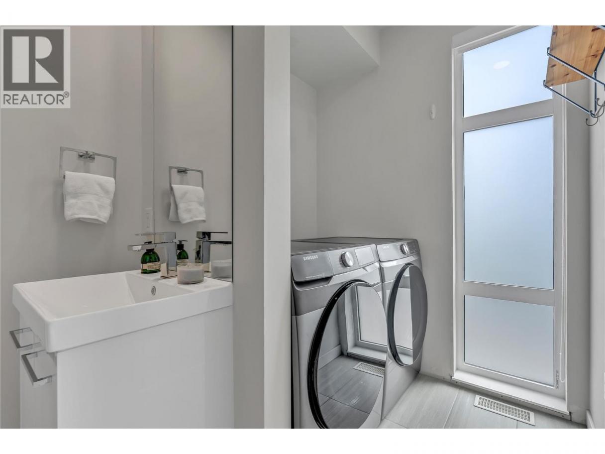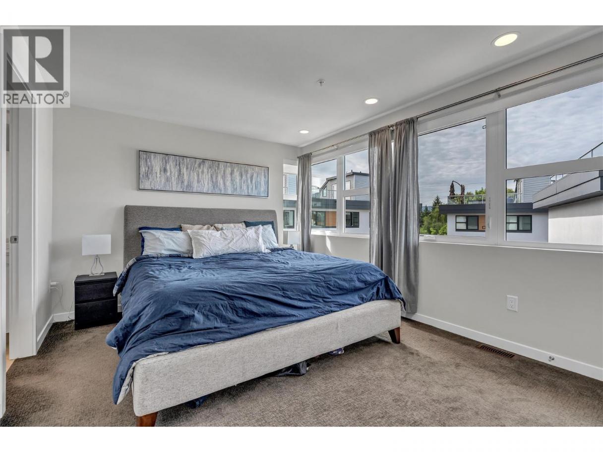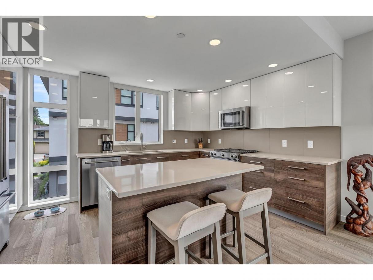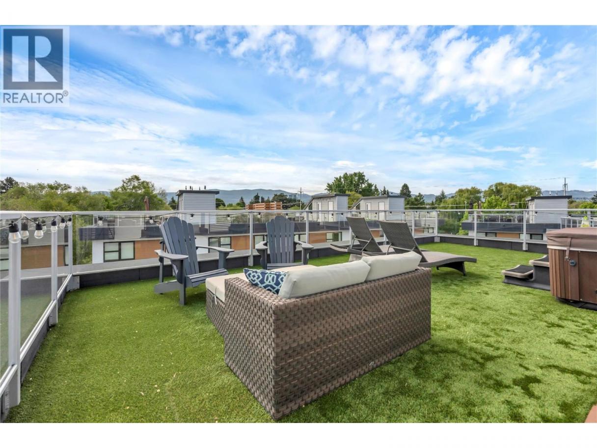 Welcome to Skyview Terraces, where form and function blend perfectly with upscale design and finishings, away from the hustle and bustle of downtown, but conveniently located within a short bike ride to all that downtown Kelowna has to offer. This end unit is located within a quiet location in the complex, near to visitor parking, and has an array of extra windows for added natural light. From the front door you are welcomed to a warm and inviting foyer, with access to the ground level bedroom/office and double car garage. Up from here you will find the inside entertainment level, with designer two tone kitchen including gas stove, cabinet space galore, light and bright living space, and the guest bath/laundry room, complete with newer Samsung washer and dryer. On the next floor are three well sized bedrooms, including the primary with 4 piece ensuite including heated floors and heated towel rack. The upper most level is the real focal point of this entire property, with the roof top deck, including synthetic lawn, a hot tub, and natural gas bib for your bbq; this is the space to soak in the sun and entertain your friends and family on a golden Kelowna summer night. The strata allows 1 dog or 1 cat and a minimum 3 month rental. Heating and cooling is through Geothermal, and there is newly installed hot water on demand unit. (id:6769)