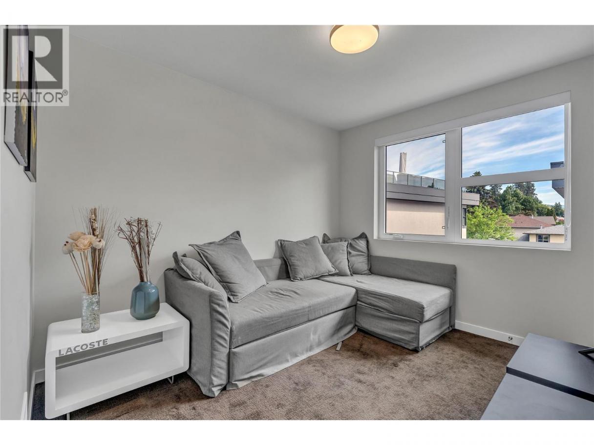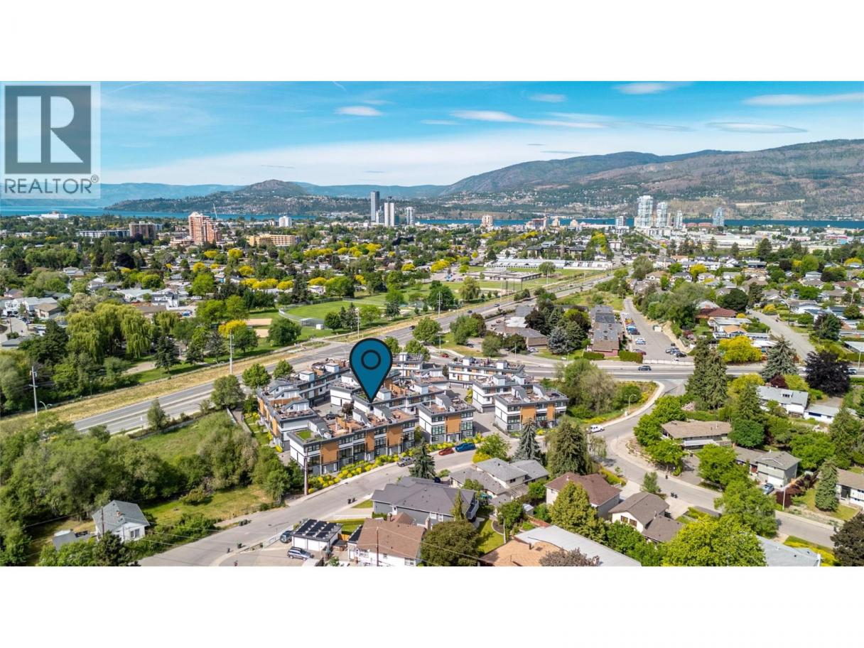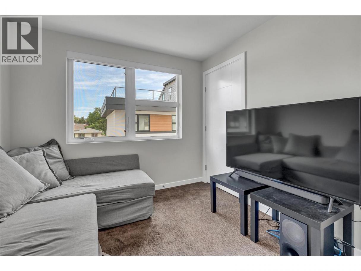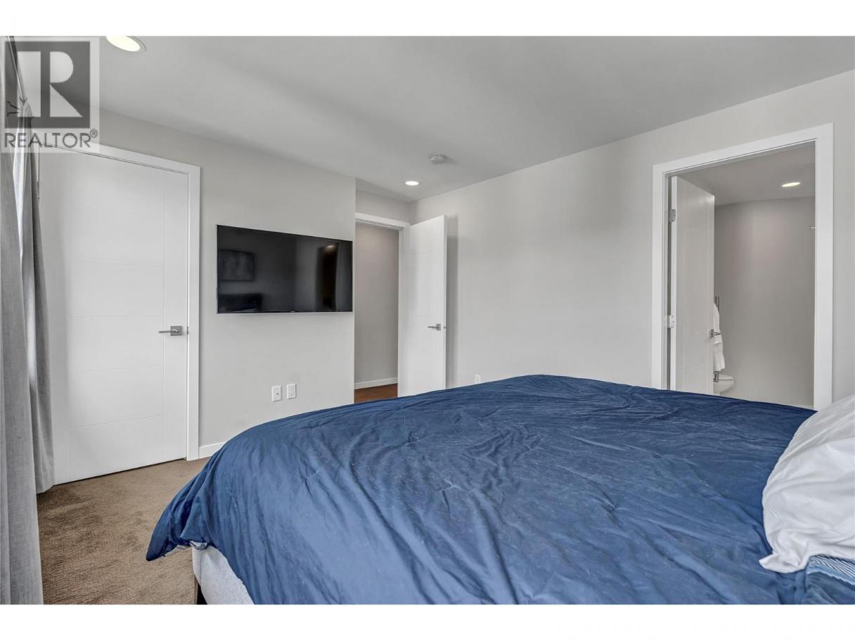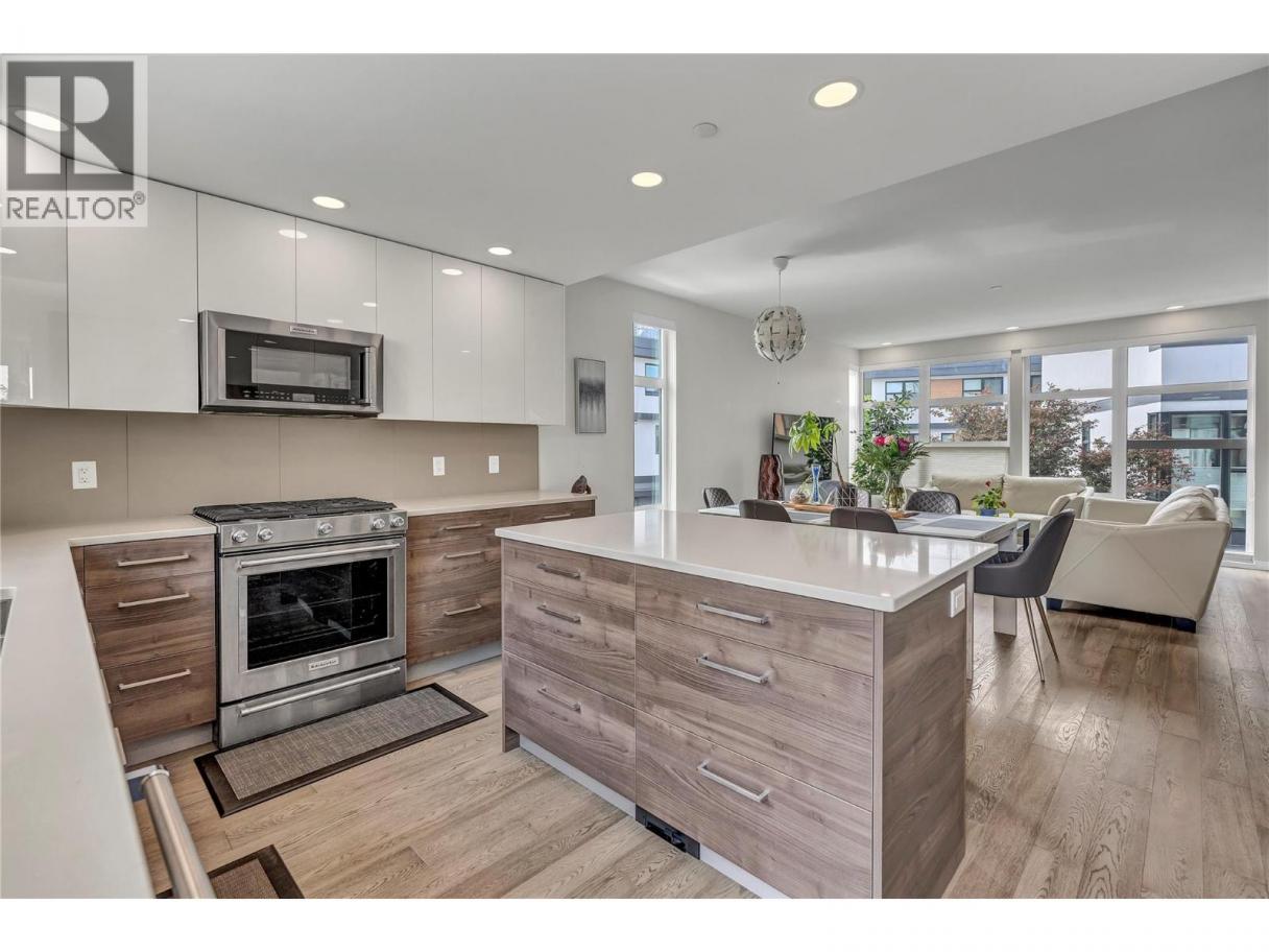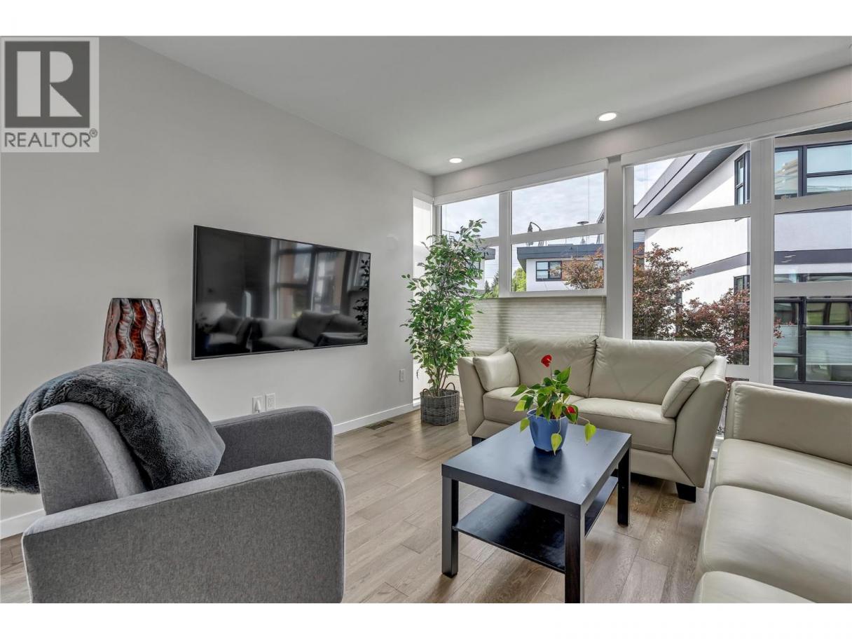 Welcome to Skyview Terraces, where form and function blend perfectly with upscale design and finishings, away from the hustle and bustle of downtown, but conveniently located within a short bike ride to all that downtown Kelowna has to offer. This end unit is located within a quiet location in the complex, near to visitor parking, and has an array of extra windows for added natural light. From the front door you are welcomed to a warm and inviting foyer, with access to the ground level bedroom/office and double car garage. Up from here you will find the inside entertainment level, with designer two tone kitchen including gas stove, cabinet space galore, light and bright living space, and the guest bath/laundry room, complete with newer Samsung washer and dryer. On the next floor are three well sized bedrooms, including the primary with 4 piece ensuite including heated floors and heated towel rack. The upper most level is the real focal point of this entire property, with the roof top deck, including synthetic lawn, a hot tub, and natural gas bib for your bbq; this is the space to soak in the sun and entertain your friends and family on a golden Kelowna summer night. The strata allows 1 dog or 1 cat and a minimum 3 month rental. Heating and cooling is through Geothermal, and there is newly installed hot water on demand unit. (id:6769)