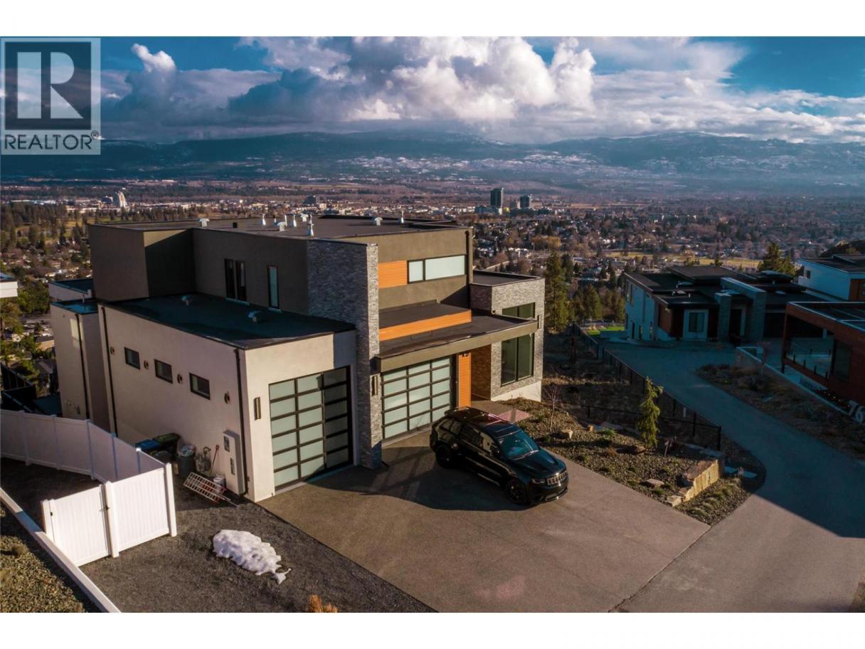 Perched high on the coveted cliffs of Highpointe Terrace, this architectural showpiece captures the essence of luxury living. Every detail reflects masterful design and craftsmanship, while breathtaking panoramas stretch across lush orchards, the rugged beauty of Dilworth Mountain, and the sparkling waters of Okanagan Lake. Spanning three levels of refined living, this residence offers four spacious bedrooms—three with private ensuites—along with two additional bathrooms. The main floor is designed for both everyday living and unforgettable entertaining, anchored by a dramatic open-concept layout. At the heart of the home, a chef’s kitchen shines with a massive 10-foot island, premium gas range, hidden butler’s pantry, Bosch stainless steel appliances, and the crown jewel: a Sub-Zero fridge/freezer combo. The lower level transforms into an entertainment retreat, complete with a sleek wet bar, pool table area, fully soundproofed theater, a striking wine feature wall, and a private gym. Outdoors, the lifestyle continues with a temperature-controlled pool and soothing hot tub—both perfectly positioned to capture sweeping valley views. Practicality meets prestige with a four-car garage and ample on-site RV parking, making this estate as functional as it is extraordinary. A true one-of-a-kind offering, this Highpointe residence redefines refined living in the Okanagan. (id:6769)