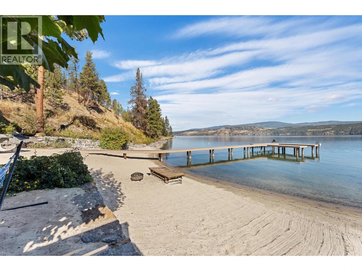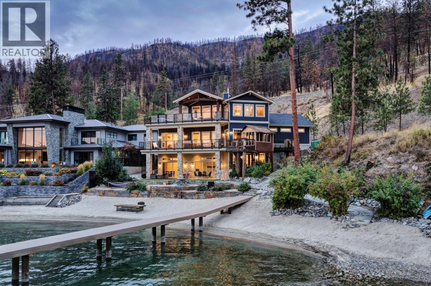 Experience one of the Okanagan’s most desirable waterfront settings with a serene, sandy bay, 120 ft. of pristine shoreline and some of the best sand in the valley, both on shore and beneath the water. This exquisite, turn-key home captures the essence of lakeside luxury, offering panoramic views, timeless architecture, and a relaxed sophisticated style throughout. Inside, the open-concept main level showcases soaring vaulted ceilings, exposed beams, and a stunning limestone fireplace that anchors the great room. The gourmet kitchen features granite countertops, a large central island with seating for six, and premium KitchenAid appliances, flowing seamlessly to the dining area and lakeview deck. A secondary primary suite on this level includes a spa-inspired ensuite and walkout access to the covered patio. Upstairs, the primary retreat impresses with vaulted ceilings, a private deck, a freestanding tub framed by lake views, and a spacious walk-in closet. The family room and wet bar extend to a partially covered terrace with a two-person spa — ideal for sunset evenings. The lower level is designed for entertaining, featuring a theatre with leather recliners, a full kitchenette, and walk-out access to multiple tiered patios that lead to the beach, new private dock, and charming treehouse lounge. Complete with solar panels, two-car garage with expoxy finish, and resort-style outdoor spaces, this residence defines refined Okanagan lakefront living. (id:6769)