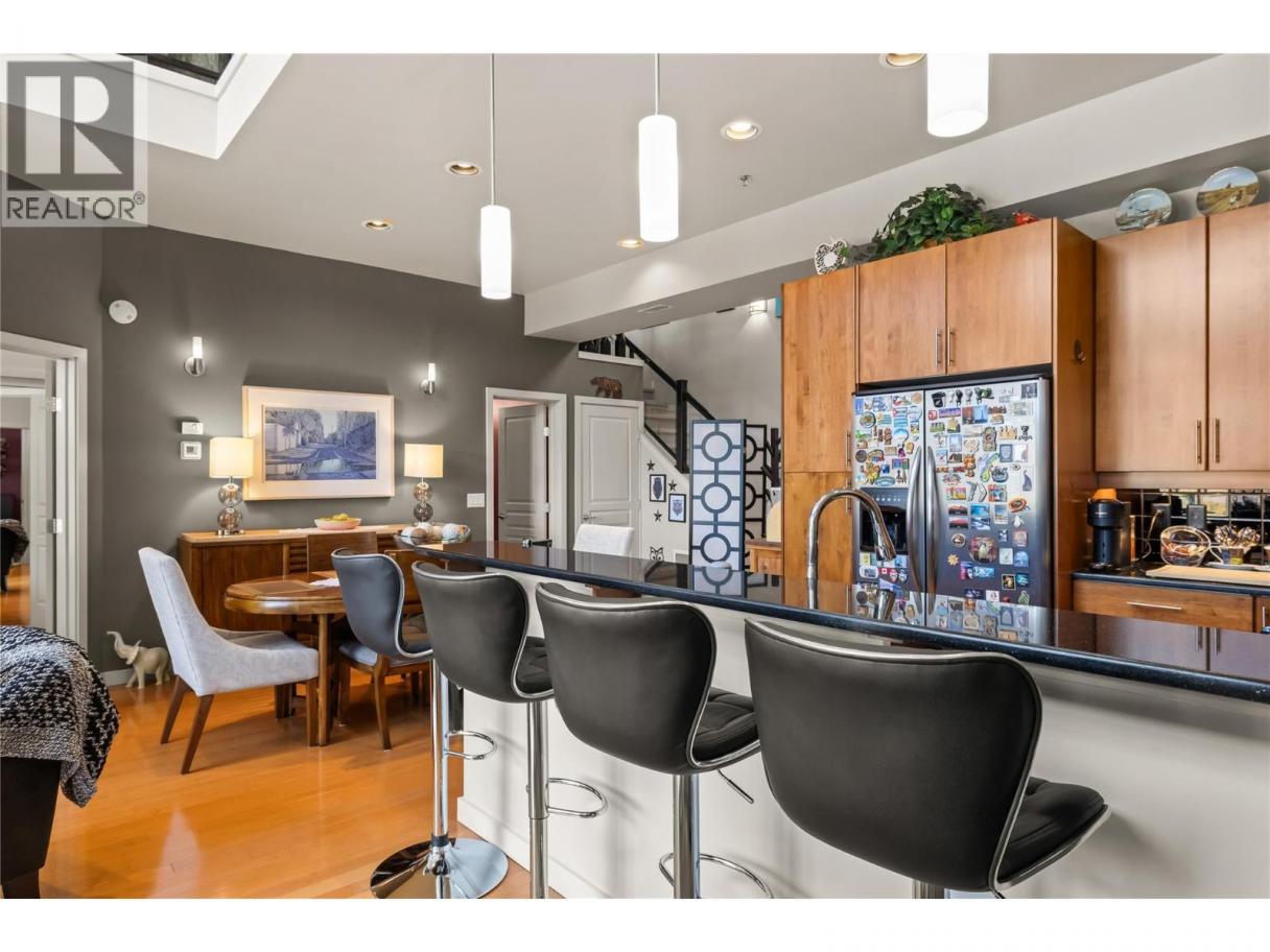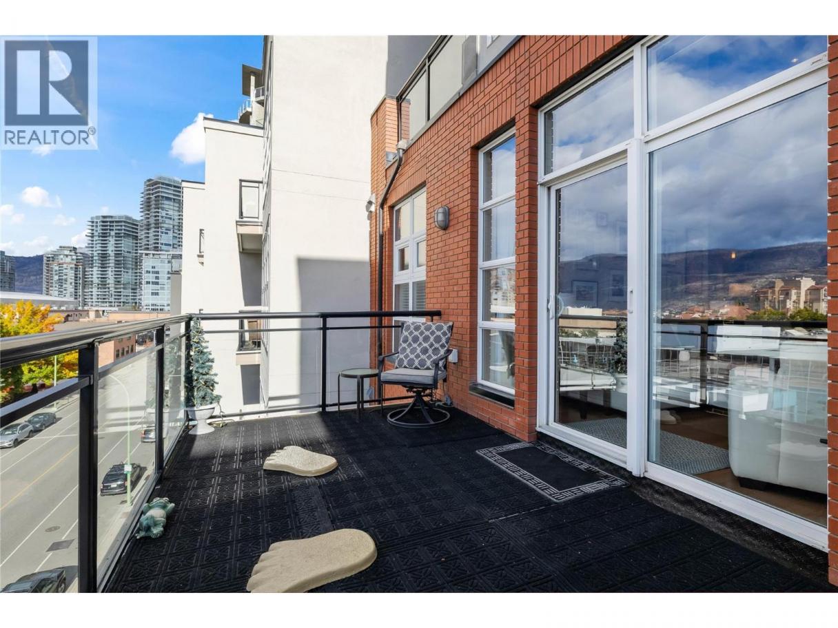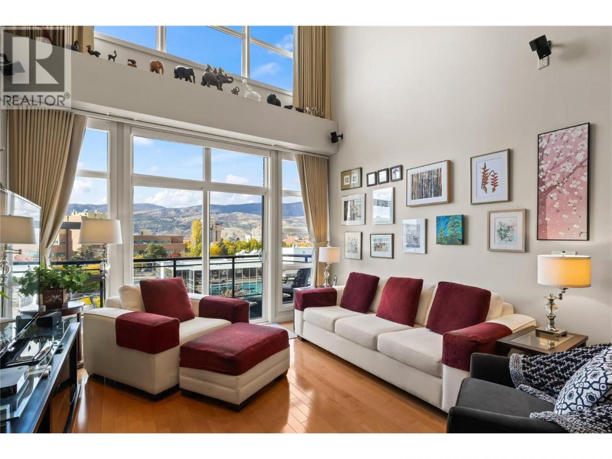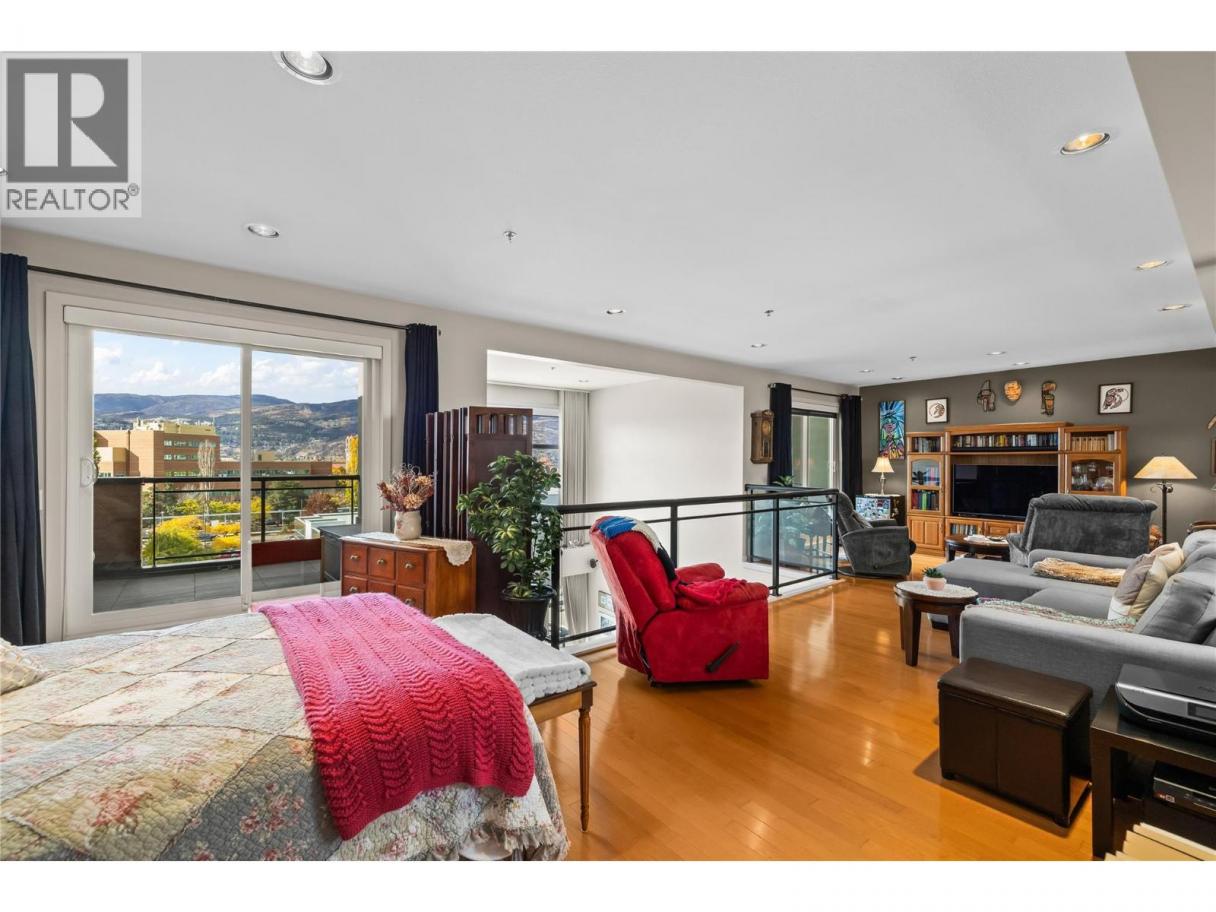 Downtown Kelowna Loft Living at Its Best — Nearly 2,000 Sq Ft of Bright, Stylish Space. A truly unique and rare offering in the heart of downtown Kelowna — welcome to Ellis Court. This exceptional home combines urban sophistication with spacious comfort, featuring soaring 20-foot ceilings, beautiful hardwood floors throughout, and expansive west-facing windows that fill the space with natural light and Okanagan Lake within sight. The main floor offers two generous bedrooms and two full baths, including a luxurious 5-piece primary ensuite and a 3-piece cheater ensuite for guests. A large uncovered balcony off the living area provides the perfect spot to take in the downtown sights and sounds. Upstairs, the massive loft offers flexible space for a third bedroom or media lounge, and an additional space for a home office, complete with its own 3-piece bath and two private balconies, ideal for enjoying quiet morning coffee or evening sunsets. Modern upgrades bring peace of mind, including: New furnace & A/C (2021), Washer & dryer (2021), Hot water tank (2017), Motorized blackout curtains in living room & loft (2024), New sliding patio doors (2020) and balcony flooring (2020). Ellis Court is pet-friendly (with restrictions) and includes 1 parking stall and 1 storage locker. Step outside your door to Prospera Place, Kelowna Community Theatre, the YMCA, local breweries, restaurants, and shops — all just minutes from the lake and beaches. This is downtown living without compromise. (id:6769)