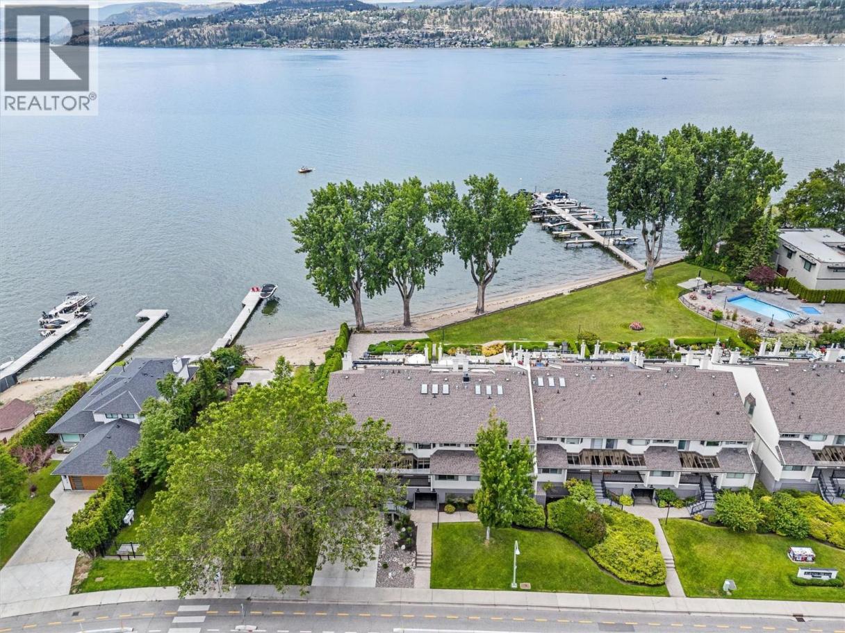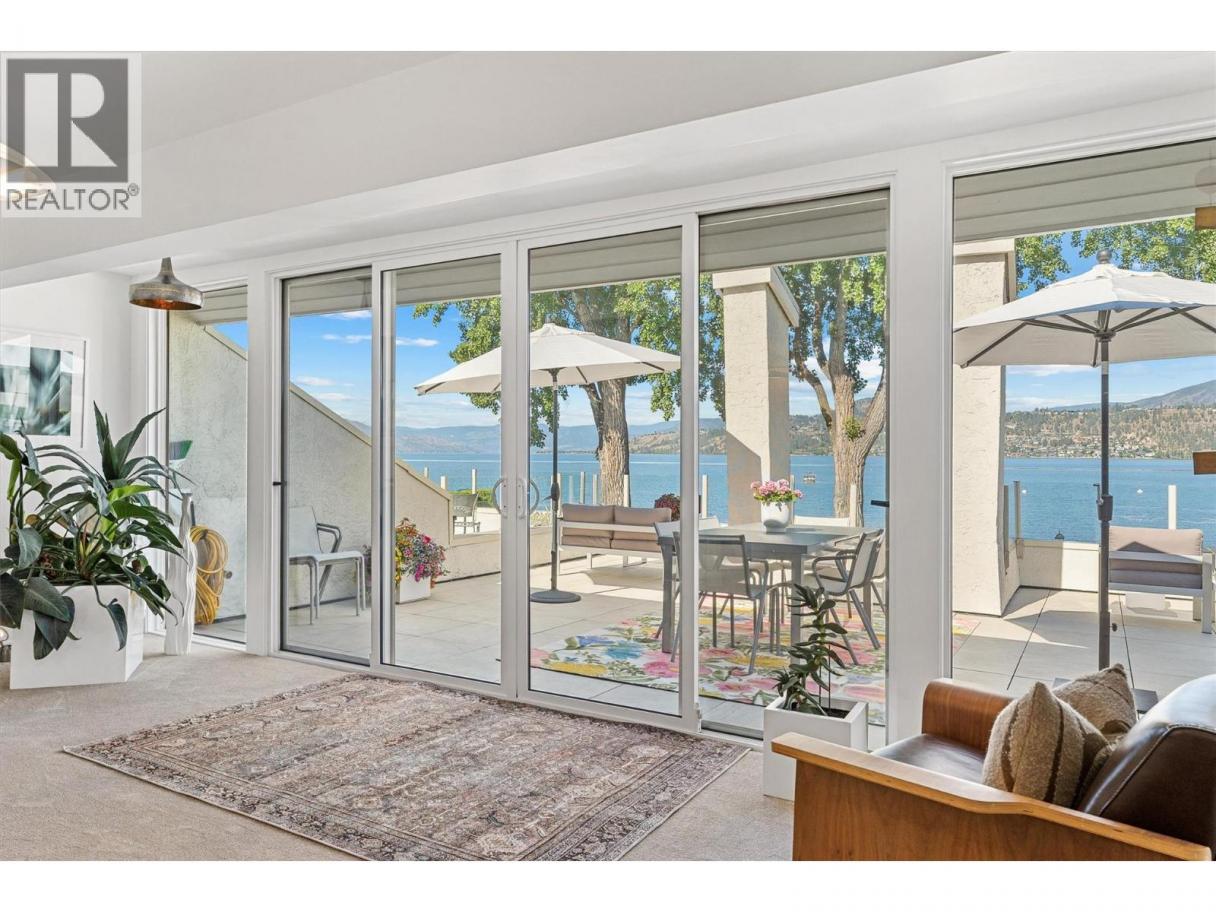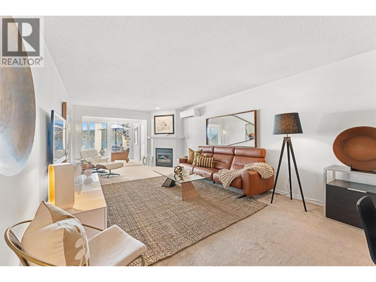 This beautifully maintained waterfront residence offers bright, spacious one-level living in one of Kelowna’s most sought-after communities. Featuring two generous bedrooms and two bathrooms, the home includes a modern maple kitchen with an eating peninsula and adjacent dining area, perfect for entertaining. The living room, complete with a cozy gas fireplace, opens into a sun-drenched flex space through new floor-to-ceiling glass doors, leading to a fully refurbished lakefront patio. The expansive primary bedroom features a walk-through closet and a luxurious 5-piece ensuite with a glass shower and soaking tub. Additional highlights include updated LED recessed lighting, remote-controlled foyer lighting, blackout blinds in the front bedroom, new ceilings in the primary suite, refreshed paint and hardware, a split-unit heater and A/C in the living room, a newer LG slide-in range, and a large in-suite storage closet. The newly renovated laundry room adds to the home’s convenience. Building enhancements include a rubberized entry staircase and landings, fresh exterior paint, and updated front landscaping. Residents enjoy access to a concrete pool and newly tiled hot tub, along with secure underground parking—stall #28 included. Centrally located and within walking distance to amenities, this move-in-ready home blends modern comfort with timeless lakeside charm. (id:6769)