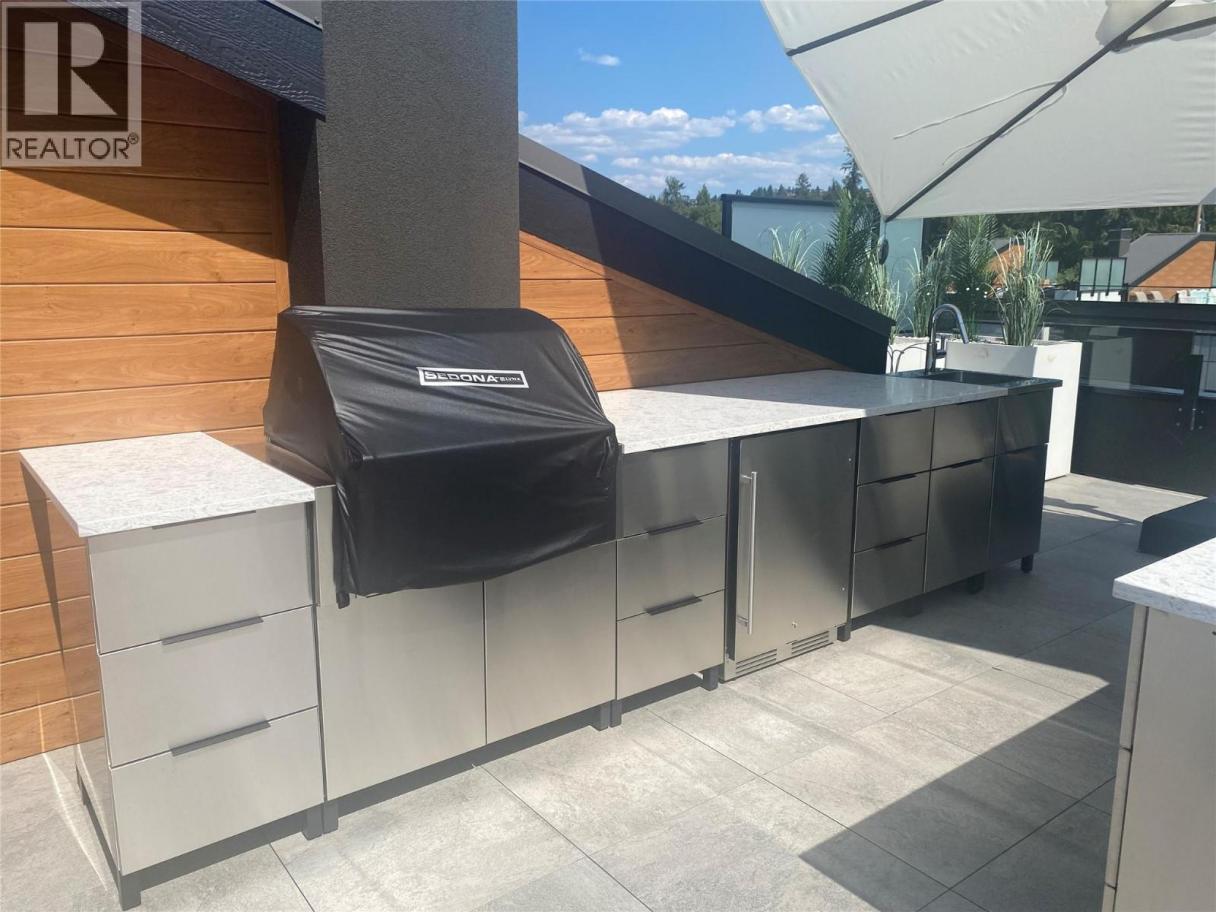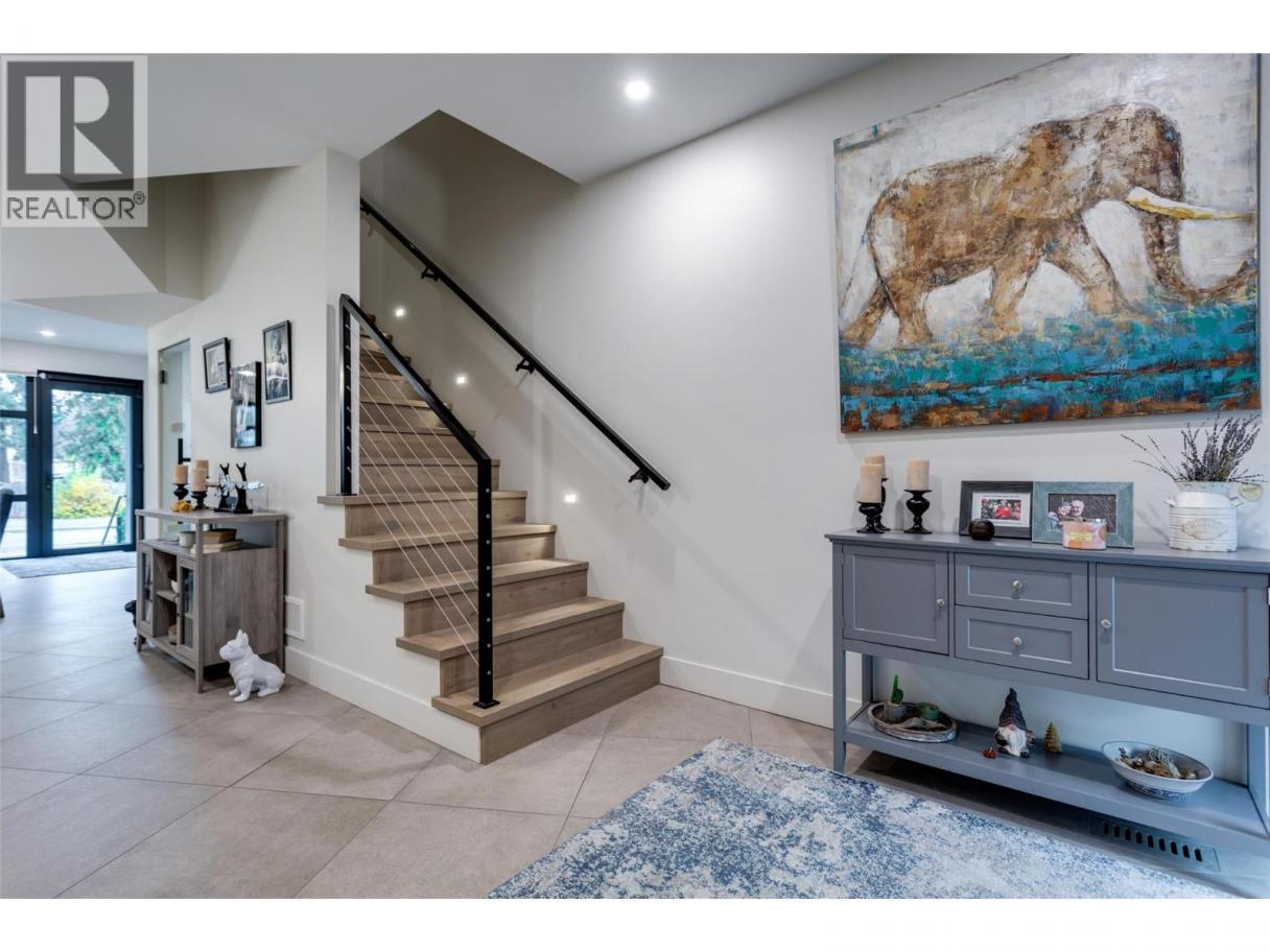Live the Lower Mission lifestyle in this luxury end-unit townhome—an elegant blend of design, comfort, and location. Just steps to beaches, wineries, highly regarded schools, groceries, and vibrant restaurants, it’s perfectly placed for daily convenience and Okanagan play. Inside, a bright open-concept main level with 9-ft ceilings centers on a chef-inspired kitchen with Bosch appliances; wall oven, cabinet-panel fridge/freezer, quartz counters, waterfall island, wine cooler, and floor-to-ceiling cabinetry, plus a wine cellar & bar. The main floor adds partially heated tile flooring, a striking clay fireplace, custom built-ins, and modern cable-rail stairs. A dedicated office complements 3 spacious bedrooms and 3 bathrooms. Upstairs, the primary suite pampers with a spa-style 5-piece ensuite—floating double vanity, soaker tub, custom tiled shower, heated tile floors, and backlit mirrors with built-in speakers. Practical perks abound: a generous 4-ft crawl space for storage, double garage with epoxy flooring, double driveway, and a fully furnished 715 sq ft rooftop patio—perfect for entertaining under the Okanagan sun. This home is a rare opportunity to enjoy high-end living in one of Kelowna’s most sought-after neighborhoods. Over $200,000 in upgrades (id:6769)