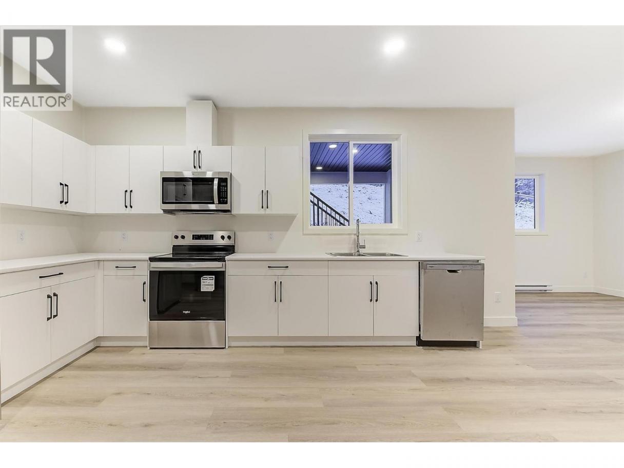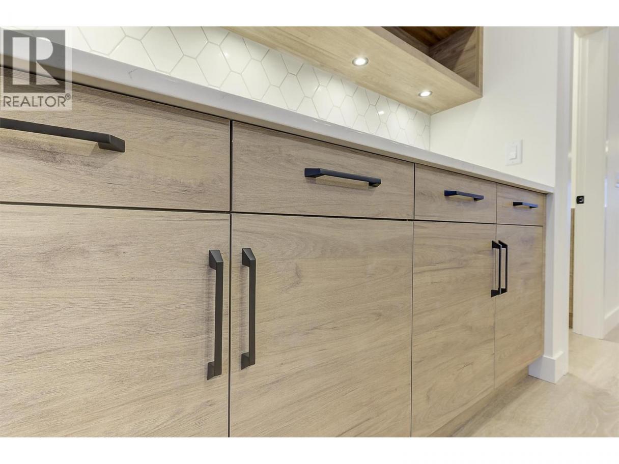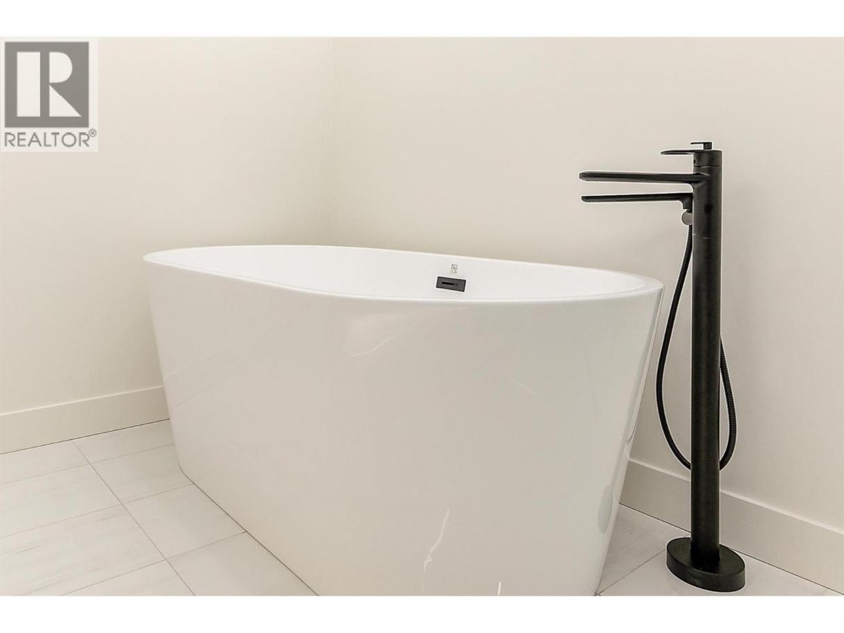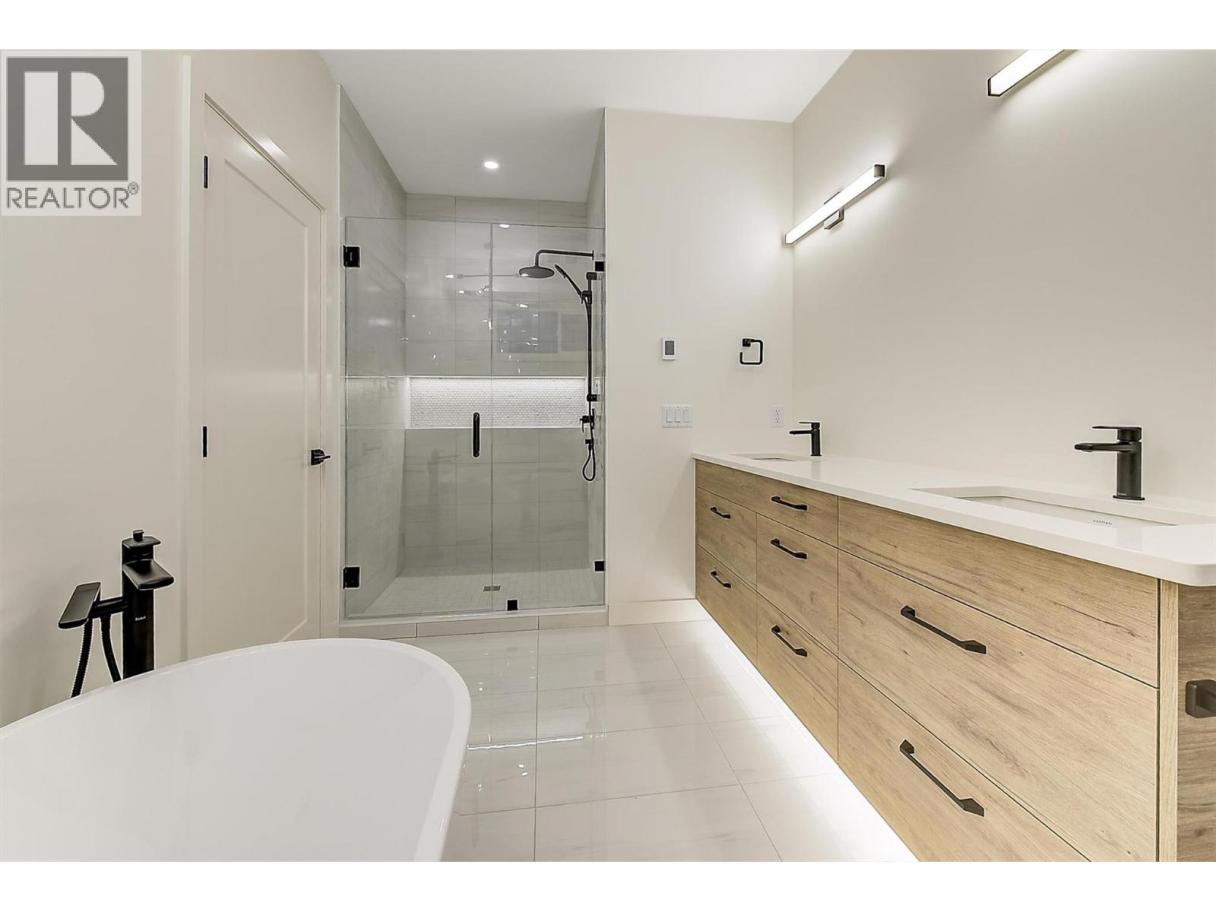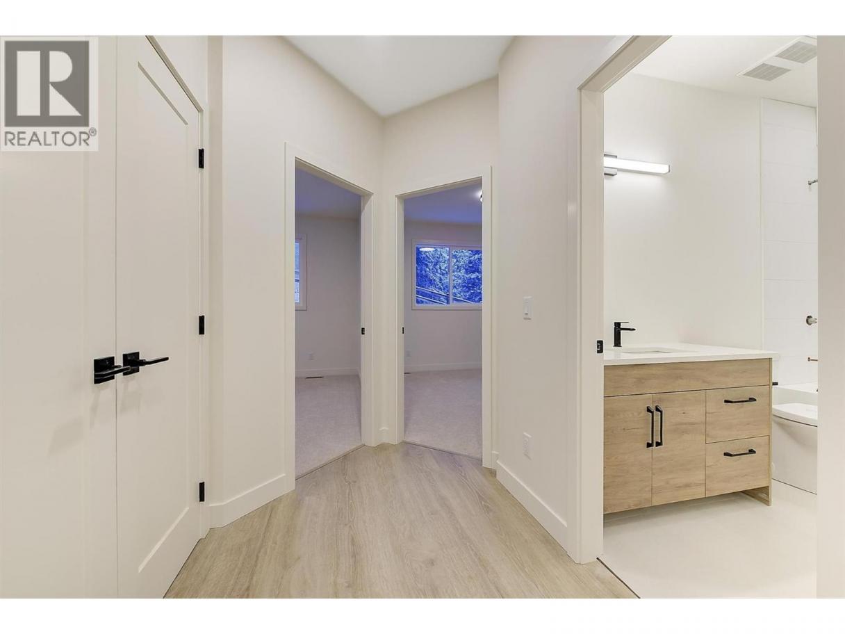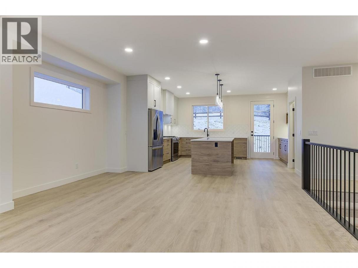 Come experience this quality Knorr Enterprises LTD. home on Kirschner Mountain with mountain & valley views. This stylish home has 5 bedrooms + den & 4 bathrooms. The covered veranda opens to an entryway & ground floor den w ensuite. A bright 2-bedroom Legal Suite w separate laundry, appliances & covered patio. The main floor offers a bright & open living/dining room w linear fireplace, ""tray"" ceiling w custom lighting & large windows/sliding door to take in the views. There is a large covered deck w wood ceiling. The kitchen offers Quartz counters, two-tone cabinets, an oversized island, a butler pantry, plus a kitchen-bar wall area + stainless appliances & gas range & a second covered deck w gas line. 2 carpeted bedrooms, linen closet & 4-piece main bathroom, a full laundry room w cupboards & sink on this level. The primary bedroom is bright & open w large windows for the views. A windowed walk-in closet & a 5-piece ensuite w custom tiled shower, heated floors, double vanity sink, quartz counter & stand-alone tub make up the primary oasis. The home offers an oversized double garage complete w utility room. The EV charger & central vacuum are both roughed-in. The home comes w Hardie board & brick exterior, landscaping, quality laminate floors throughout & carpet in the main home bedrooms & stairs. Hot water on demand, 200 amps CATT 5, lots of storage. Backs onto a park & is close to Black Mountain Elementary & BM Golf Course. Price +GST. Make this beautiful house your home. (id:6769)