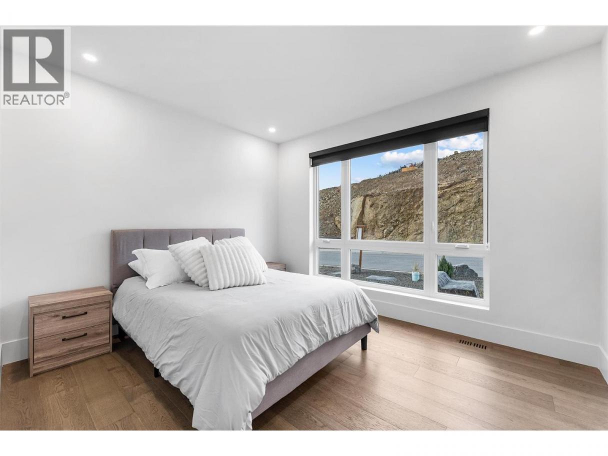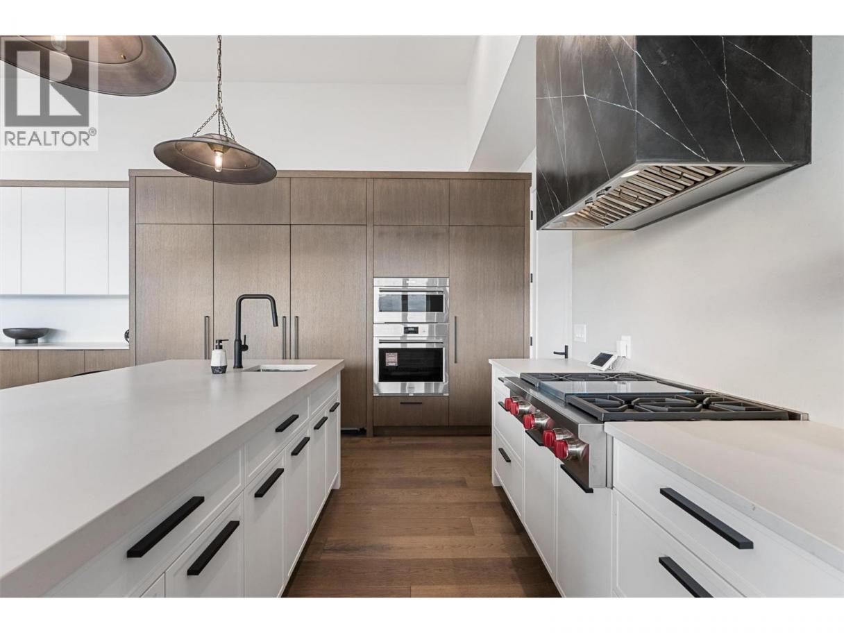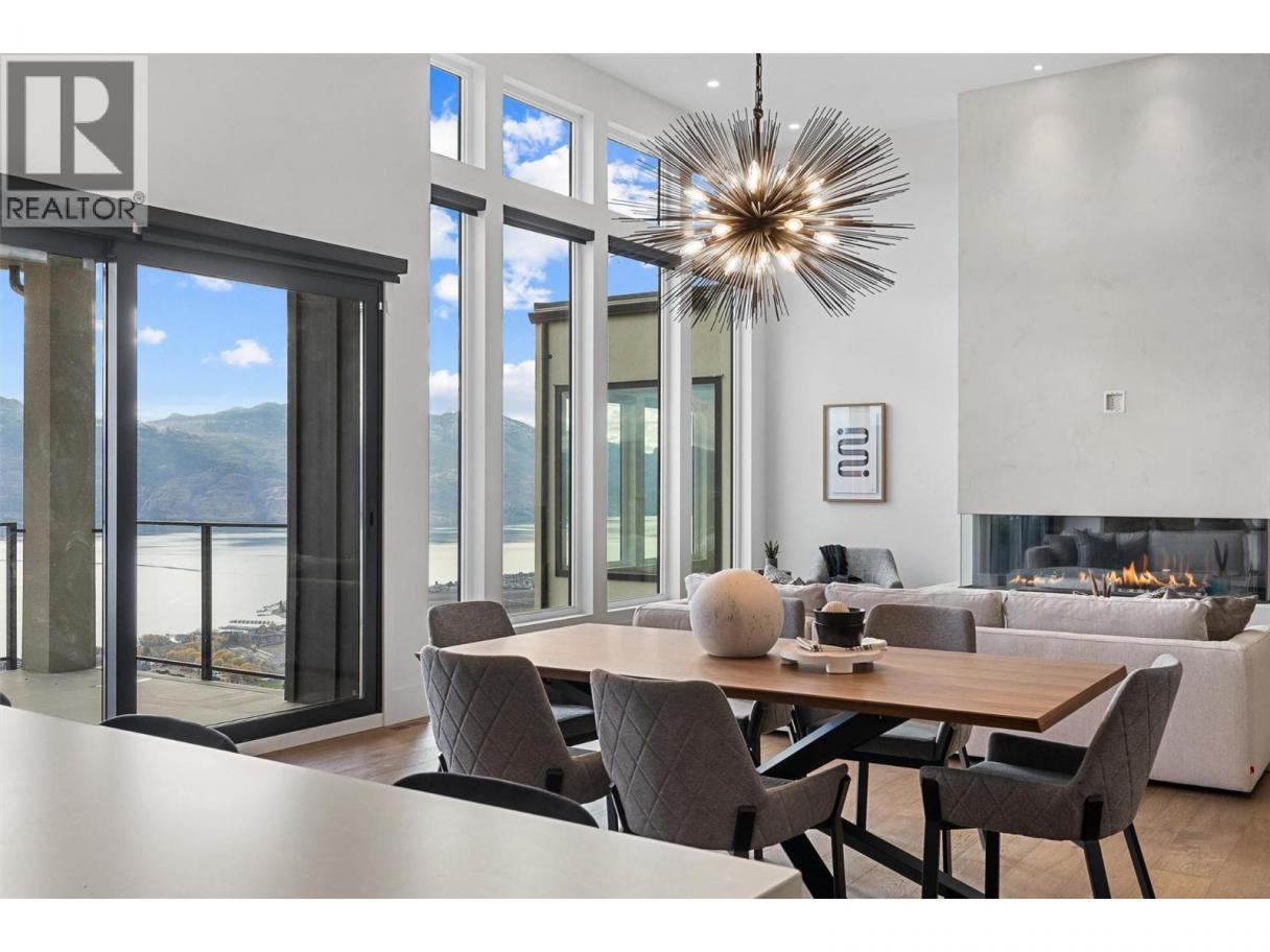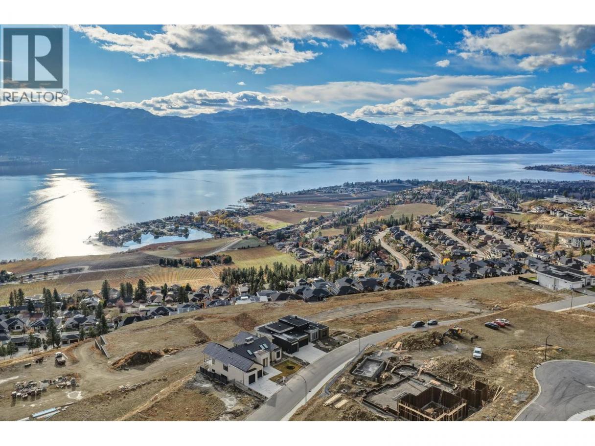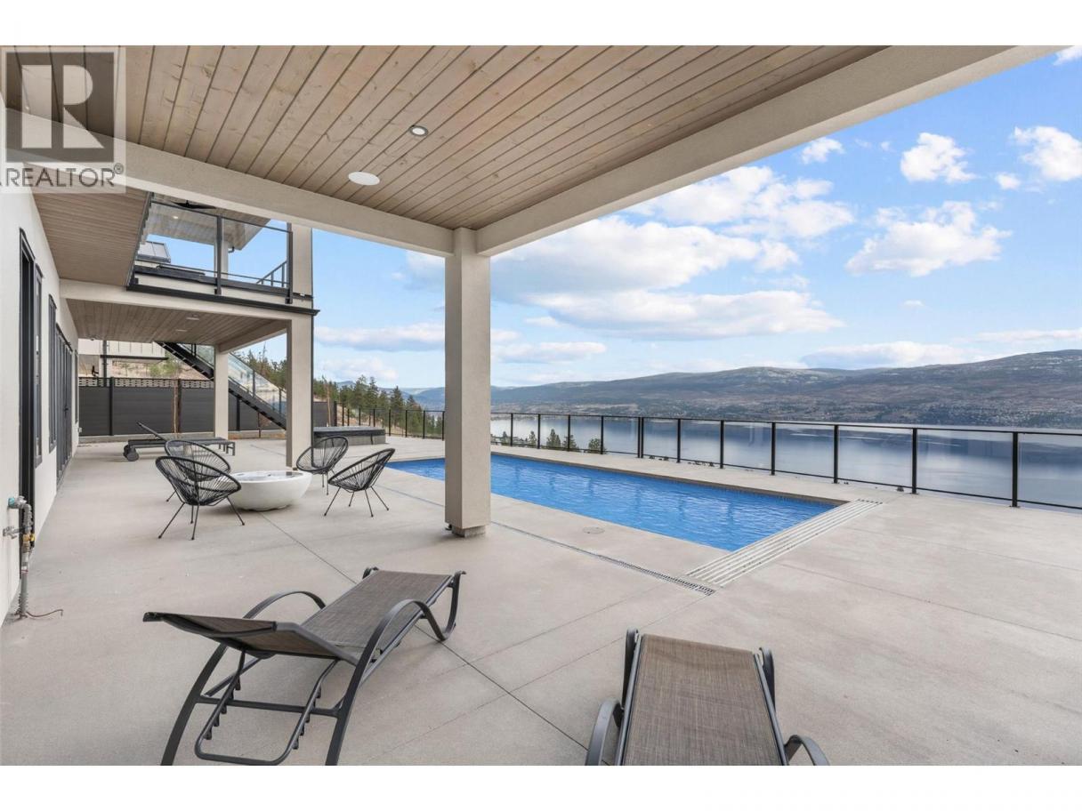 Perched in Vineyard Estates with sweeping views of Lake Okanagan and scenic Mission Hill Estate Winery, this modern home blends contemporary design with exceptional craftsmanship. Minutes to beaches, world-class wineries, parks, and the hiking and biking trails of Mount Boucherie, it offers an ideal Okanagan lifestyle. The main level features soaring ceilings, wide-plank hardwood, and floor-to-ceiling windows framing panoramic vistas. A floor-to-ceiling feature fireplace anchors the living area alongside custom built-ins and power blinds. The chef’s kitchen impresses with Caesarstone surfaces, a dramatic backsplash, Wolf + JennAir appliances, a large island, and a fully equipped butler’s pantry. Walkout access to a covered view deck with speakers, wood ceiling inlay, and BBQ hookup. The lakeview primary is a serene retreat with a walk-in closet and a stunning 5-piece ensuite with heated floors, floor-to-ceiling tile, and a dramatic glass wall. A second bedroom with ensuite and an office complete the main level. The lower level is designed for connection with two additional bedrooms (1 has ensuite), a luxe 4-piece bath and a spacious recr room with custom wet bar, wine display, and nano doors opening to a pool deck. Outside, enjoy a sunken hot tub, concrete 14x28 saltwater pool (power-cover ready), and unobstructed glass-railed views. With upgraded lighting, 8-ft doors, abundant storage, and a 3-car garage, this residence delivers refined Okanagan living. (id:6769)