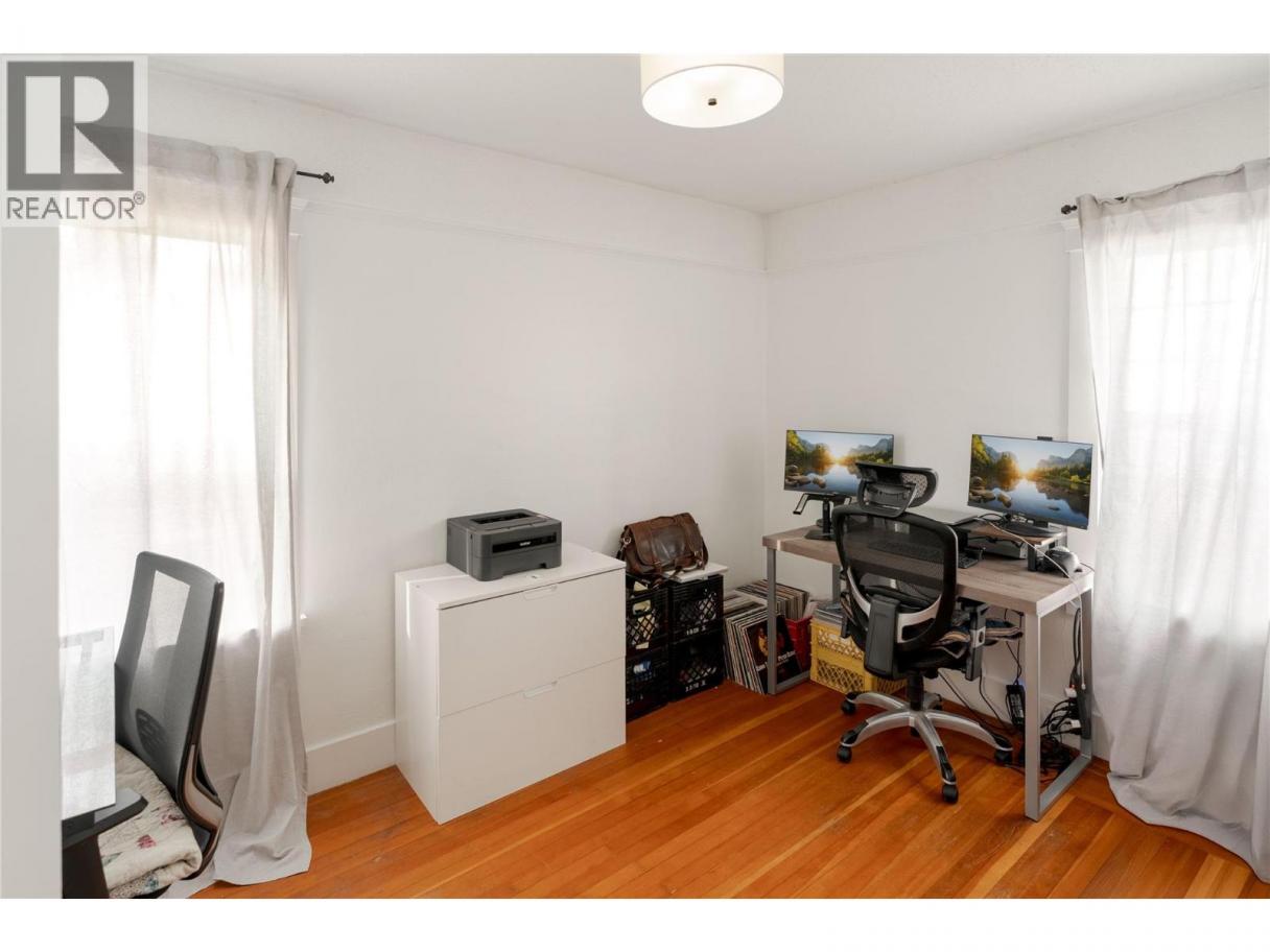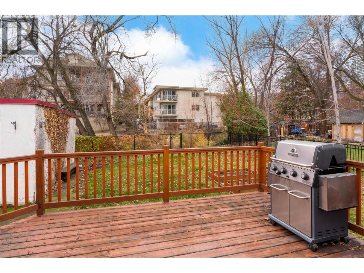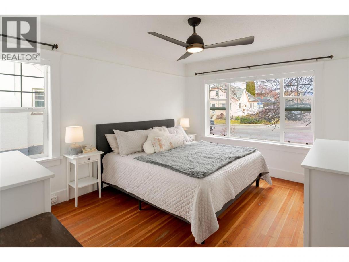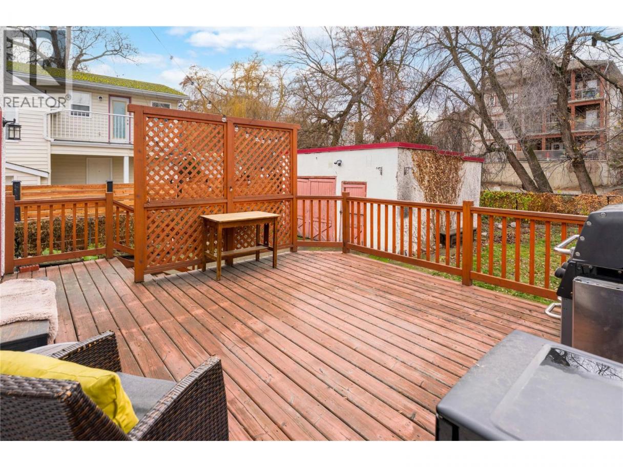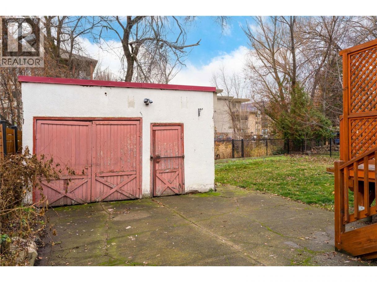 Set along one of Kelowna South’s most admired heritage streets, this Art Deco character home blends timeless appeal with meaningful modern updates. The arched front entry creates an immediate sense of arrival, while classic details throughout reflect the charm of this established neighbourhood. Inside, fir flooring, coved ceilings, fresh paint, and updated light fixtures create a bright and welcoming living space anchored by a gas fireplace. The kitchen features quartz countertops, quality custom cabinetry, subway tile backsplash, black-and-white tile flooring, and an exposed brick feature wall, complemented by a cozy eating nook for everyday living. Two well-proportioned bedrooms are served by a four-piece bathroom with updated vanity and tiled finishes. A rear mudroom and laundry area opens to a large sun deck and fenced backyard, providing a comfortable outdoor extension of the home. A detached single garage and ample additional parking complete the property. Located within walking distance to downtown Kelowna, the lake, beaches, shops, and restaurants, this is a rare opportunity to secure a character home in one of Kelowna South’s most desirable heritage pockets. All windows have been replaced. Estate sale. Property sold “as is.” Probate granted. Quick possession possible. (id:6769)
