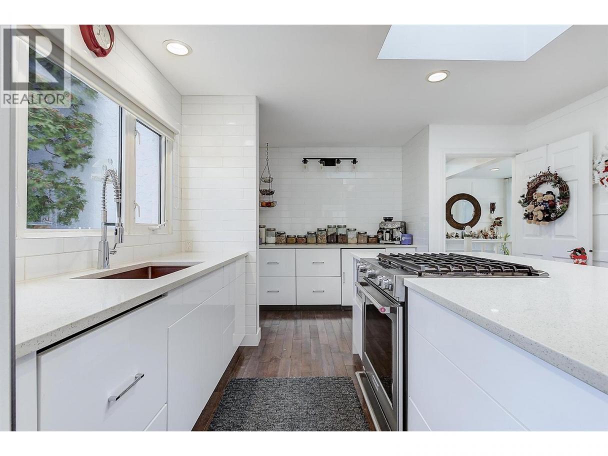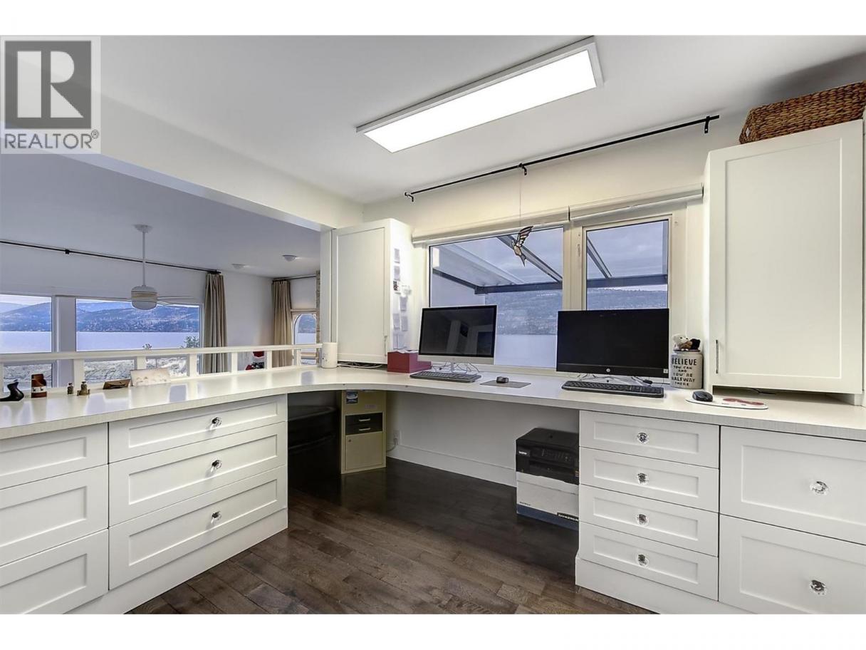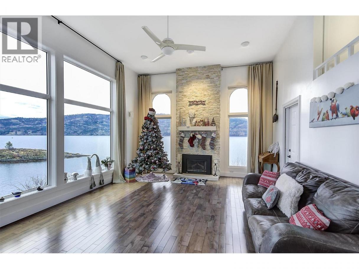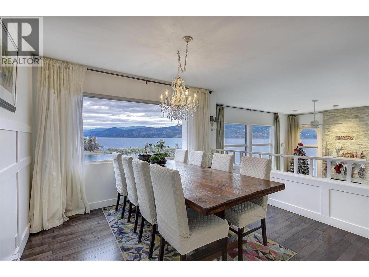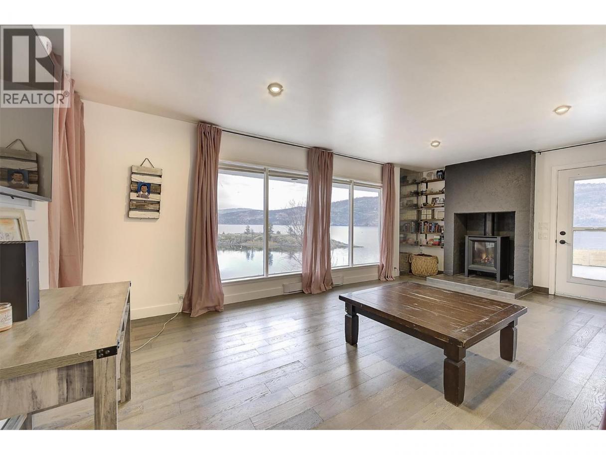A rare opportunity to own an architectural gem on Okanagan Lake. Welcome to 15 Traders Cove Road. This striking home offers over 70 ft of private lake frontage with panoramic, unobstructed views across Traders Cove Regional Park. Thoughtfully renovated, the residence features vaulted ceilings and oversized windows that invite natural light and frame breathtaking views. The modern kitchen includes quartz counters, a gas range, and custom cabinetry. Multiple lake-facing decks create seamless indoor-outdoor living, while well a custom stair well leads to a private dock with deep-water moorage, a lakeside fire pit, and a kayak launch area. The lower-level suite, with its own kitchen and entrance, is perfect for guests, extended family, or a B&B. Surrounded by parkland, the home enjoys exceptional privacy and is alive with wildlife: birds, deer, and more. At the top of the lot, there may be potential to build a detached garage or carriage house, offering even more flexibility for future use (buyer to verify with municipality). Outside the Speculation & Vacancy Tax zone, this turn-key property is ideal as a full-time residence or seasonal getaway. Newly installed solar panels bring down operating costs and are a great compliment to the electric heat. Peaceful Traders Cove is just minutes by car or boat from downtown Kelowna. (id:6769)