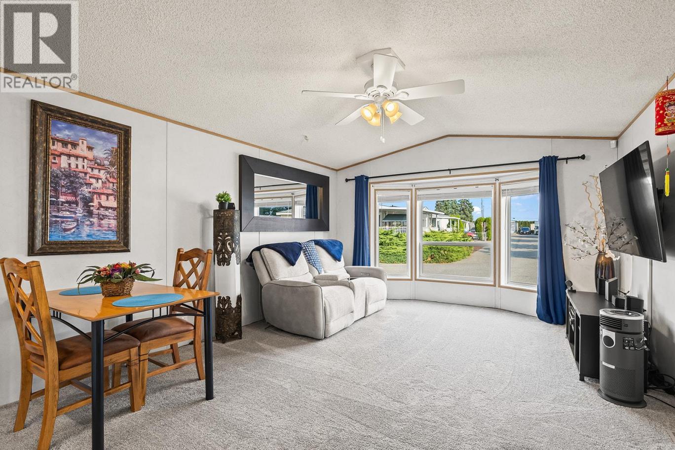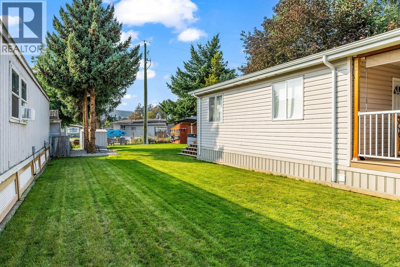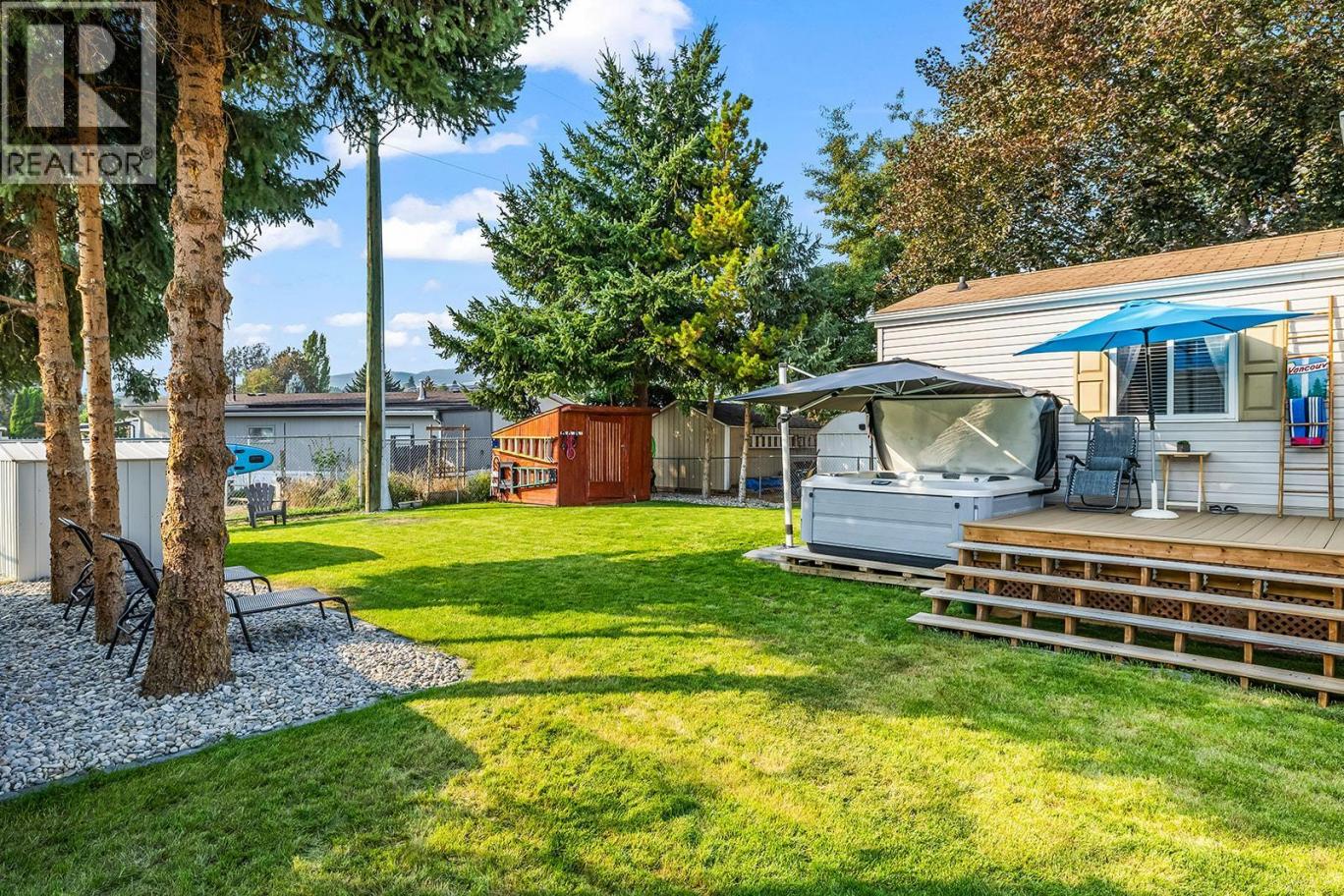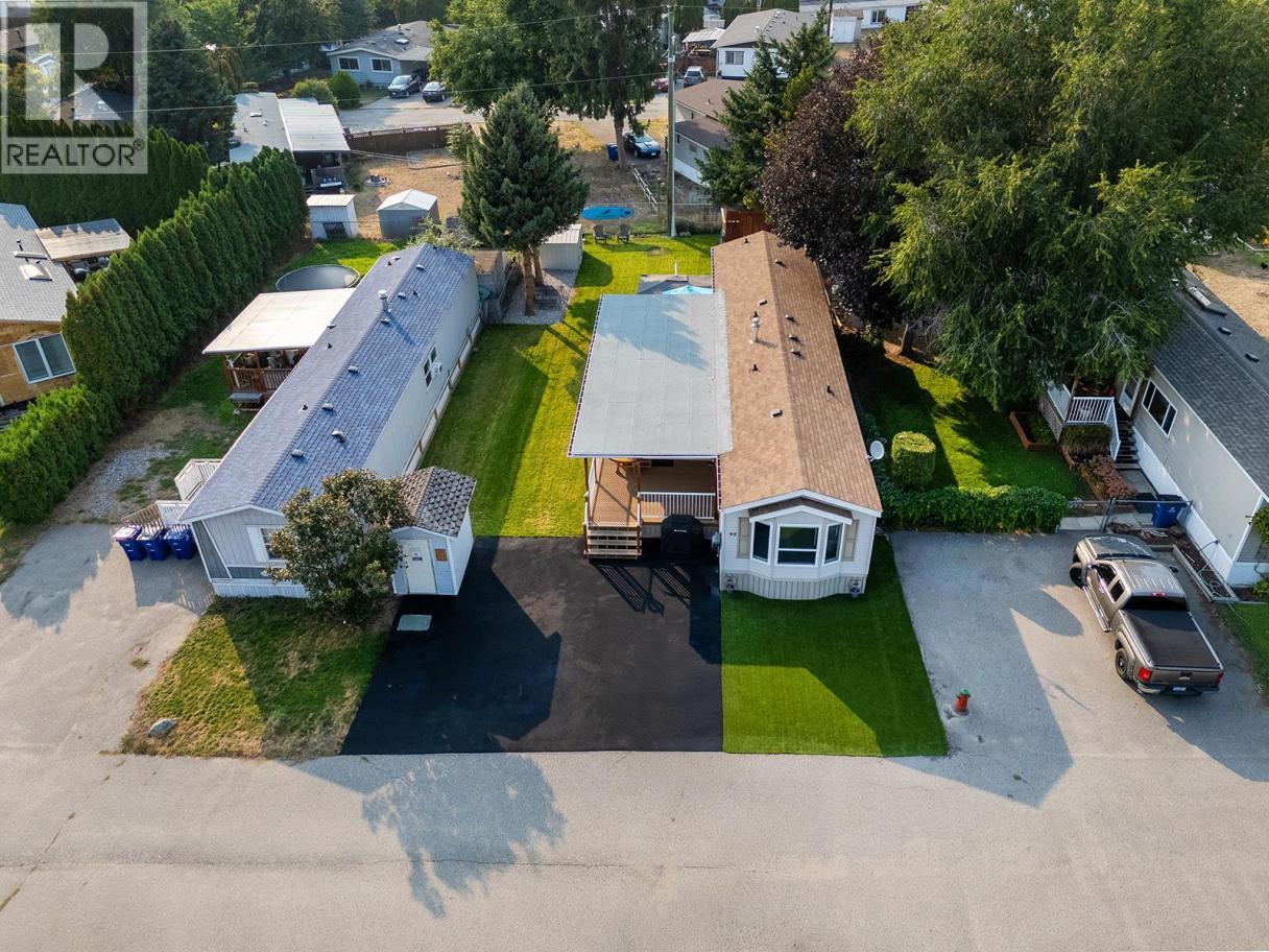 Meticulously maintained home in sought-after Jubilee Park, just a short stroll to the lake and private beach. This bright and inviting residence features 3 bedrooms plus a versatile den—perfect for a home office or flex space. Recent updates include a 4-year-old AC system, newer high-end appliances (fridge, gas stove, dishwasher), ensuring comfort and convenience. The thoughtfully designed layout offers a bright, airy feel with plenty of natural light. Outdoors, enjoy low-maintenance living with synthetic front lawn, an irrigated backyard oasis, and a durable rubberized parking pad with room for two vehicles. Entertain or unwind on the expansive TimberTech deck, soak in the luxury Jacuzzi spa, and take advantage of two storage sheds. All electrical has been inspected and is up to date for added peace of mind. With all homes in the community owner-occupied, Jubilee Park offers a friendly, secure environment—perfect for those seeking a relaxed Okanagan lifestyle. Newer hottub & 2 storage sheds included. FLEXIBLE CLOSING DATE. Park requirements: Minimum 730 credit score, no dogs (cats permitted if neutered and kept indoors). Park approval requires a minimum of 10 business days. (id:6769)