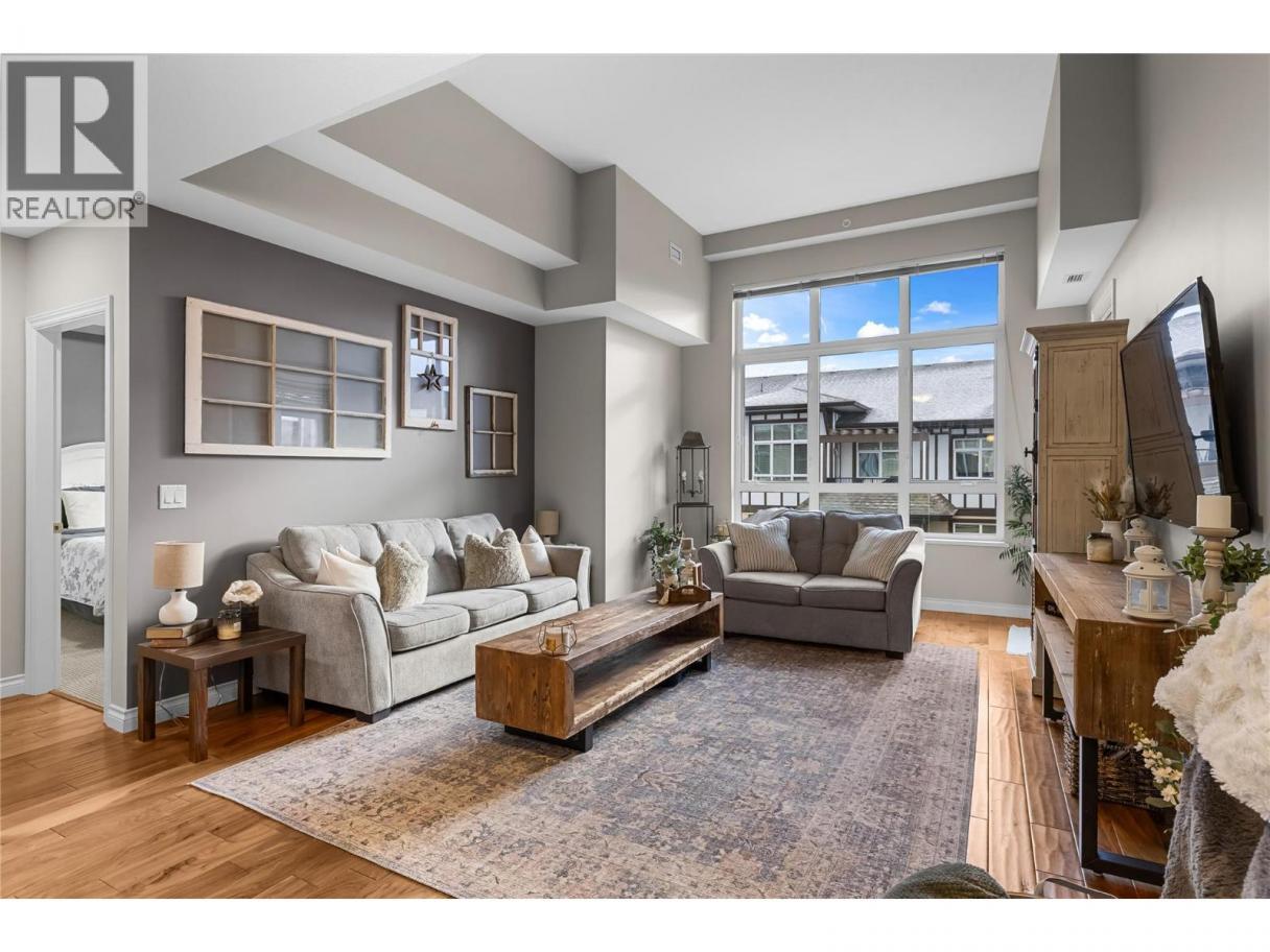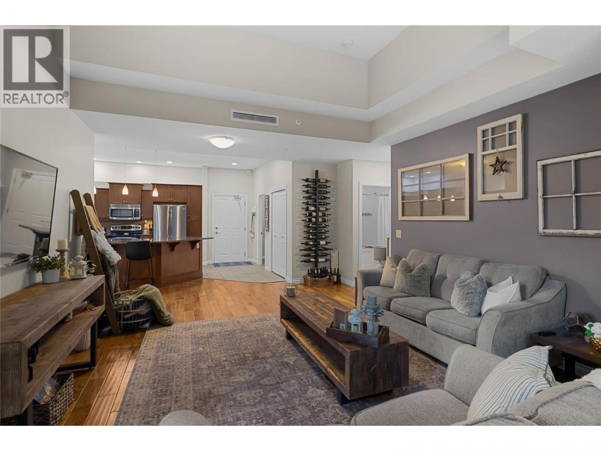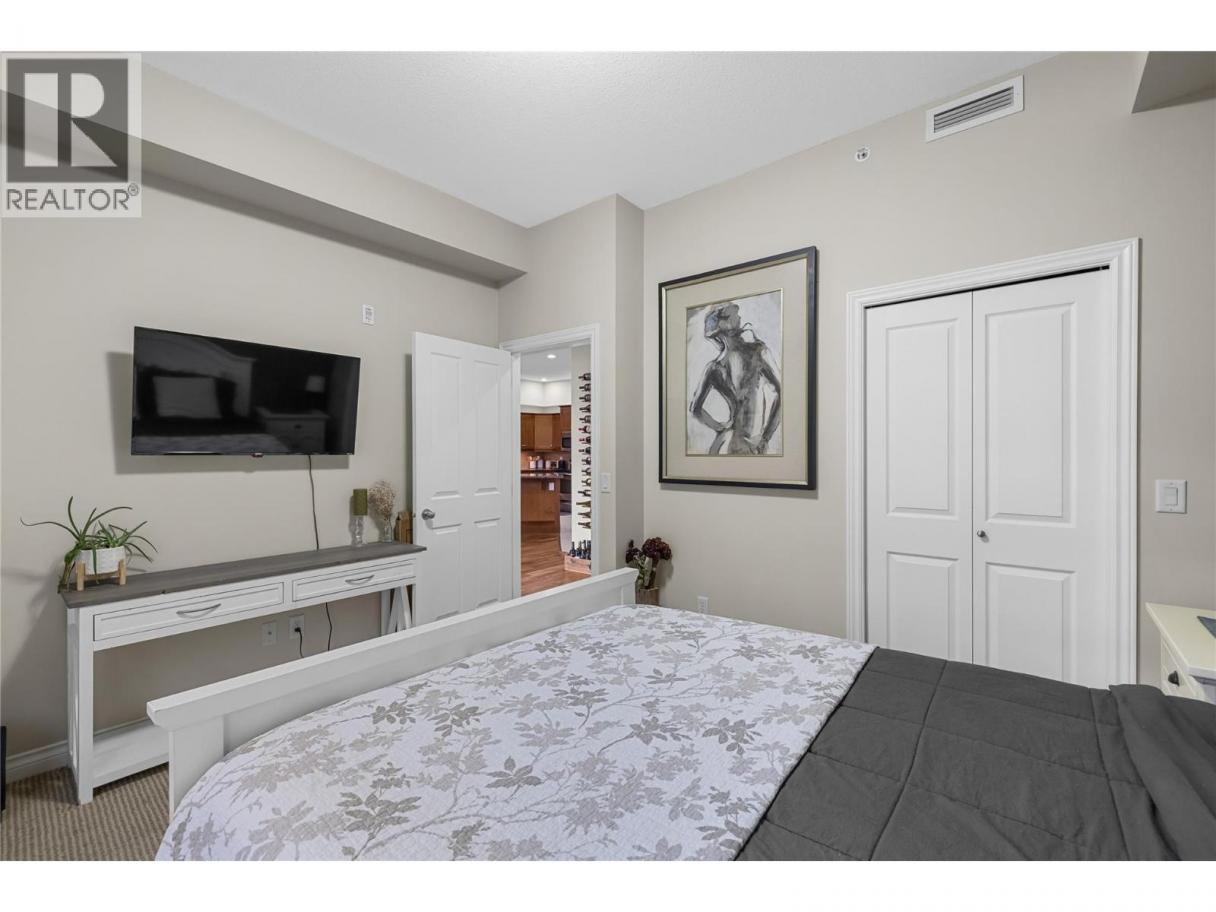 Welcome to this LAKE VIEW PENTHOUSE with 2 PARKING STALLS at Miravista, where comfort meets resort-style living in a desirable community. This home offers a spacious layout ideal for living and entertaining. The open-concept living and dining area is filled with natural light from vaulted ceilings and windows, creating a welcoming atmosphere. The kitchen features solid wood cabinetry, granite countertops with a sit-up bar, and flows seamlessly into the main living area. Enjoy summer BBQs and beautiful lake views from the SE-facing deck. The well-proportioned bedrooms include a spacious primary with room for a king bed, walk-in closet, and ensuite. An additional bedroom and den offer flexibility for guests or a home office. Fresh paint and a new stacking washer/dryer make this home move-in ready! Miravista enhances your lifestyle with amenities like an outdoor pool, hot tub, games room, and lounge. Features include 2 side-by-side secure underground parking stalls, a storage locker, and strata fees covering hot water, heat, and air conditioning. Ideally located close to Save-on-Foods, restaurants, wineries, transit, and amenities like the Johnson Bentley Memorial Aquatic Centre, City Hall, and trails. This well-managed community is an exceptional opportunity for homeowners and investors. Monthly rentals are allowed, with one pet (dog/cat up to 18"" at the shoulder). (id:6769)