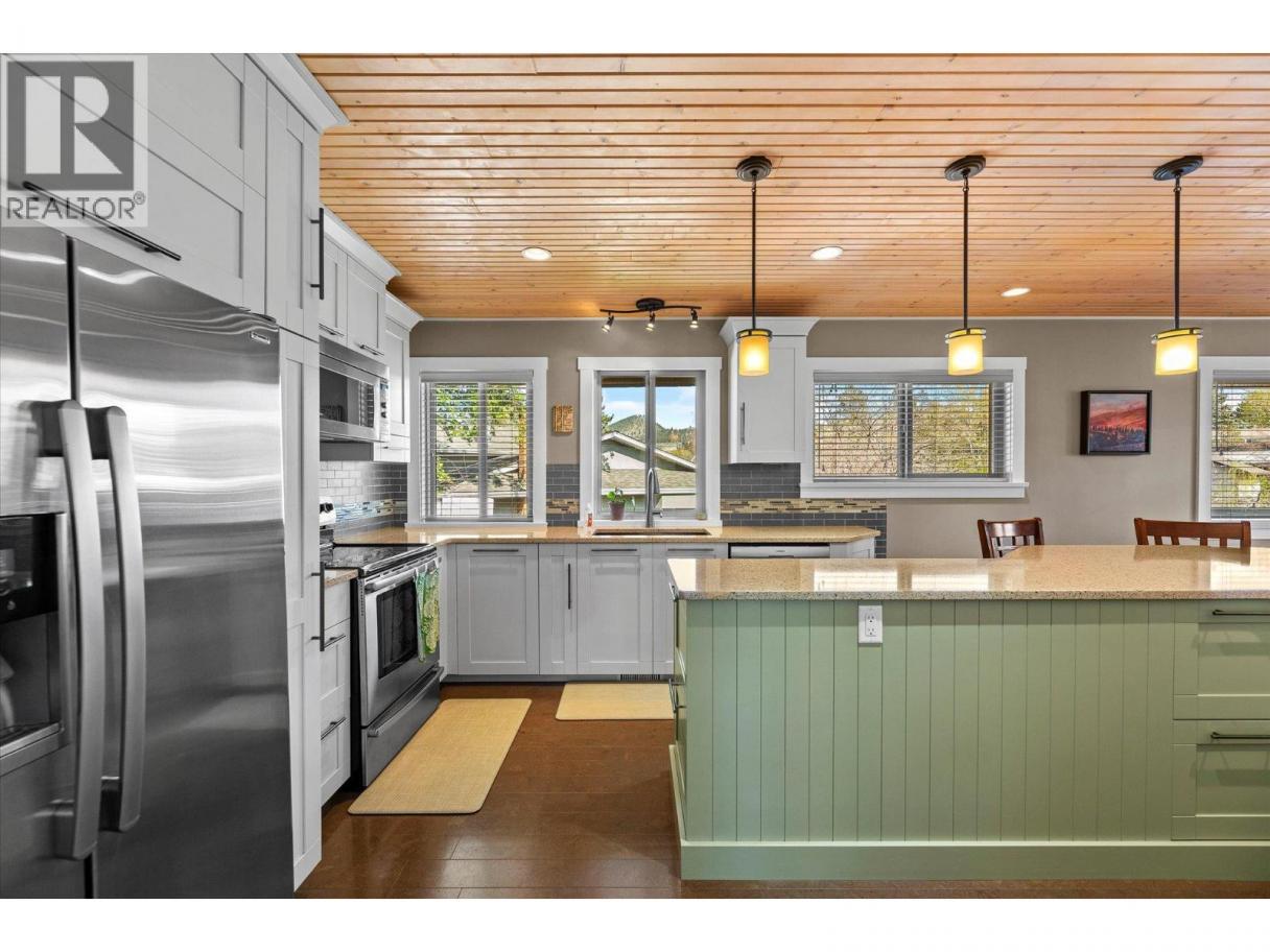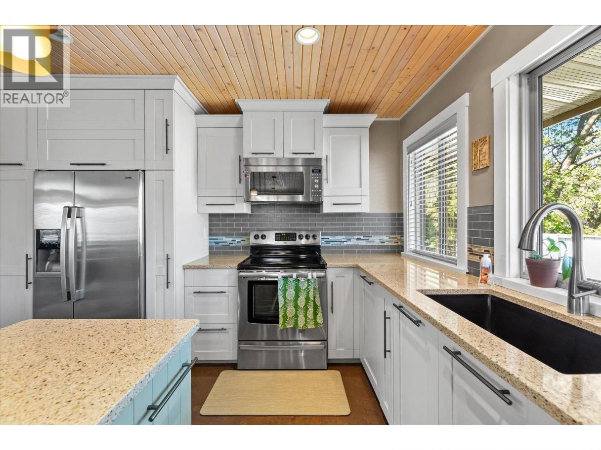 lenmore Family home loaded with value. Located with great access to schools, parks, Rail Trail, downtown access to the water front boardwalk and more. This 5 bedroom, 3 bath home includes a private 2 bedroom in-law suite/ summer kitchen complete with full kitchen, 3 piece bath and shared laundry. The main level has 3 spacious bedrooms, a 4 piece main bath and 3 piece en-suite with tile and glass shower. Entertain friends and family around the quartz counter top island in the remodeled kitchen with access to the Dining area, Living room with Gas Fireplace and double French doors to the covered patio. The lower level has a generous sized family room with wood burning fireplace, entry to the 2 bed suite, laundry room, and storage space. The low maintenance yard is completed with underground irrigation to flower and garden beds and your own private putting green to practice your ""short game"". There is also a great outdoor patio area which makes a perfect oasis space to read a book or entertain with friends. Lots of parking on the half moon driveway with a covered carport. This home has been maintained and cared for over the years. Glenmore listing at its best. (id:6769)