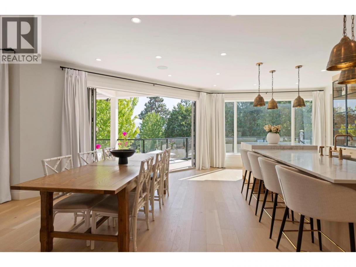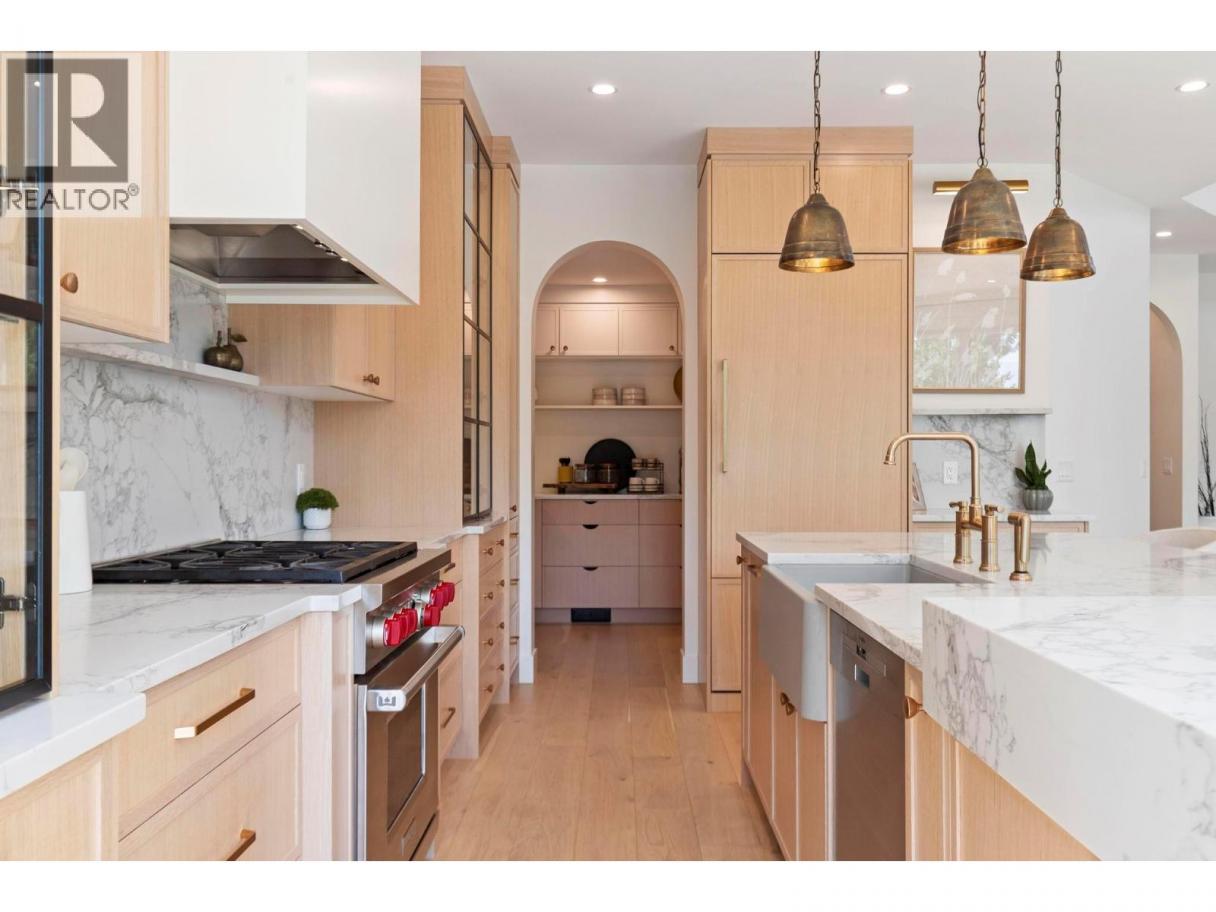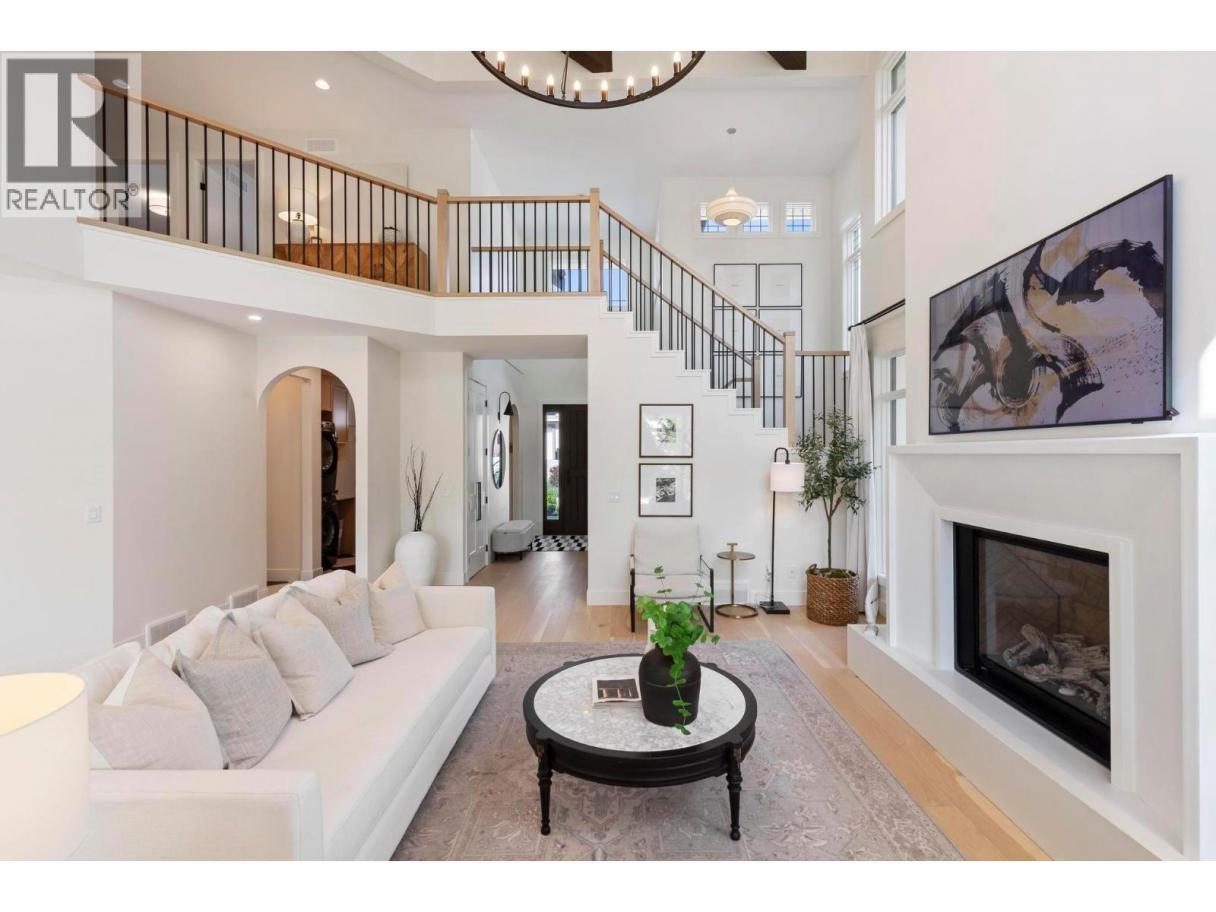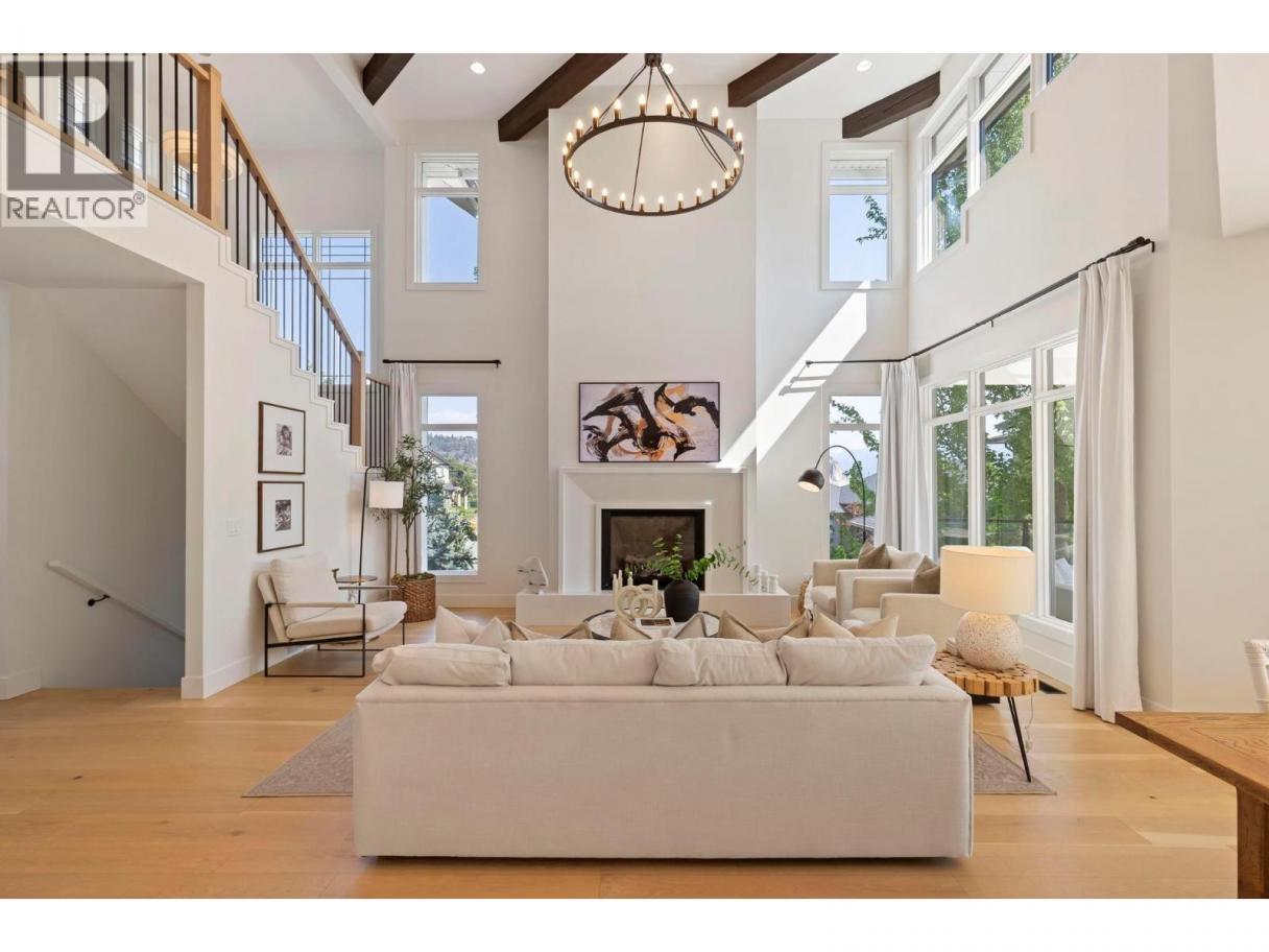 This exceptional luxury home is nestled on a quiet cul de sac in Kelowna’s prestigious Glenmore neighbourhood and was reimagined in 2023 by an award winning design and build team. Offering over 5,000 sq ft, it is ideal for elegant entertaining and multigenerational living. The stunning living room features soaring 18 foot vaulted ceilings, wide plank white oak flooring, statement wood beams, archways, and refined European inspired finishes. The custom chef’s kitchen includes integrated appliances, a six burner Wolf gas range, custom white oak cabinetry, quartz counters and backsplash, and an oversized walk in pantry. A main floor office with custom built ins overlooks the backyard. Upstairs are four generous bedrooms, including a primary retreat with private balcony, spa inspired ensuite, soaker tub, walk in shower, and walk in closet. The private backyard oasis offers a saltwater pool, hot tub, stamped concrete patio, gas fire pit, lush landscaping, and a full size basketball court that converts to a winter skating rink. RV parking and space for boats or trailers is included. Additional highlights include a movie room, private gym, and a flexible one or two bedroom walkout in law suite that is ideal for family, guests, or a mortgage helper. Minutes to downtown Kelowna and walking distance to schools, parks, and shopping, with mountain and sunset views and Sonos sound throughout. A rare Glenmore offering that combines luxury, lifestyle, and functionality. (id:6769)