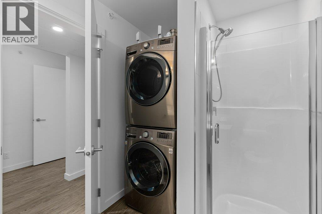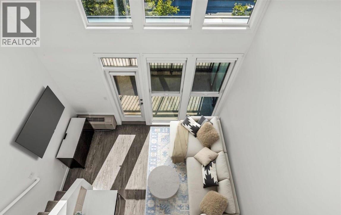 This top floor two-story loft at Central Green one offers a bright open layout with dramatic 18 foot ceilings and oversized tiered windows that flood the space with natural light. The kitchen is both functional and stylish featuring quartz countertops, stainless steel appliances with a built-in microwave, modern cabinetry and a generous double sink and a tile backsplash. The main living area flows seamlessly to a private balcony while the main level also includes a second bedroom and a full bathroom, ideal for guests or a home office upstairs the loft level is dedicated to a spacious primary retreat with a walk-in closet, three-piece ensuite, and in suite laundry with full-size stacked washer and dryer. A rare inconvenient feature the home offers two separate entrances one on each level, making access, easy and flexible the unit comes complete with one underground, parking stall and a large storage locker located near the upper entry, pet friendly with restrictions and rental friendly located just steps from downtown amenities, restaurants, boutique, shops, professional services, and transit. This is loft living at its best. (id:6769)