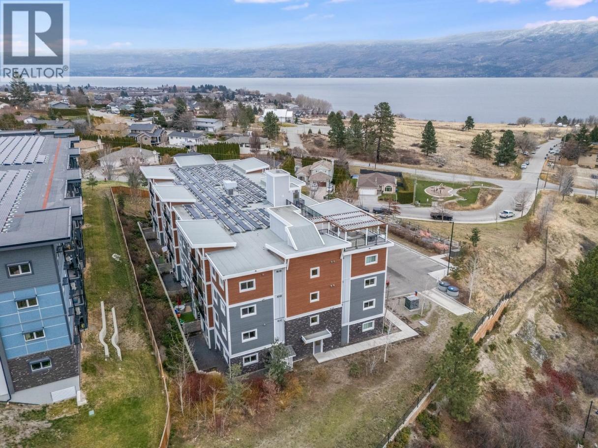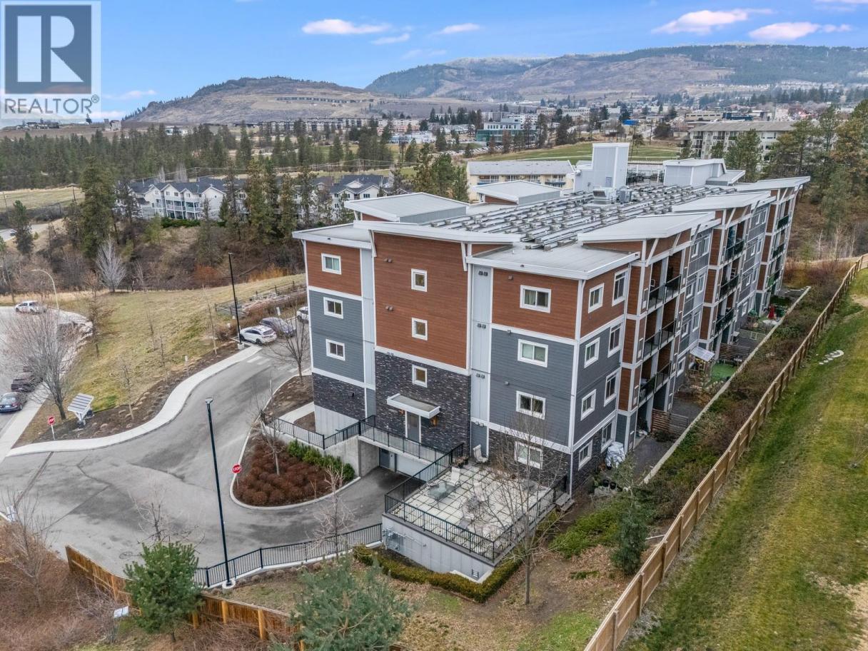 This ground-floor suite at NEO offers direct exterior access, perfect for pet owners or anyone avoiding stairs. The layout provides plenty of living space, plus a flex area/den for a home office, extra storage, or hobbies. The kitchen features white cabinetry to the ceiling, subway tile backsplash, stainless steel appliances, and bar seating. Sliding glass doors in the living area bring in natural light and showcase beautiful lake & mountain views, even from the ground floor. The 4-piece bathroom includes ample space and storage. Laminate flooring throughout and quartz countertops in kitchen and bath complete the modern look. Additional storage in the laundry makes organization easy. Residents enjoy a rooftop common area with BBQ and panoramic views. High-efficiency mechanical systems and recirculation lines provide near-instant hot water. Strata fees are very affordable, making this a smart entry into West Kelowna for low-maintenance, cost-effective living. One exterior parking space included. Centrally located, a short walk to restaurants, shopping, the wine trail, and minutes from Gellatly Bay Aquatic Park with pier, walking paths, dog beach, and boat launch. Ideal for singles, couples, or pet lovers, this suite combines flexible space and easy-care living. Schedule a showing today to take advantage of this affordable opportunity! (id:6769)