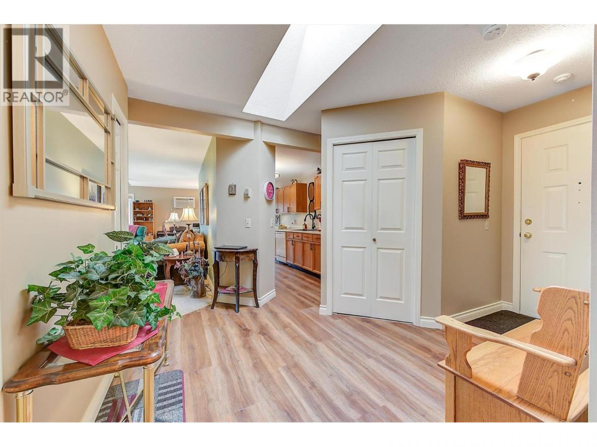 Discover serene lakeside living in this updated top-floor corner unit. Nestled in a vibrant 55+ community, this 3-bedroom, 2-bathroom haven blends modern comforts with breathtaking panoramic lake views for effortless retirement bliss. Step into a light-filled sanctuary, where multiple skylights and newer windows flood the space with natural warmth. The spacious living room is a cozy retreat with plush newer carpets, and a charming gas fireplace. The well-appointed kitchen offers generous storage and ample counter space—perfect for whipping up gourmet meals or hosting friends. Extend your living to the generous enclosed deck, a four-season haven for savoring those fabulous vistas with morning coffee or evening sunsets, rain or shine. A dedicated patio storage room keeps outdoor essentials handy. Retire to the spacious master suite, featuring a full ensuite, walk-in closet, and serene lake views. Two additional bedrooms provide flexible space for guests or hobbies. This meticulously maintained building, with its robust contingency fund, ensures worry-free peace of mind. Hot water and in-floor radiant heating are included in your strata fees for worry-free living. The complex also features secure underground parking, a workshop space, rentable garden beds, and RV storage. Pet-friendly for your furry companion (one dog or cat up to 14"" at the shoulder). Don't miss this gem—book your viewing today and make these views your new reality! (id:6769)