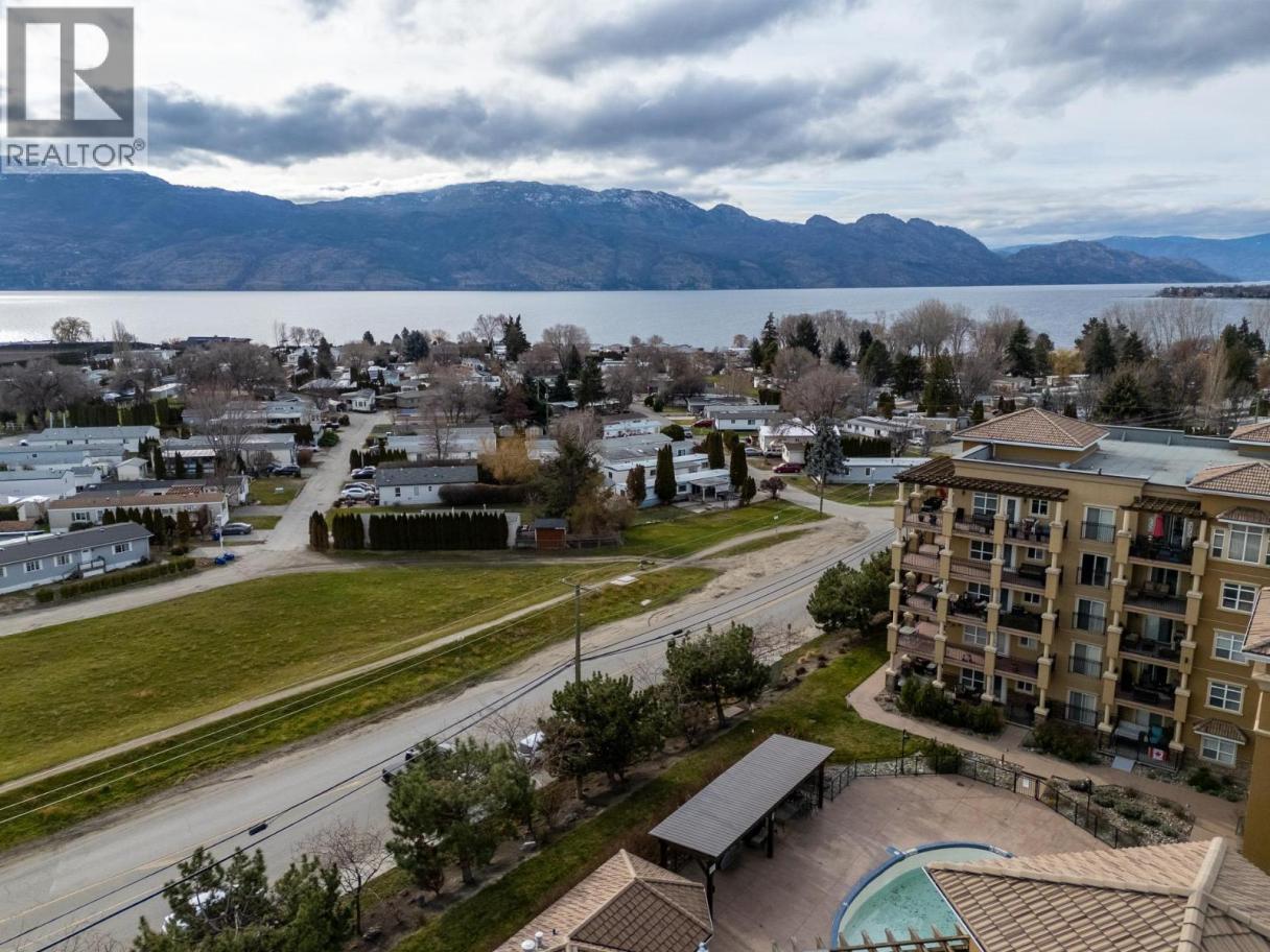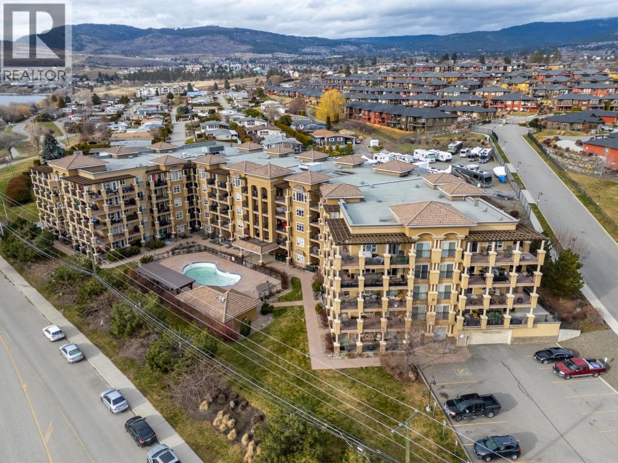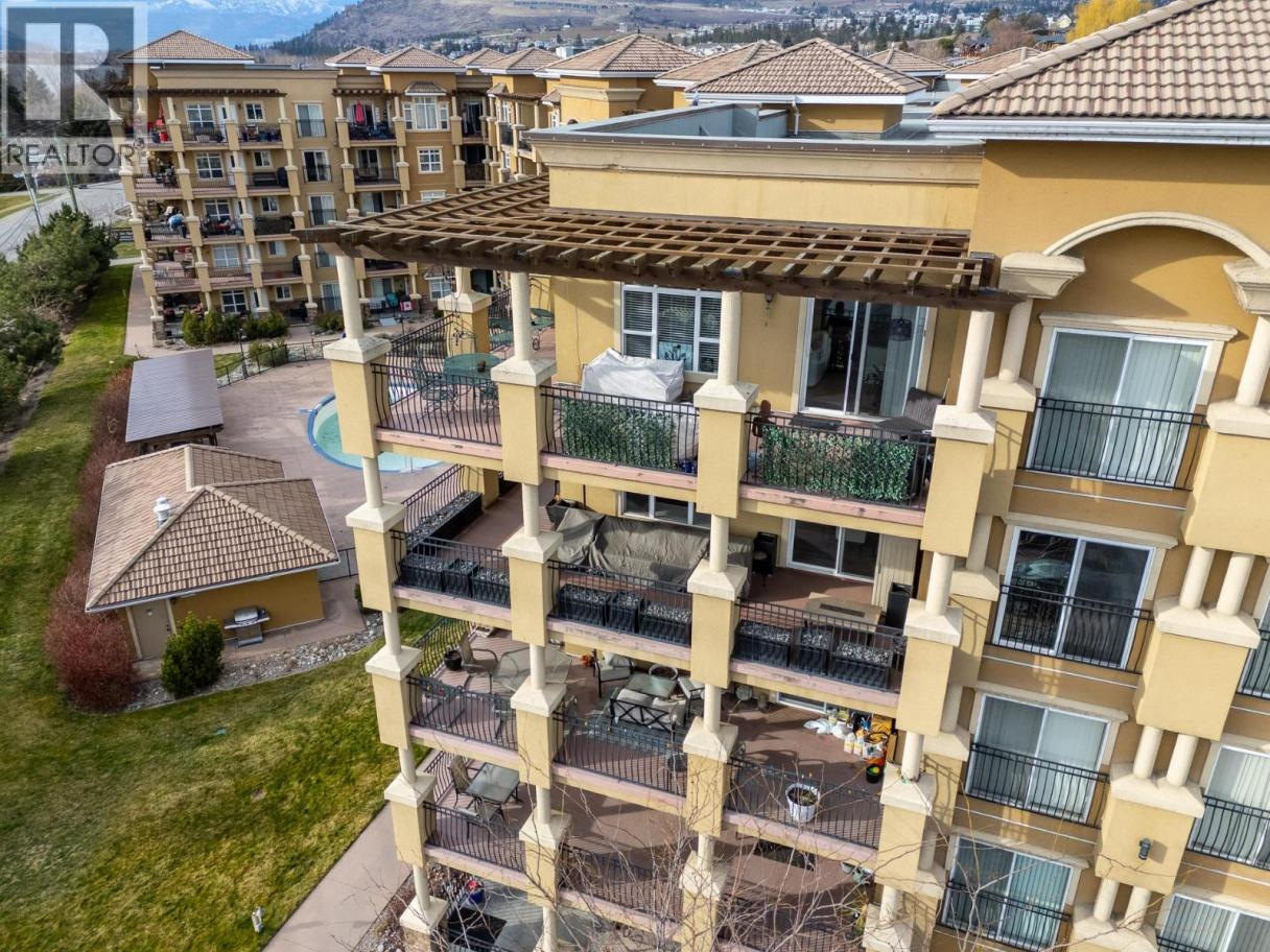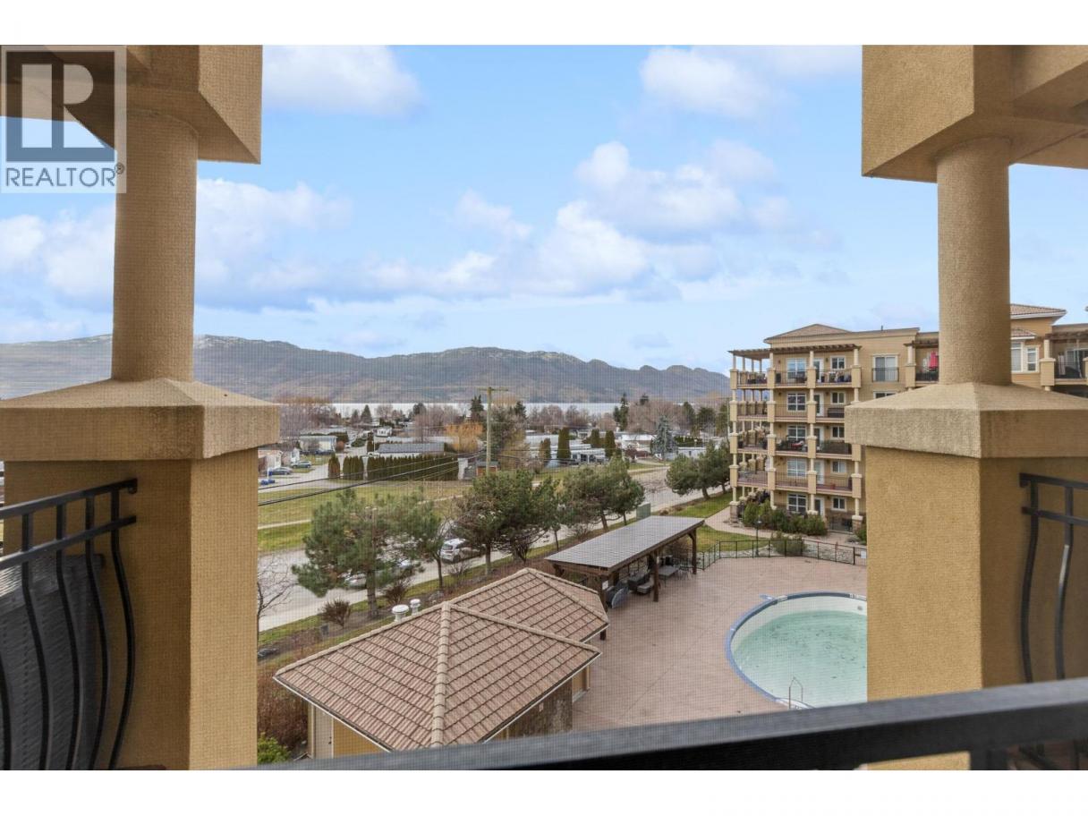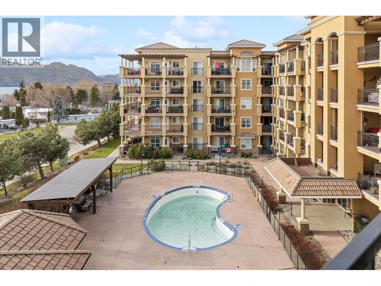 Welcome to Tuscany Villas! Gorgeous lake views and effortless resort-style living await in this poolside 2-bedroom, 2-bathroom condo offering 1,150 sq. ft. of interior living plus an incredible 480 sqft covered deck perfect for entertaining, relaxing, and taking in the scenery. This bright, open-concept plan is beautifully finished with newer flooring and a stylish kitchen featuring a large island, granite countertops and all-new stainless steel ThinQ appliances. Every detail has been thoughtfully upgraded, including new lighting throughout, new switches and dimmers, a smart thermostat, and quartz countertops with modern fixtures in both bathrooms. The bedroom sliders are enhanced with UV privacy film, allowing natural light to pour in while maintaining comfort and privacy. Enjoy breathtaking approximately 180-degree lake views through expansive windows and the peace of mind of a solid concrete and steel construction building - designed to be up to 75% quieter and built to last. Air conditioned, pristine and truly move-in ready, this home feels like new. Even better, no Property Transfer Tax applies, adding exceptional value. Tuscany Villas delivers true resort-style living with a beautiful outdoor swimming pool, hot tub - just steps to the beach, trails, wineries, restaurants and shopping. Whether as your full-time residence or the perfect home away from home, this is lakeside living at its finest. (id:6769)