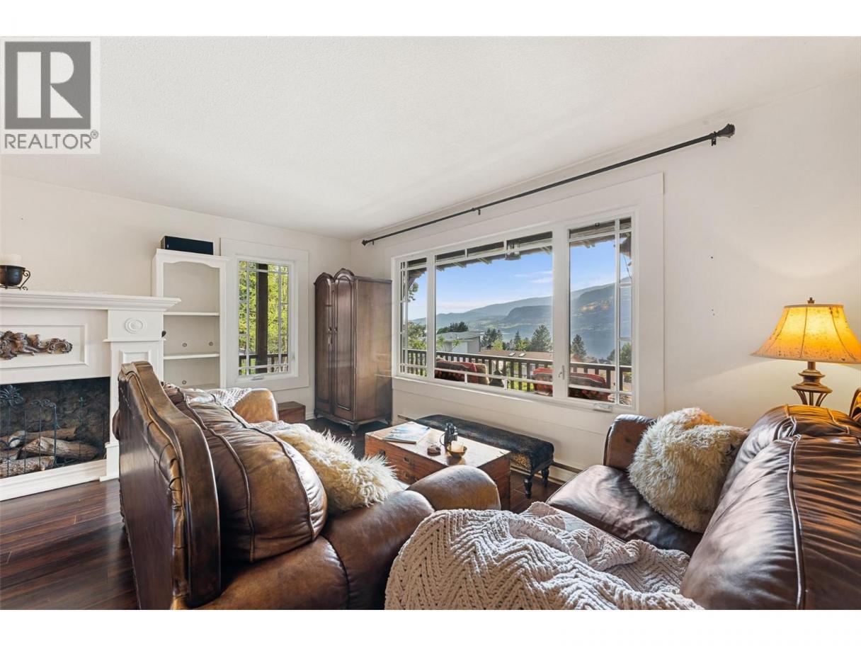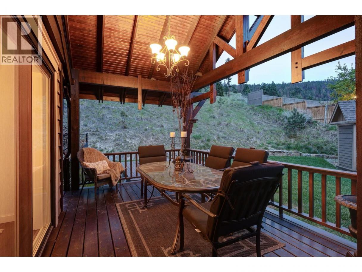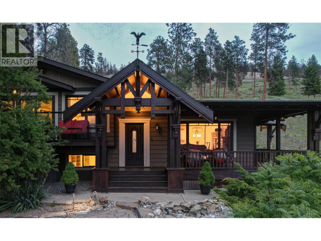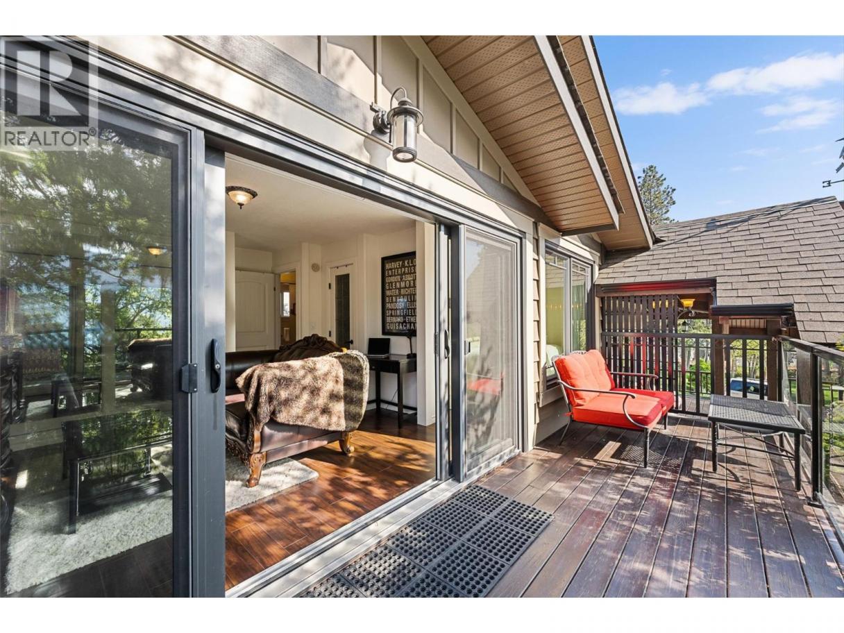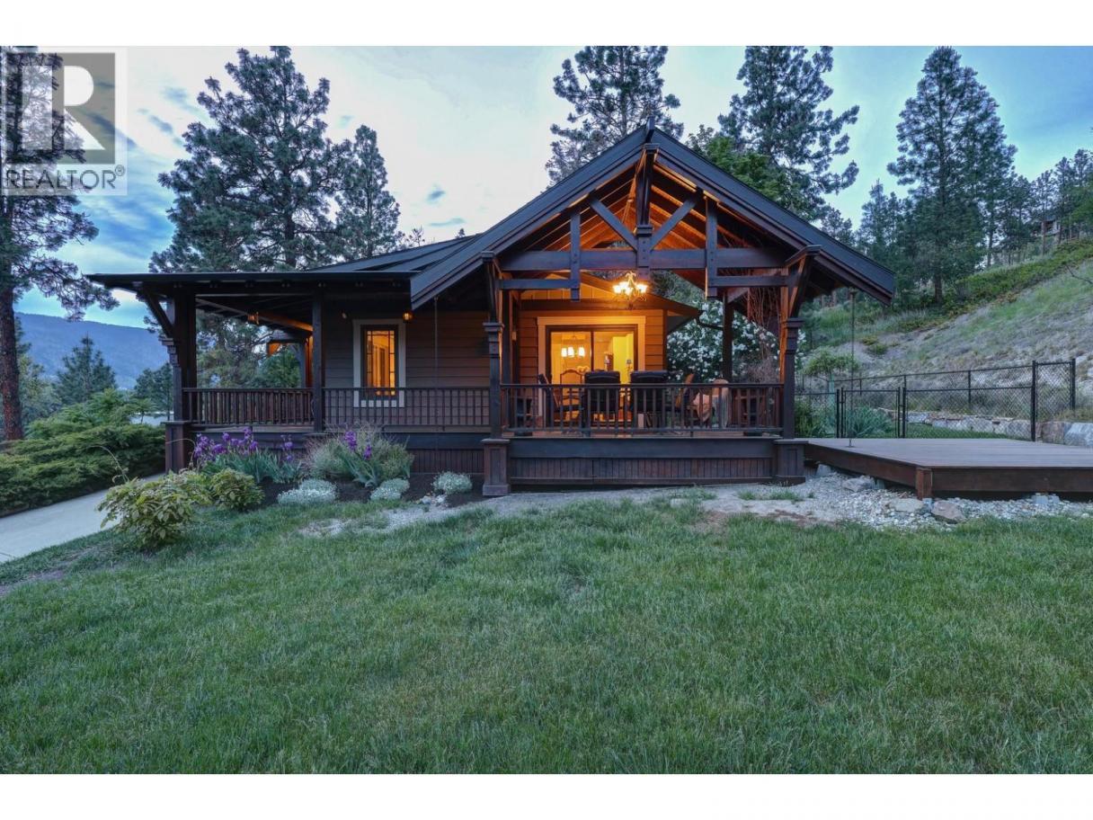 Welcome to this charming timber frame-style home in McKinley Landing, where rustic elegance meets relaxed Okanagan living. Thoughtfully maintained and filled with character, this 4-bedroom, 2-bathroom home offers stunning lake views, a flexible multi-level layout, and a location just a 5-minute stroll to a quiet, sun-drenched public beach with dock access. Inside, warm wood tones, laminate flooring, and high-end carpentry details create a welcoming ambiance. The bright kitchen features a breakfast bar island and built-in desk area, while the living and dining spaces open to a covered wraparound cedar deck—perfect for taking in panoramic views or hosting candlelit evenings under the stars. The upper level boasts a dreamy primary suite with walk-in closet, cozy nook, and 12’ sliding doors to a private lakeview deck. A secondary bedroom features a built-in kitchenette—ideal for guests or short-term stays. Downstairs, enjoy two guest bedrooms, a rec room, office with a view, and a fully fenced backyard complete with workshop, storage, and a delightful playhouse. Located on a quiet private road just 10–20 minutes from UBCO, YLW, KGH, and downtown. This is lakeside living with room to grow and space to unwind. Possibly potential to be a bed and breakfast. (id:6769)