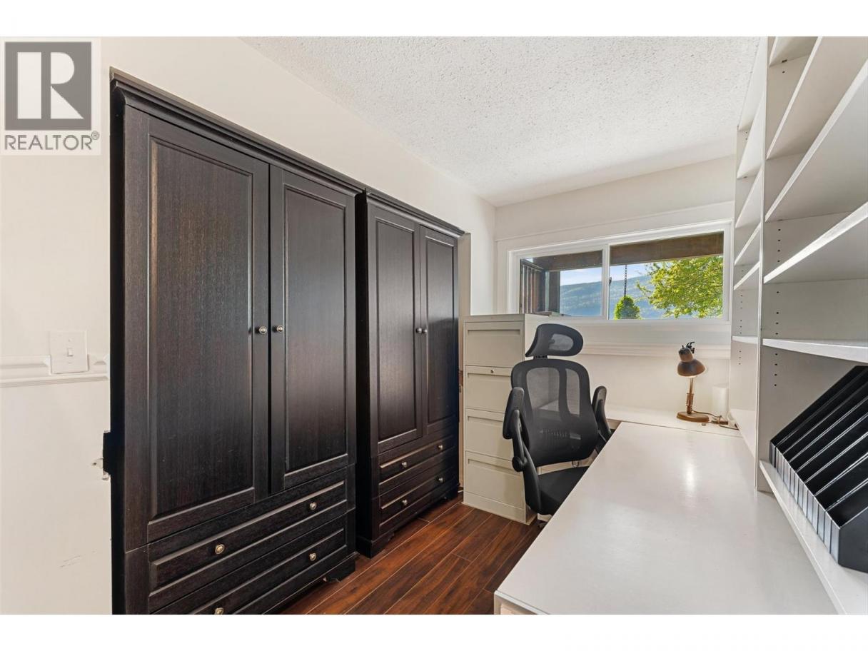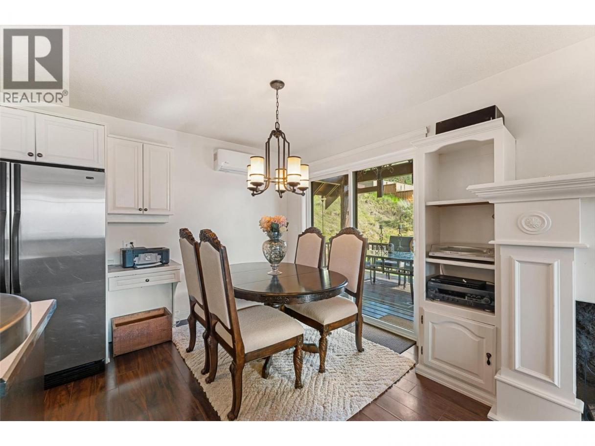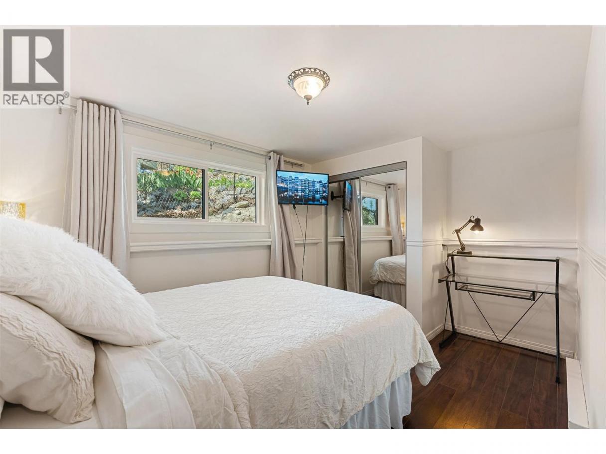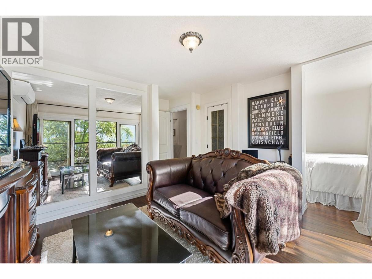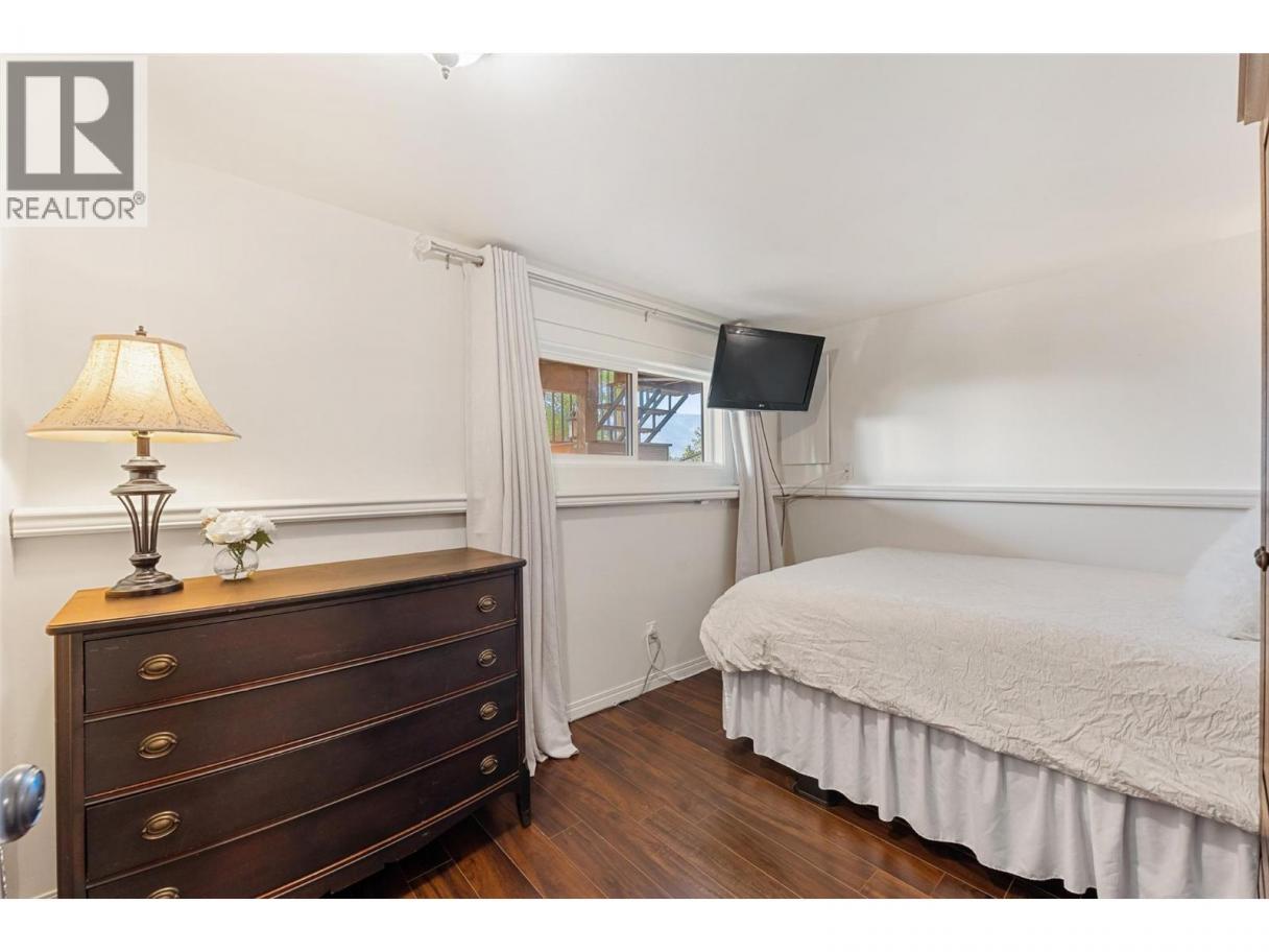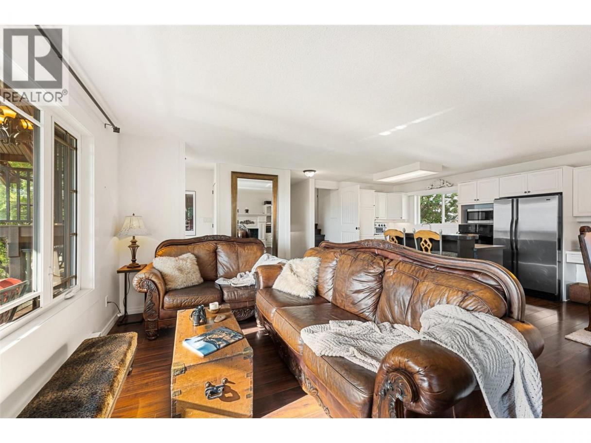 Welcome to this charming timber frame-style home in McKinley Landing, where rustic elegance meets relaxed Okanagan living. Thoughtfully maintained and filled with character, this 4-bedroom, 2-bathroom home offers stunning lake views, a flexible multi-level layout, and a location just a 5-minute stroll to a quiet, sun-drenched public beach with dock access. Inside, warm wood tones, laminate flooring, and high-end carpentry details create a welcoming ambiance. The bright kitchen features a breakfast bar island and built-in desk area, while the living and dining spaces open to a covered wraparound cedar deck—perfect for taking in panoramic views or hosting candlelit evenings under the stars. The upper level boasts a dreamy primary suite with walk-in closet, cozy nook, and 12’ sliding doors to a private lakeview deck. A secondary bedroom features a built-in kitchenette—ideal for guests or short-term stays. Downstairs, enjoy two guest bedrooms, a rec room, office with a view, and a fully fenced backyard complete with workshop, storage, and a delightful playhouse. Located on a quiet private road just 10–20 minutes from UBCO, YLW, KGH, and downtown. This is lakeside living with room to grow and space to unwind. Possibly potential to be a bed and breakfast. (id:6769)