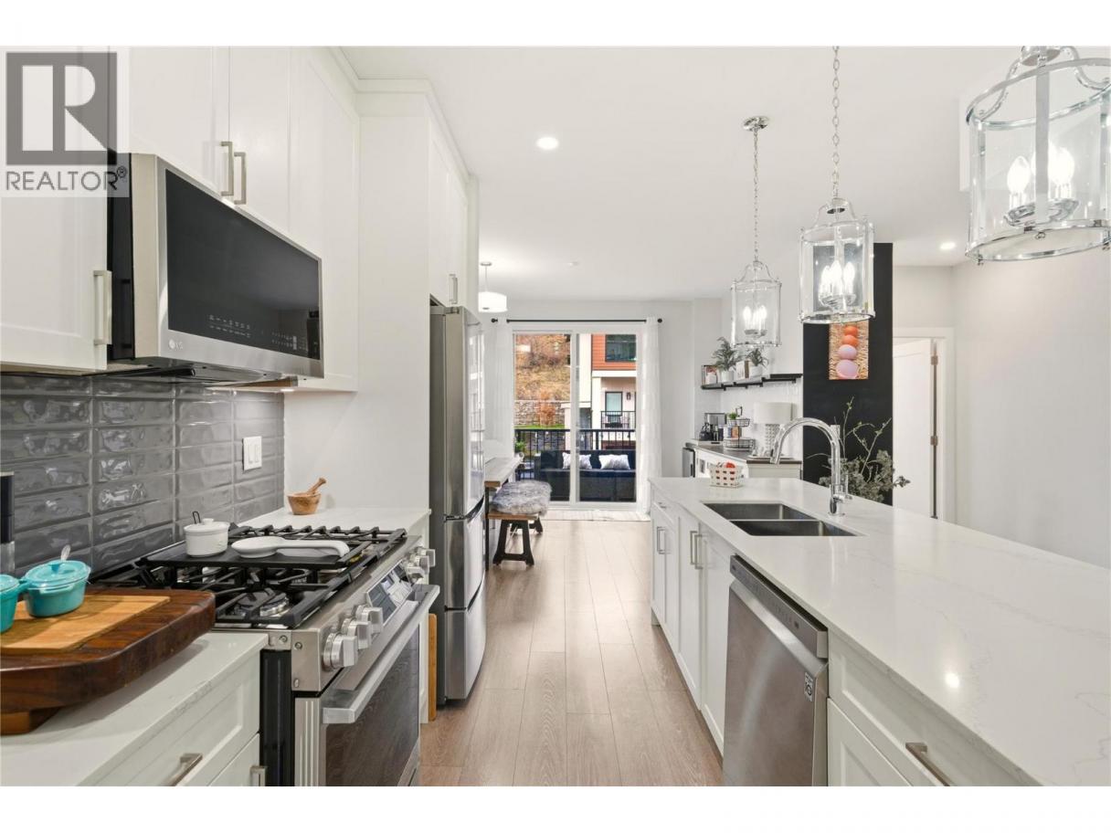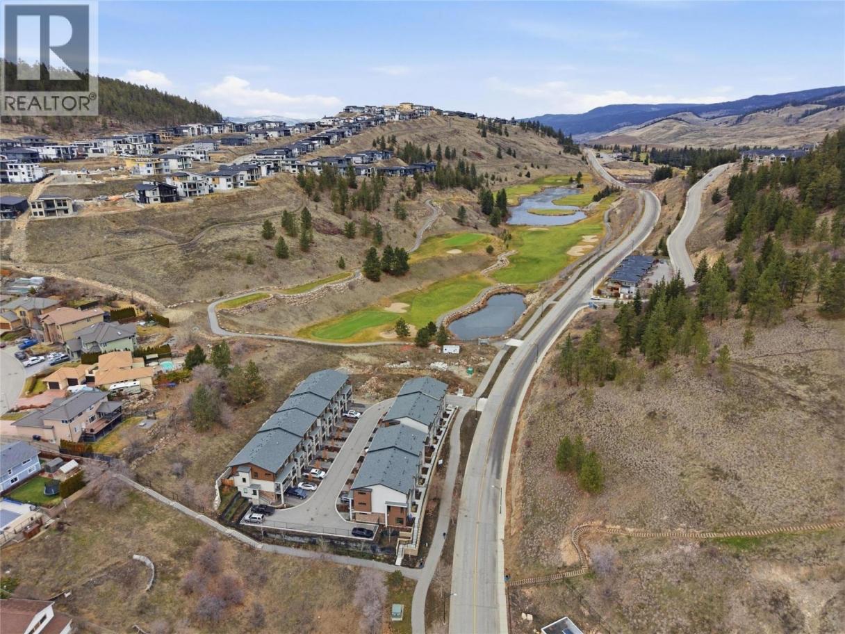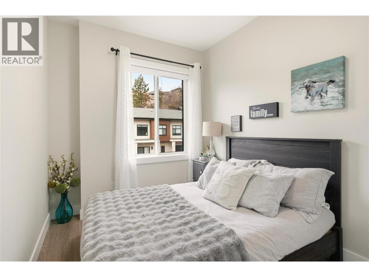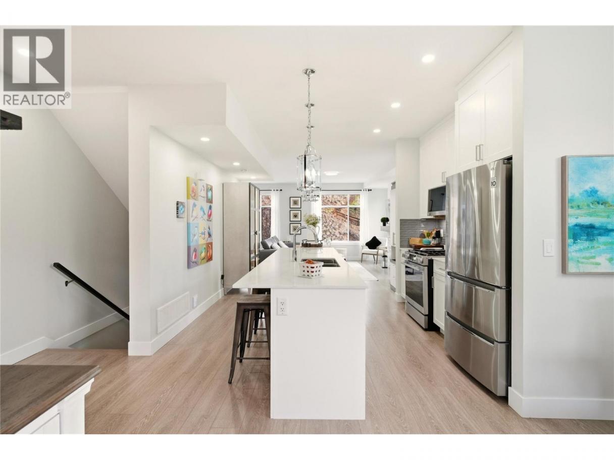 Welcome to Ascend – a beautifully positioned end-unit townhouse in the highly sought-after Black Mountain Golf Course community. Built in 2023, this thoughtfully updated 4-bedroom, 3.5-bathroom home offers nearly 1,900 sq ft of modern living across three levels. Ideally situated within the complex, this end unit enjoys mountain views and offers exceptional privacy along with the most natural sunlight exposure in the development, filling the home with warmth and brightness throughout the day. The open-concept main floor features updated flooring throughout and a bright living space anchored by a stylish electric fireplace with custom mantle. The contemporary kitchen flows seamlessly into the dining area with direct access to the balcony — perfect for entertaining or relaxing while taking in the surrounding views. Upstairs includes three bedrooms, highlighted by a spacious primary suite with a private 3-piece ensuite. The lower level offers a flexible office or fourth bedroom with a full bathroom. A standout opportunity combining desirable end-unit positioning, , multiple upgrades, low strata fees, and modern design just steps from the golf course. (id:6769)