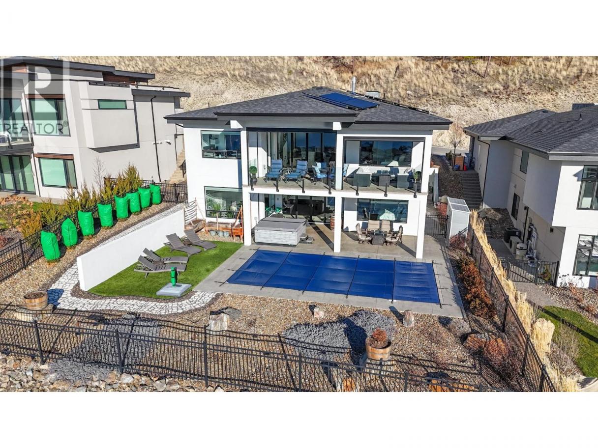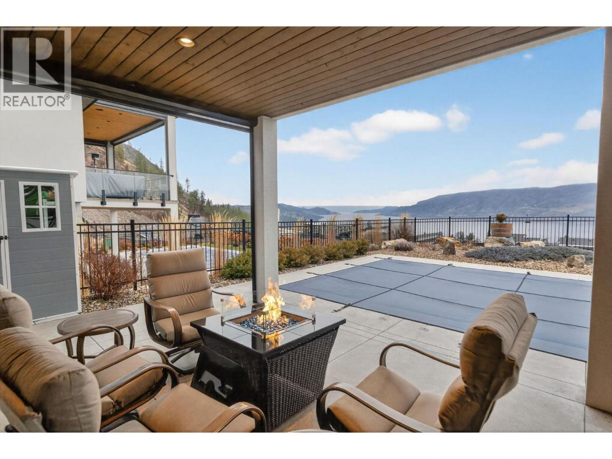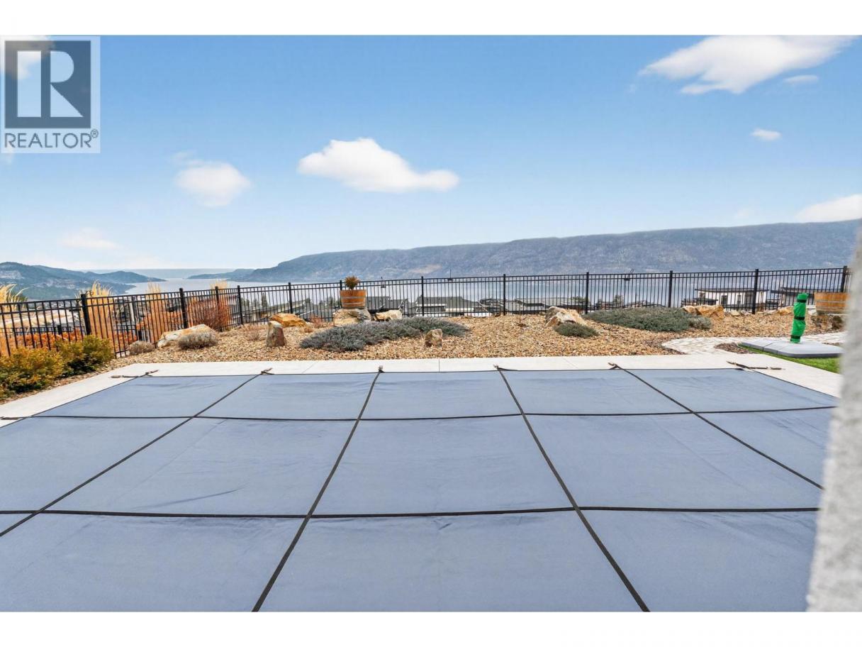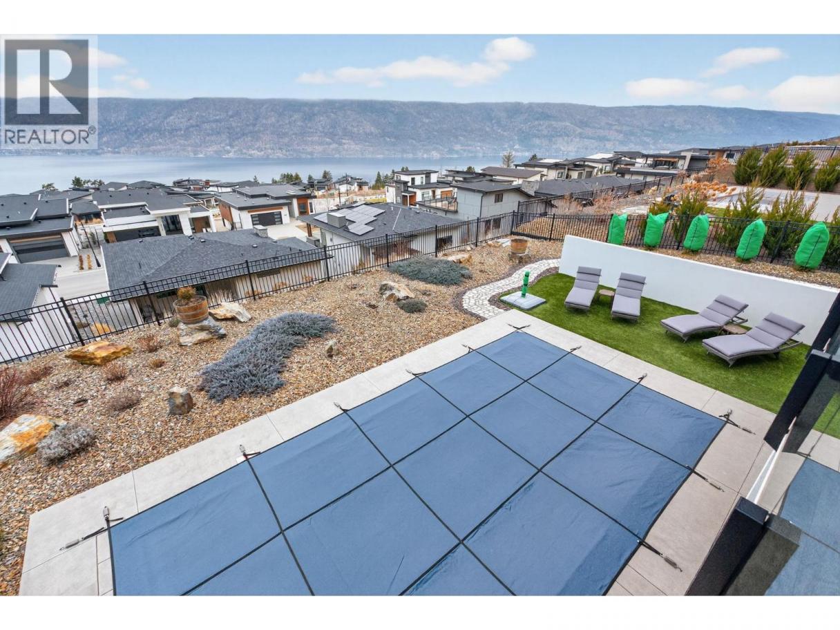 One of the best views in Lakestone! Built by Destination Custom Homes, one of the community’s preferred builders, this immaculate walk-out rancher offers breathtaking lake views and the perfect setting to enjoy the in-ground pool and Okanagan lifestyle. Featuring modern minimalist design, oversized windows, abundant natural light, and an open layout ideal for entertaining. The 500 sq ft deck off the living room with French sliding doors and power shades extends indoor/outdoor living. The kitchen includes quartz countertops, full-size fridge/freezer, gas range, and walk-in pantry. The primary suite offers a walk-in closet and 4-piece ensuite with heated floors. A spacious office and powder room complete the main level. The walk-out lower level features a wet bar, fireplace, two guest bedrooms, and exterior access to the guest bathroom — perfect after pool or hot tub use. The backyard is an entertainer’s dream with pool, hot tub, and unique fluorescent rock pathway. Efficient home with 32 solar panels, dual-zone HVAC, and EV-ready setup. Lakestone offers 28 km of walking trails, multi-sport courts, The Lake Club, and Centre Club, plus easy access to shopping, schools, wineries, restaurants, golf, skiing, Kelowna International Airport, and downtown Kelowna (25 min). Don’t miss this rare opportunity! *Open House Saturday February 21st from 12-2* (id:6769)