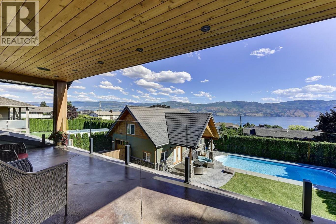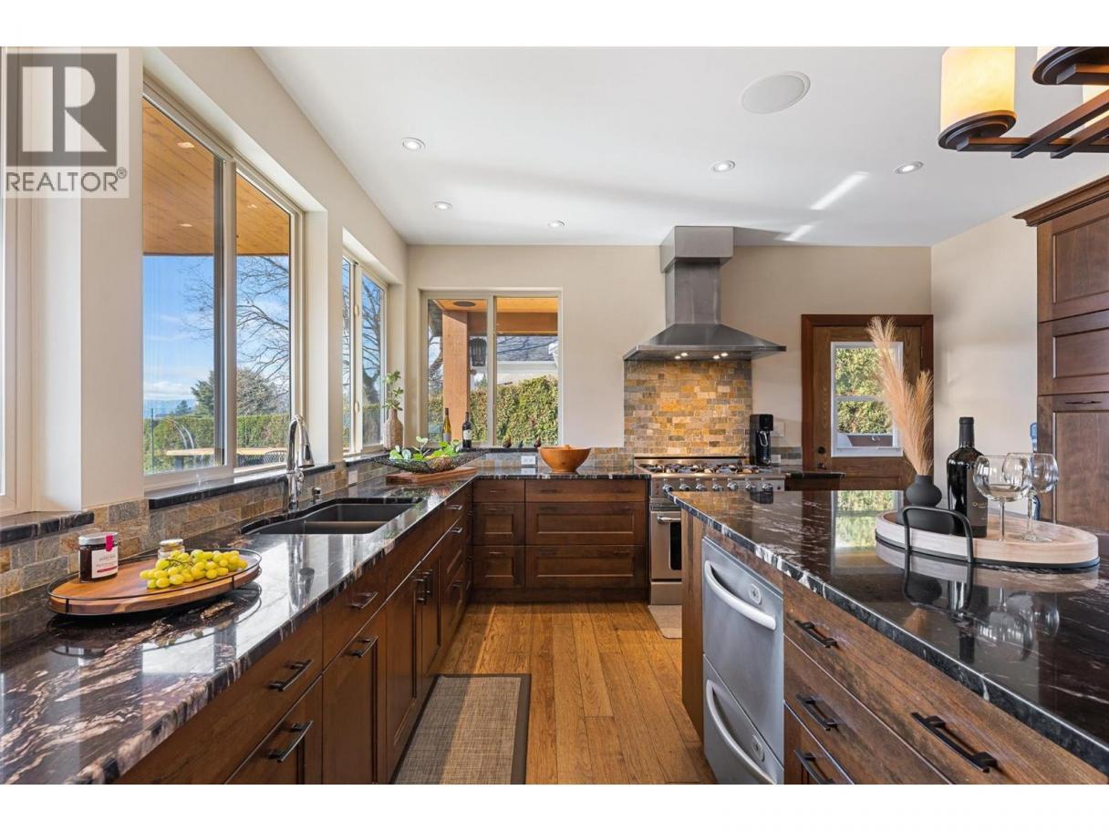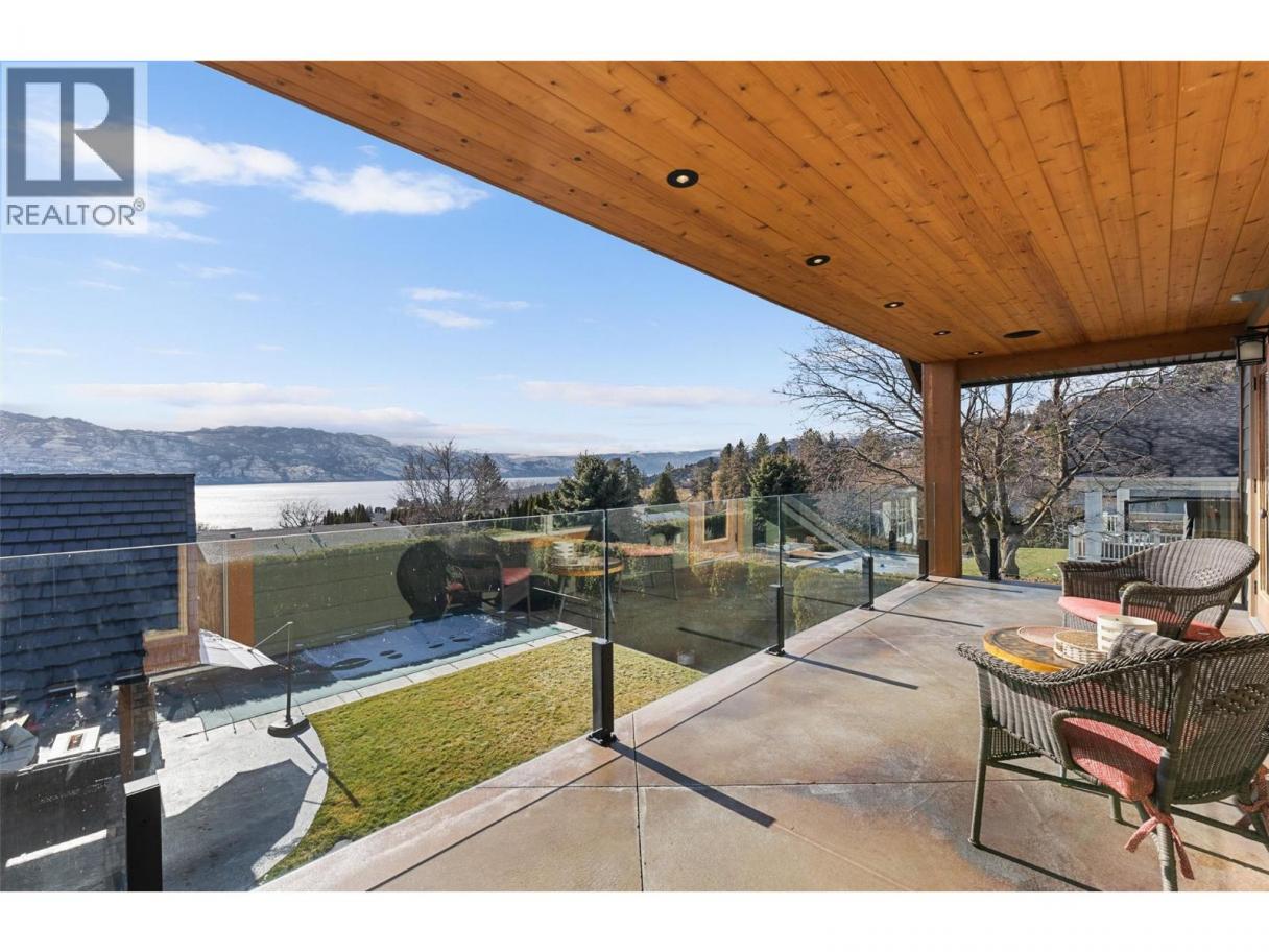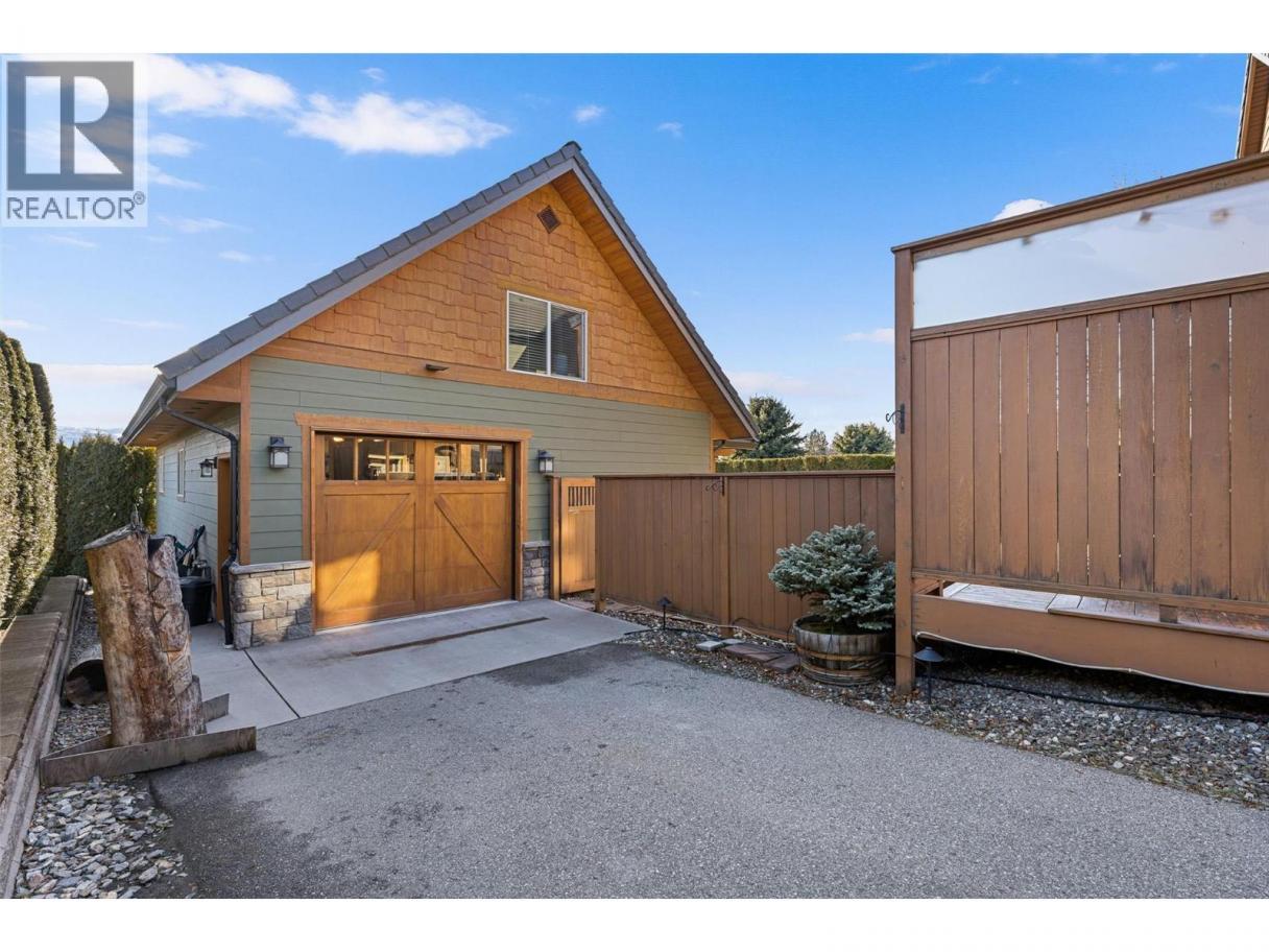 Set on a private 0.36-acre lot in the heart of West Kelowna’s wine country, this West Coast Craftsman offers an exceptional blend of luxury and versatility. Framed by stone, cedar and fibre cement, the home showcases strong architectural lines, soaring ceilings and quality finishes, hickory plank hardwood, cherry and bamboo cabinetry, fir doors and premium quartz and granite throughout. Designed for gathering, the main level opens to a chef’s kitchen with titanium black granite, Culinarian 6-burner gas range, Miele steam oven and expansive island, all flowing seamlessly to dining and living spaces with in-ceiling audio and Lutron lighting. A covered patio off the dining room extends to an spacious covered deck with a hot tub. The backyard features a saltwater sports pool and multiple lounge areas surrounded by stamped concrete, cedar privacy hedging and wired, covered patios with wood inlay ceilings, speakers and gas hookups, crafted for effortless entertaining. Upstairs, the primary suite is a sanctuary with fireplace, private covered deck and spa-inspired steam ensuite. Three additional beds complete the upper level. A legal suite above the garage offers income or guest flexibility, while the detached pool house, with bed, bath, kitchenette and separate garage/workshop, adds rare multigenerational potential. With RV parking, wine cellar, climate control systems and walking access to Boucherie Road’s trail, wineries and beaches, this is refined Okanagan living. (id:6769)