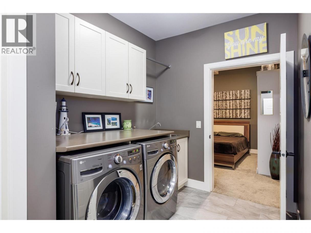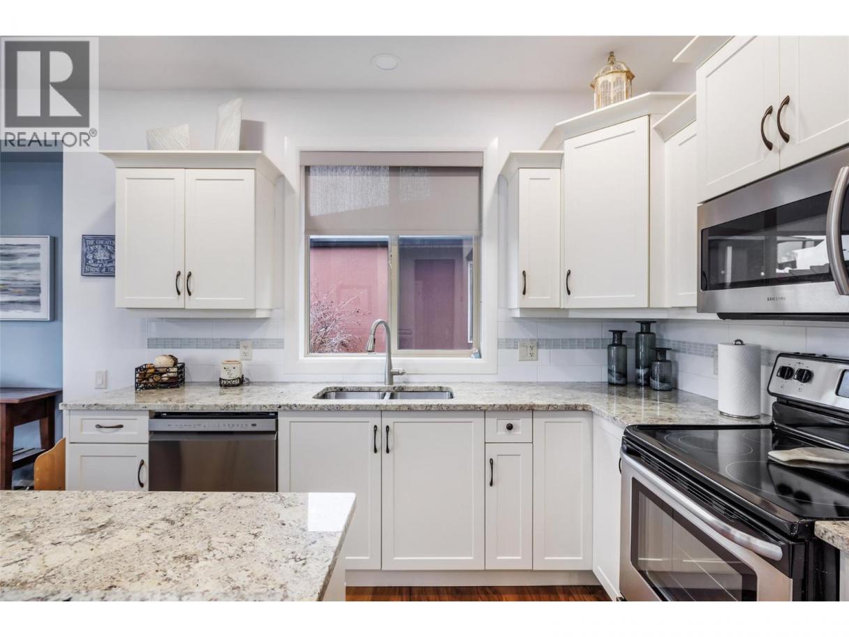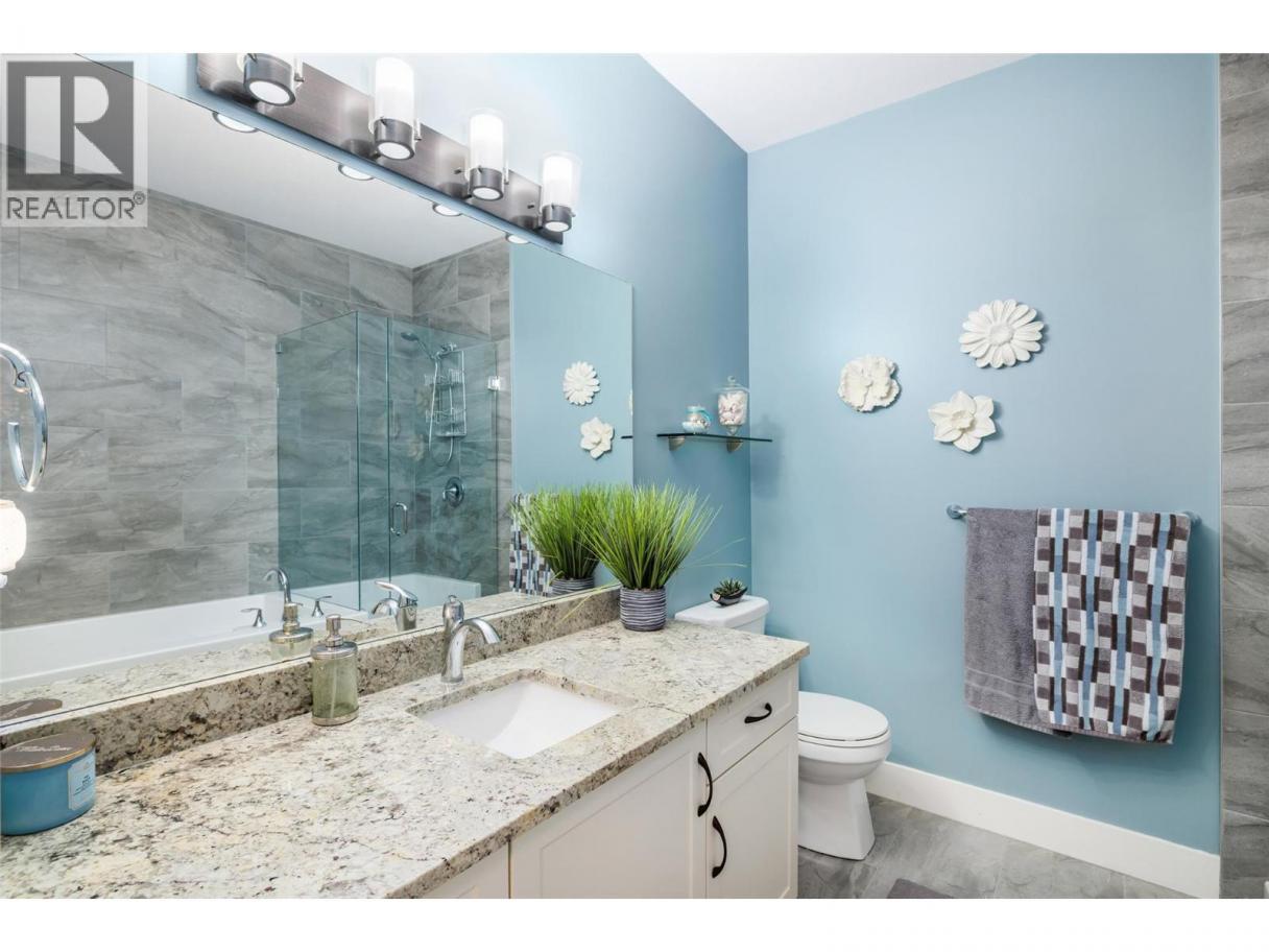 Visit REALTOR website for additional information. This remodelled 2-bed, 2-bath up/down half duplex is located in the gated Sonoma Pines community in West Kelowna and offers low-maintenance living in an established neighbourhood, with all primary living spaces on one level. The main living area features 11-foot ceilings, an open kitchen with granite island, stainless steel appliances, and large windows capturing mountain views with a partial lake view. Bedrooms are positioned on opposite sides for privacy. The primary bedroom includes a walk-in closet and ensuite, while the second bedroom is near the main bathroom and laundry area. A 12' × 20' family or bonus room provides flexible living space and includes a Murphy bed. Direct access to the attached single-car garage offers custom storage, and the home is equipped with a Ring security system. The extended patio provides outdoor space for seating and a BBQ. Sonoma Pines includes a clubhouse with a fitness room, billiards, library, craft spaces, and a social hall. The clubhouse is currently undergoing renovations to enhance community amenities. Adjacent to Two Eagles Golf Course and close to beaches, shopping, restaurants, and walking paths. Located on Westbank First Nation land, exempt from GST and Property Transfer Tax. Water is included in strata fees; utilities averaging approx. $125/month. Quick possession available. (id:6769)