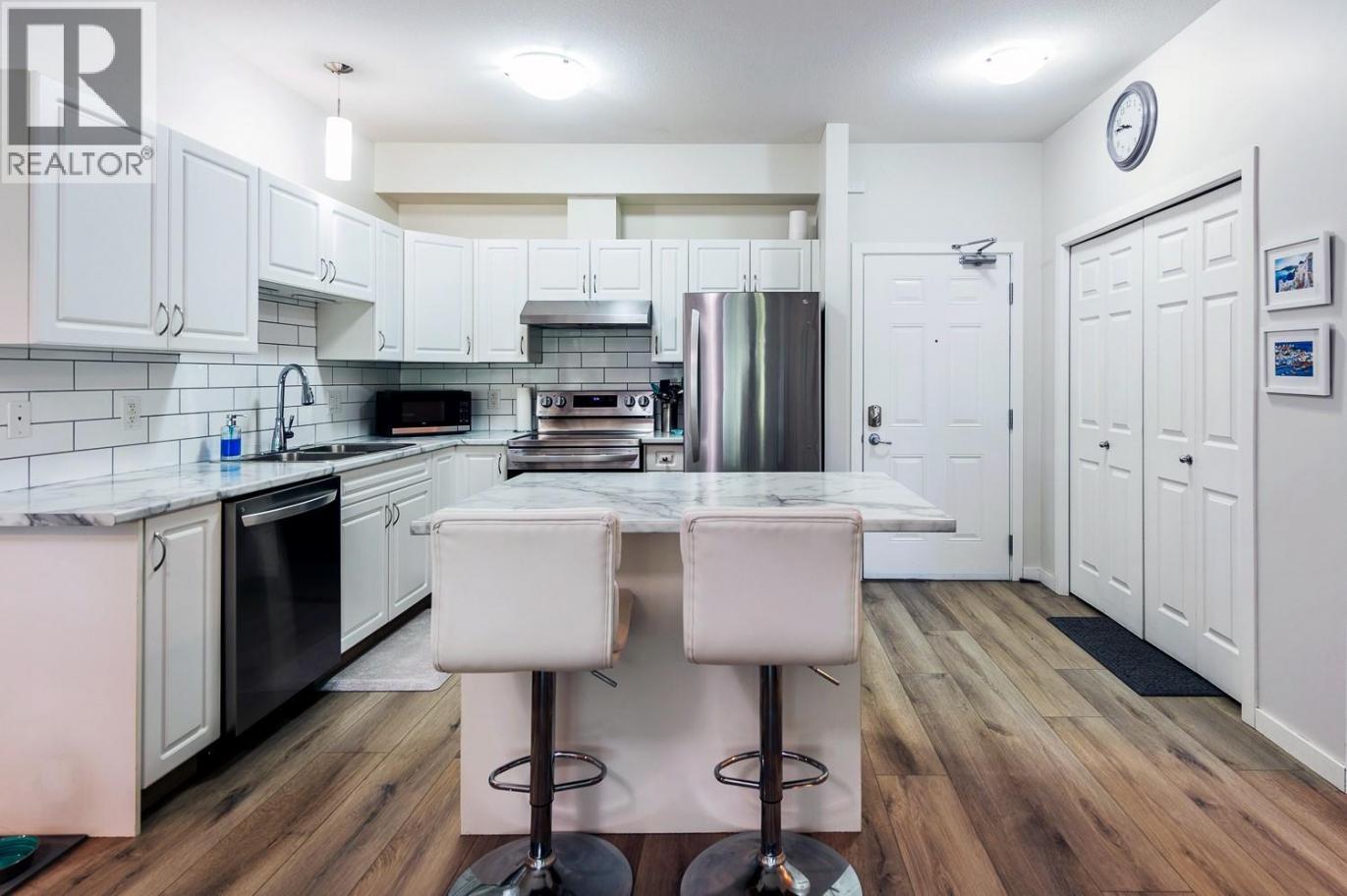 Welcome to this bright, cheerful split 2 Bed, 2 Bath floor plan, with large windows and high ceilings. It was recently updated with new paint, toilets and gorgeous wide plank flooring in neutral colours. There are large closets and a full size laundry room. The kitchen upgrades include a new island, backsplash, countertops, sink, stainless steel faucet and all new appliances. It is close to schools, shopping and transit. This building includes heated underground parking, security cameras at the entrance, lots of visitor parking, a suite that can be rented, and one of the largest storage units in the building. A/C 2013, Dishwasher, Fridge, Range all 2023, Washer 2025. (id:6769)