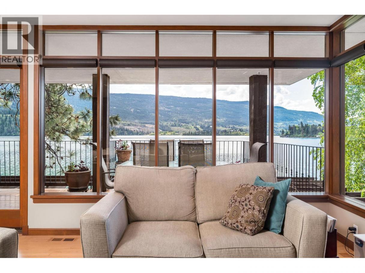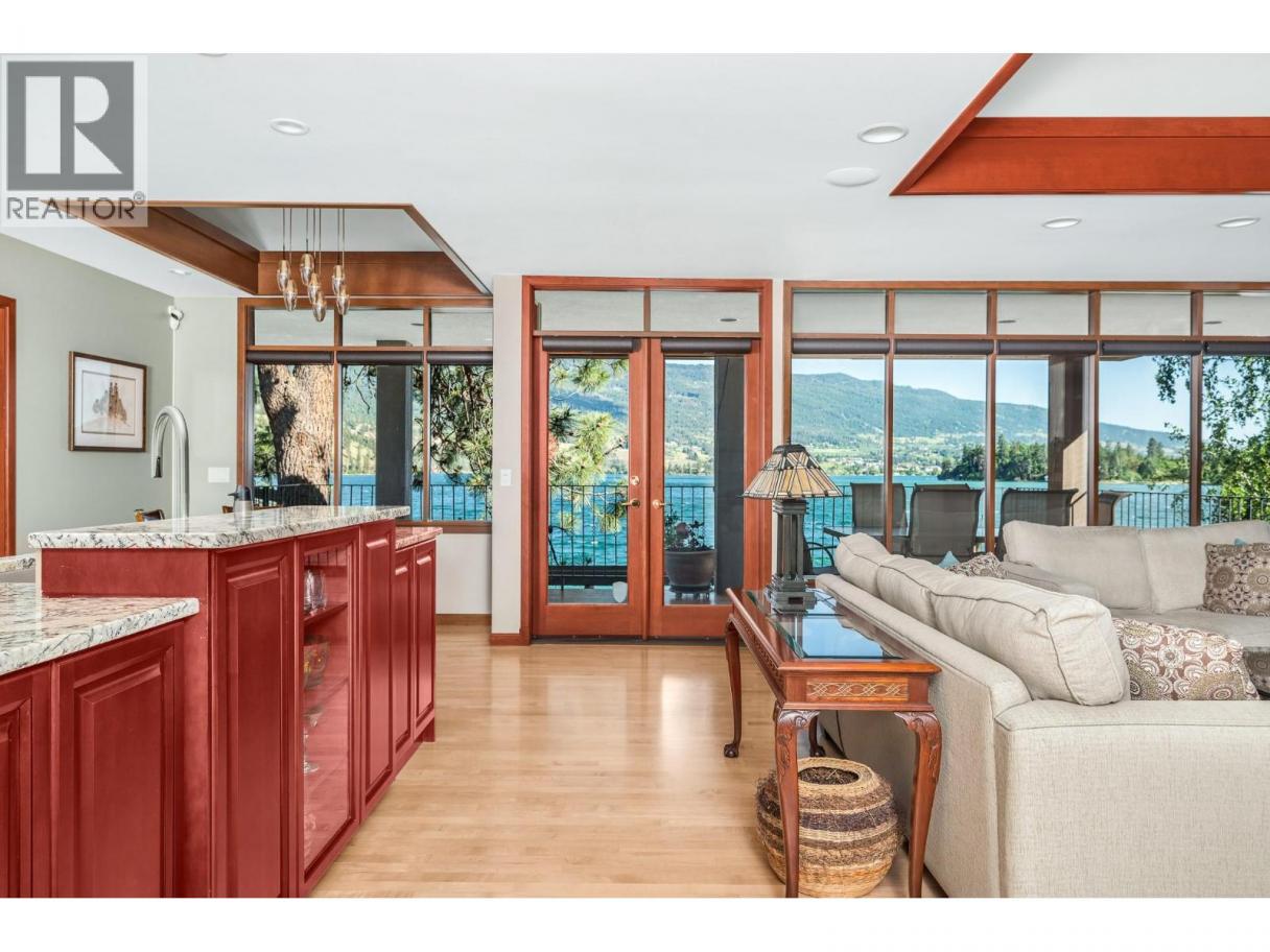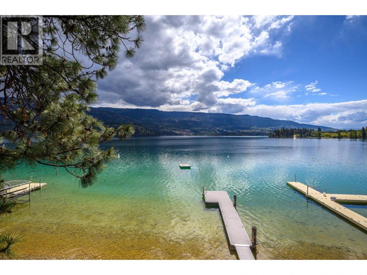 More than a home–this is a lifestyle! Behind privacy gates of Jade Bay Estates, this custom, architecturally designed home provides gracious comfort for you, extended family & guests. Mature landscaping with private courtyard garden & 72 ft of level, swim-ready beach on beautiful turquoise Kalamalka Lake. Excellent dock & anchored float. The main level is designed for one-level living with Great Room that opens to the deck, elegant primary bedroom with spa-like ensuite, formal dining room, cabinets with mahogany finish and granite counters with Butler's pantry, lakeview office, powder room and custom laundry. High end finishes in timeless traditional decor with elevated coffered ceilings, walls of wrap-a-round windows and custom built-ins. The lower level, a fully self-contained suite, repeats all the main floor comforts but in lighter deco rand enjoys private access to the covered patio. The Bonus wing can expand the suite space on the lower level, perhaps a home gym, or lock-off to become a private guest/nanny suite with own bath & access to the patio. Rough-in for laundry & kitchenette! Near level parking & a double garage w/built-in storage. Separate entrance to heated shop & storage. Only 10 exclusive bare land strata homes enjoy the lighted cul-de-sac &greenspace that is Jade Bay Estates. This waterfront serenity is adjacent to the Rail Trail, and minutes from Lake Country, parks, golf & wineries! Kelowna international airport and UBCO are just 20 min away. (id:6769)