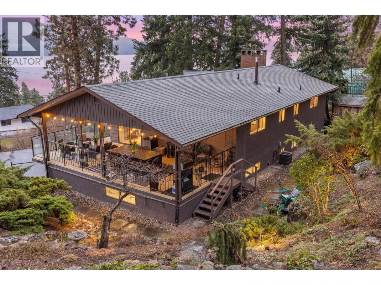 OPEN HOUSE SATURDAY 1PM - 3PM. Unique and surrounded by nature, this home offers a private retreat setting where you can truly recharge and refresh—while still being close to everything. Set on a quiet no-thru road with mature trees on a 0.37-acre lot, enjoy lake and mountain views and the peace that comes with this tucked-away location. The home features 3 bedrooms and 3 baths, a living room with a gas fireplace, and a dining room with lake views. Directly off the eat-in kitchen, you'll step outside to the huge covered deck—ideal for relaxing, entertaining friends and family, and soaking in the views. Outside, you’ll appreciate the multiple private outdoor seating areas, thoughtfully integrated into the landscaping for privacy and connection to nature. A double car garage is complemented by a gated driveway with space for a small RV, offering excellent parking and flexibility. One of the best parts about living here is being close to Kalamoir Regional Park, a local favourite for lakeside trails, beach time, and peaceful walks along the water. You’re also just minutes from the Westside Wine Trail, perfect for spontaneous tastings and patio afternoons. Click 3D Tour Link for all photos, house walkthrough and downloadable floorplans. (id:6769)
