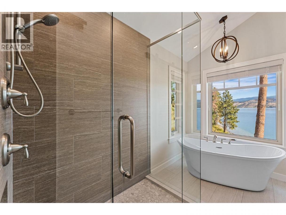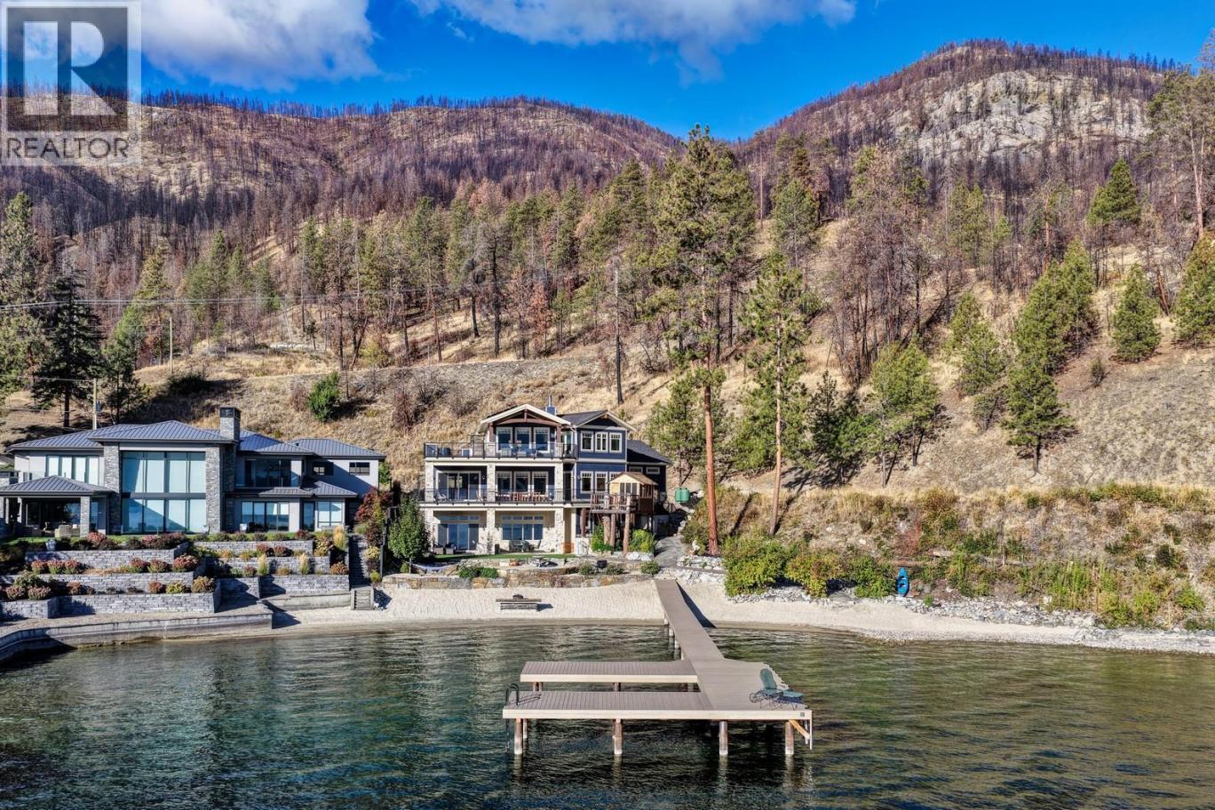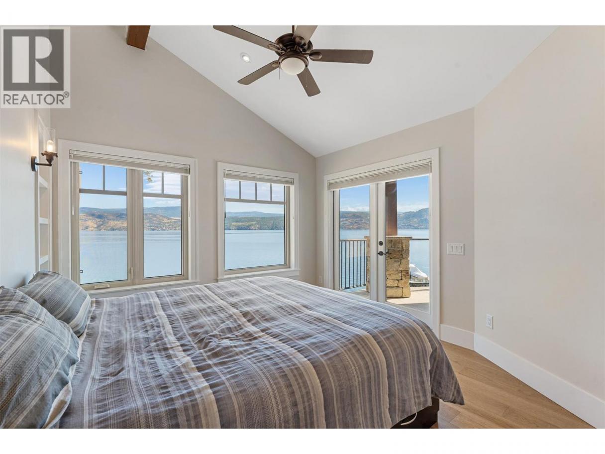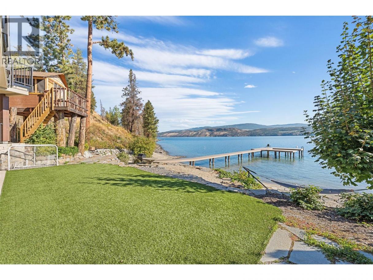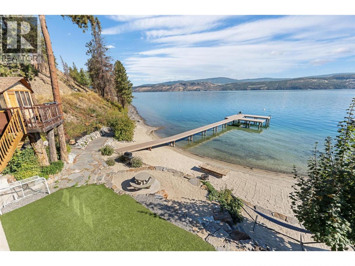 Experience one of the Okanagan’s most desirable waterfront settings with a serene, sandy bay, 120 ft. of pristine shoreline and some of the best sand in the valley, both on shore and beneath the water. This exquisite, turn-key home captures the essence of lakeside luxury, offering panoramic views, timeless architecture, and a relaxed sophisticated style throughout. Inside, the open-concept main level showcases soaring vaulted ceilings, exposed beams, and a stunning limestone fireplace that anchors the great room. The gourmet kitchen features granite countertops, a large central island with seating for six, and premium KitchenAid appliances, flowing seamlessly to the dining area and lakeview deck. A secondary primary suite on this level includes a spa-inspired ensuite and walkout access to the covered patio. Upstairs, the primary retreat impresses with vaulted ceilings, a private deck, a freestanding tub framed by lake views, and a spacious walk-in closet. The family room and wet bar extend to a partially covered terrace with a two-person spa — ideal for sunset evenings. The lower level is designed for entertaining, featuring a theatre with leather recliners, a full kitchenette, and walk-out access to multiple tiered patios that lead to the beach, new private dock, and charming treehouse lounge. Complete with solar panels, two-car garage with expoxy finish, and resort-style outdoor spaces, this residence defines refined Okanagan lakefront living. (id:6769)
