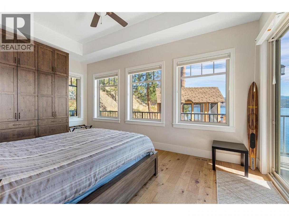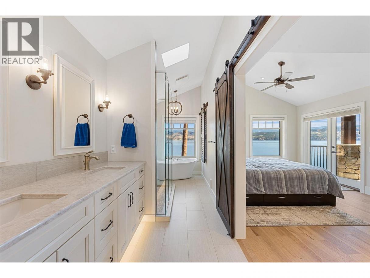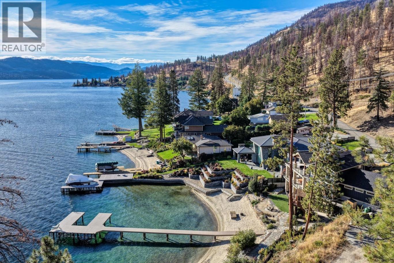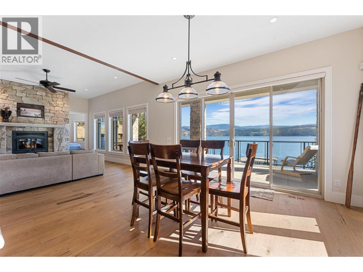 Experience one of the Okanagan’s most desirable waterfront settings with a serene, sandy bay, 120 ft. of pristine shoreline and some of the best sand in the valley, both on shore and beneath the water. This exquisite, turn-key home captures the essence of lakeside luxury, offering panoramic views, timeless architecture, and a relaxed sophisticated style throughout. Inside, the open-concept main level showcases soaring vaulted ceilings, exposed beams, and a stunning limestone fireplace that anchors the great room. The gourmet kitchen features granite countertops, a large central island with seating for six, and premium KitchenAid appliances, flowing seamlessly to the dining area and lakeview deck. A secondary primary suite on this level includes a spa-inspired ensuite and walkout access to the covered patio. Upstairs, the primary retreat impresses with vaulted ceilings, a private deck, a freestanding tub framed by lake views, and a spacious walk-in closet. The family room and wet bar extend to a partially covered terrace with a two-person spa — ideal for sunset evenings. The lower level is designed for entertaining, featuring a theatre with leather recliners, a full kitchenette, and walk-out access to multiple tiered patios that lead to the beach, new private dock, and charming treehouse lounge. Complete with solar panels, two-car garage with expoxy finish, and resort-style outdoor spaces, this residence defines refined Okanagan lakefront living. (id:6769)