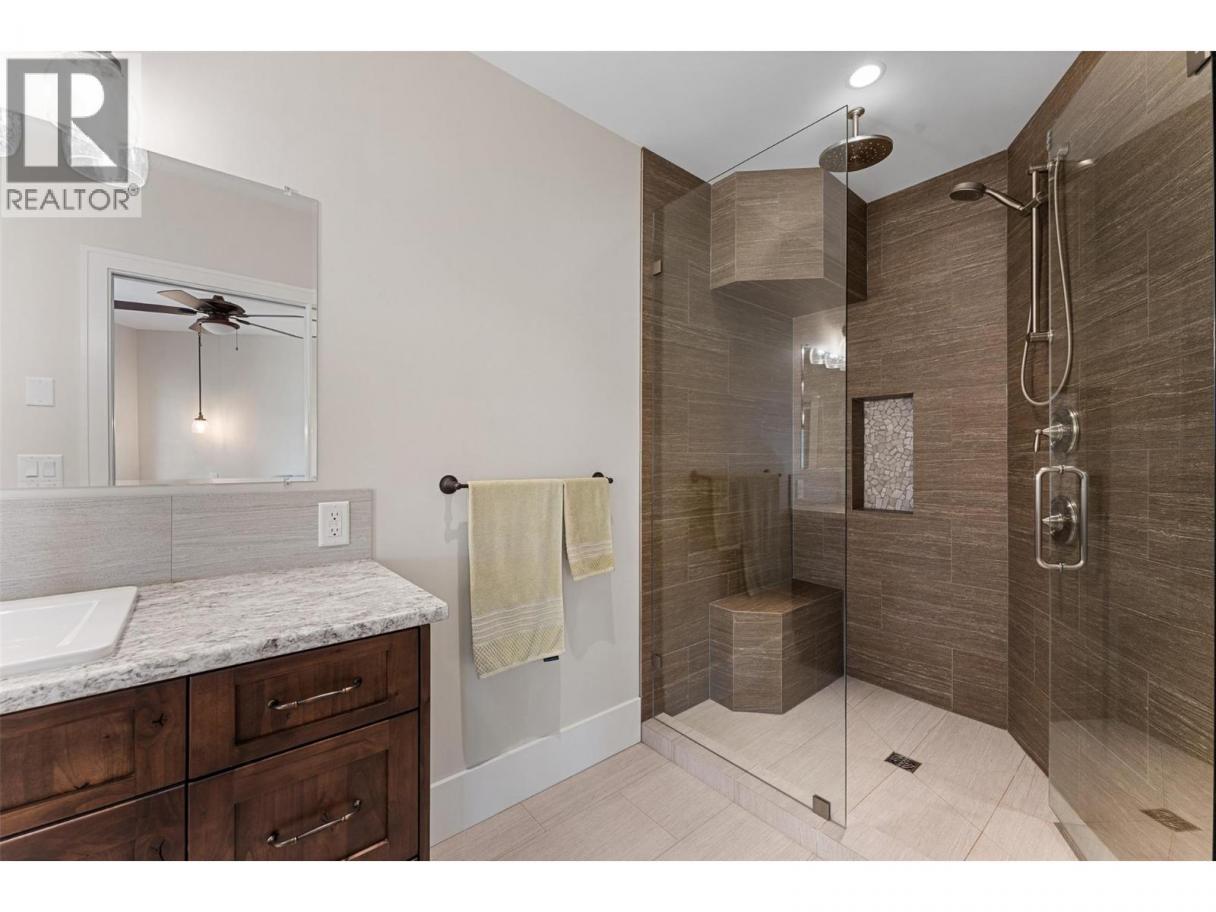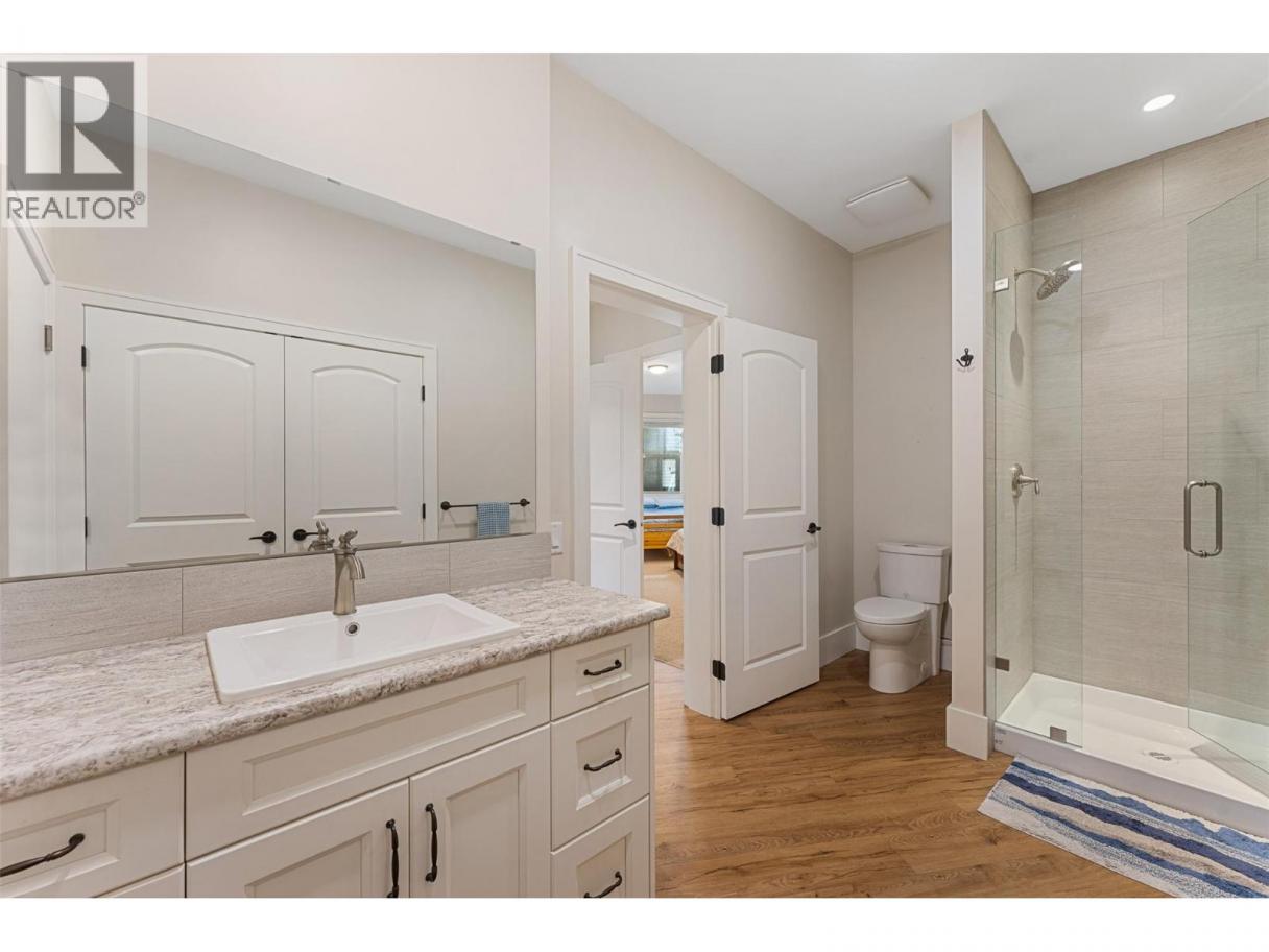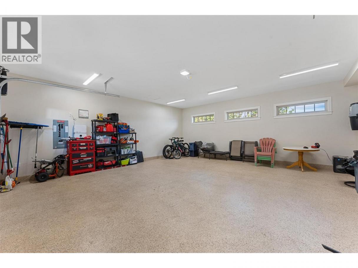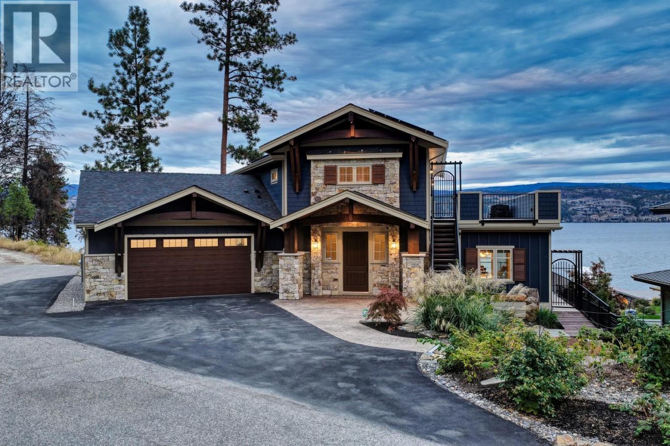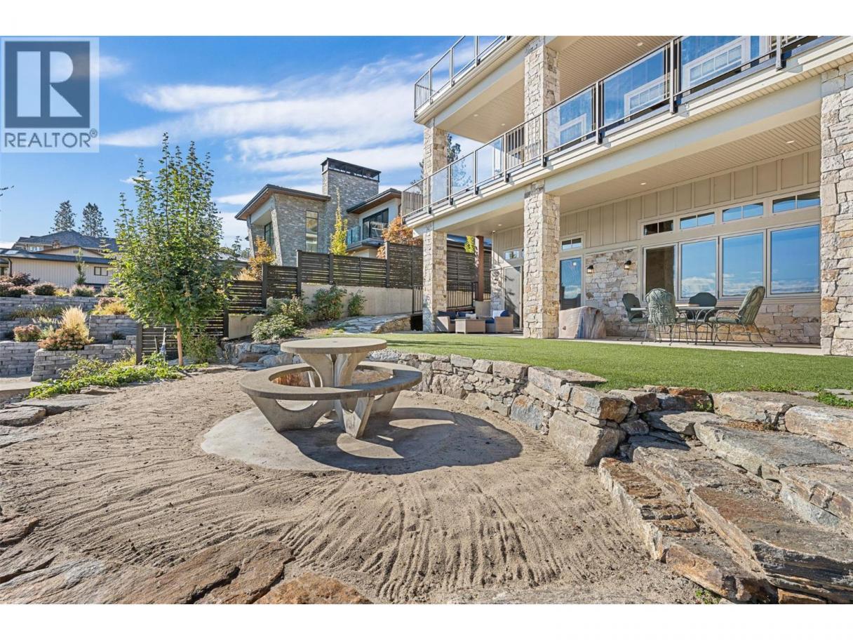 Experience one of the Okanagan’s most desirable waterfront settings with a serene, sandy bay, 120 ft. of pristine shoreline and some of the best sand in the valley, both on shore and beneath the water. This exquisite, turn-key home captures the essence of lakeside luxury, offering panoramic views, timeless architecture, and a relaxed sophisticated style throughout. Inside, the open-concept main level showcases soaring vaulted ceilings, exposed beams, and a stunning limestone fireplace that anchors the great room. The gourmet kitchen features granite countertops, a large central island with seating for six, and premium KitchenAid appliances, flowing seamlessly to the dining area and lakeview deck. A secondary primary suite on this level includes a spa-inspired ensuite and walkout access to the covered patio. Upstairs, the primary retreat impresses with vaulted ceilings, a private deck, a freestanding tub framed by lake views, and a spacious walk-in closet. The family room and wet bar extend to a partially covered terrace with a two-person spa — ideal for sunset evenings. The lower level is designed for entertaining, featuring a theatre with leather recliners, a full kitchenette, and walk-out access to multiple tiered patios that lead to the beach, new private dock, and charming treehouse lounge. Complete with solar panels, two-car garage with expoxy finish, and resort-style outdoor spaces, this residence defines refined Okanagan lakefront living. (id:6769)