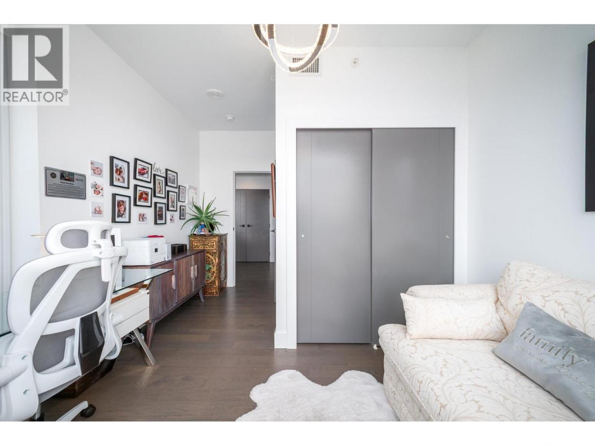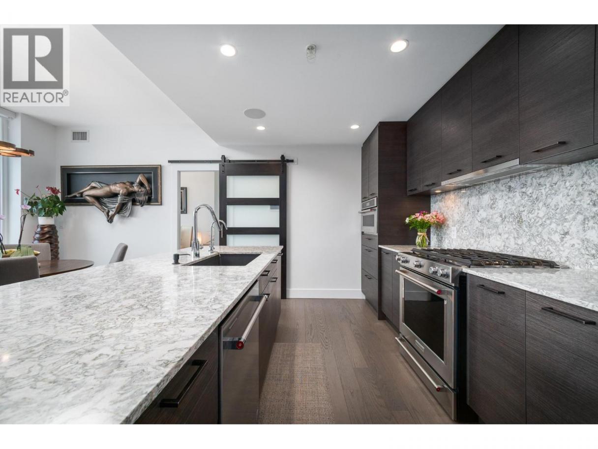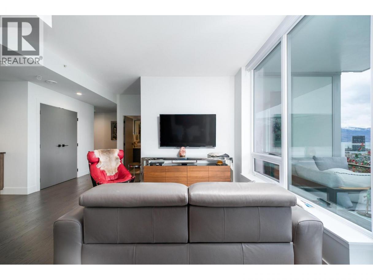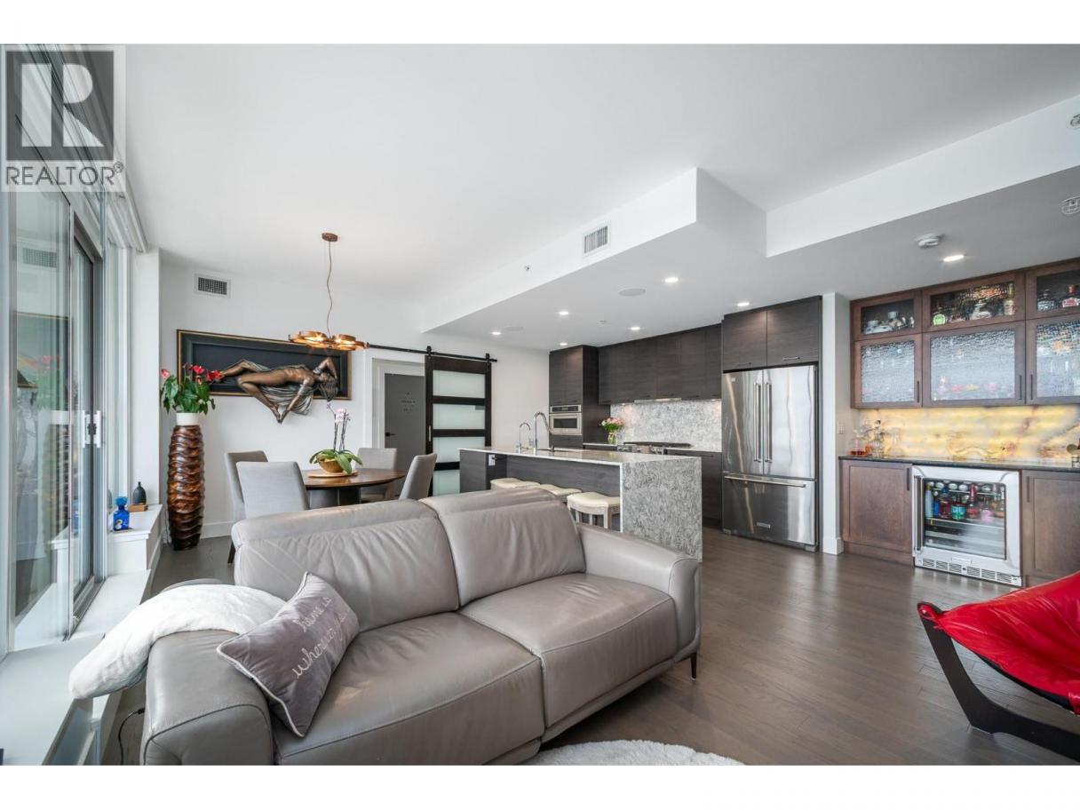 Perched on the 21st floor, this upgraded residence offers exceptional privacy and sweeping views from a large outdoor deck designed for entertaining and relaxation with a natural gas outlet and a truly unobstructed vantage point — a rare combination of elevation, privacy, and outdoor living. Inside, oak hardwood floors and floor-to-ceiling windows create a bright, refined living space that seamlessly blends modern design with smart functionality. The kitchen is a standout with waterfall-edge counters, granite sink, gas range, KitchenAid appliances and combi oven. A built-in bar with dual-zone KitchenAid beverage fridge adds an entertaining hub with a striking LED backlit onyx backsplash. Smart home features are integrated throughout, including touchscreen controls for lighting and music, along with built-in ceiling speakers in the kitchen and primary bedroom. Extra insulation along common walls enhances comfort and quiet. The primary suite offers a spacious walk-in closet and a stylish 3-piece ensuite with glass and tile shower. A generous second bedroom features large floor-to-ceiling windows and a full closet. The main bath includes a 4-piece layout with tile surround to the ceiling. Additional highlights include stacked laundry with added storage, and thoughtful upgrades throughout that elevate everyday living. Resort-style amenities including two pools, hot tub, fitness club with gym and yoga studio, pickleball court, dog park, BBQ and fire pit areas, and more! (id:6769)