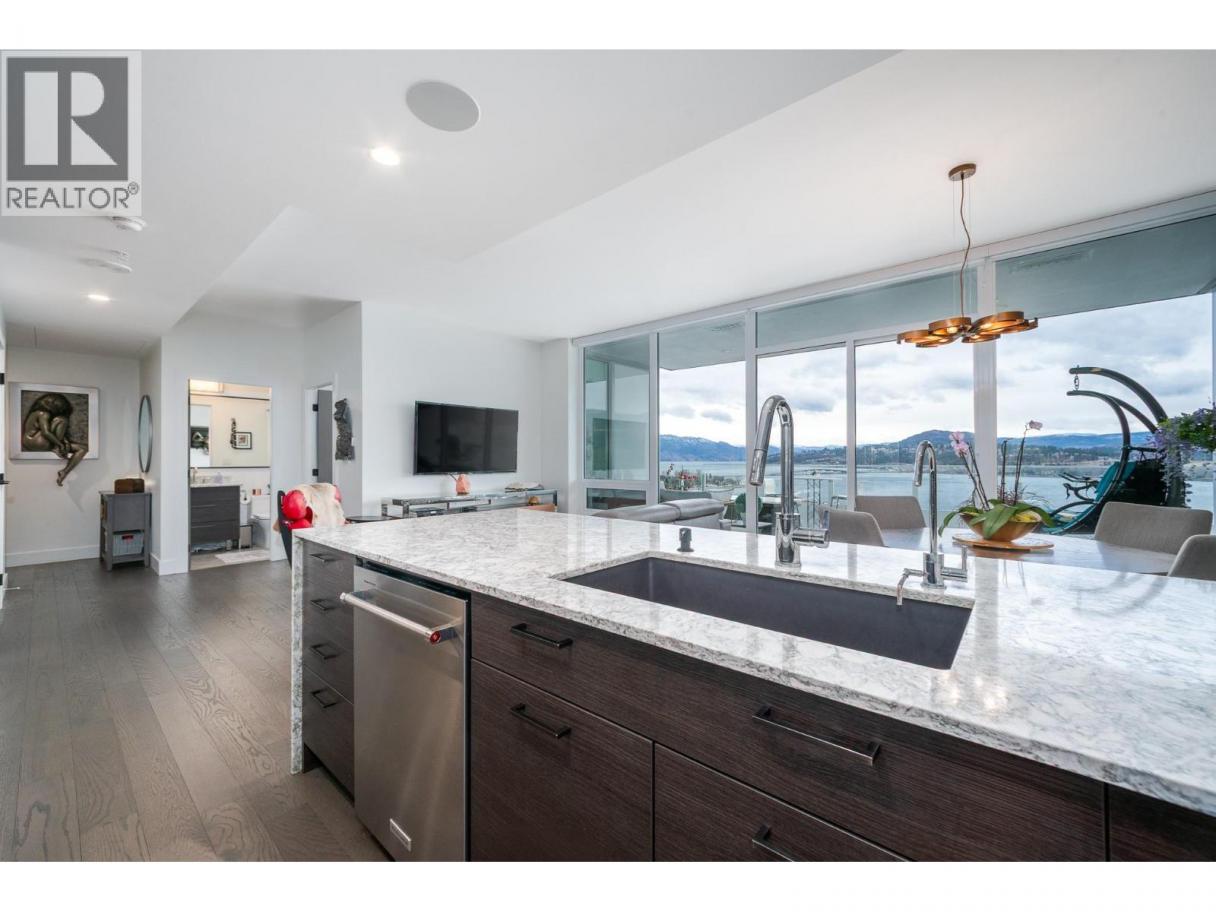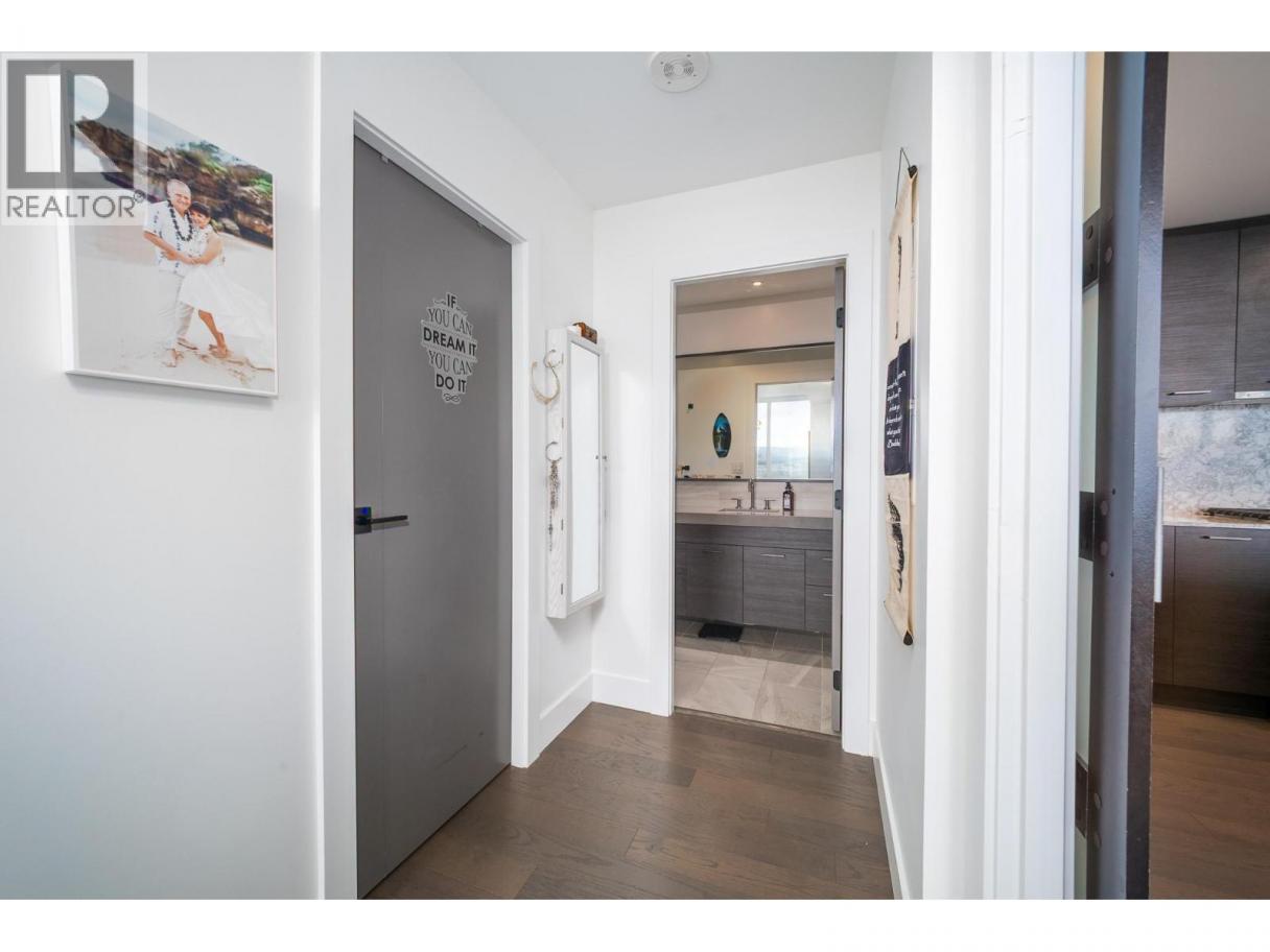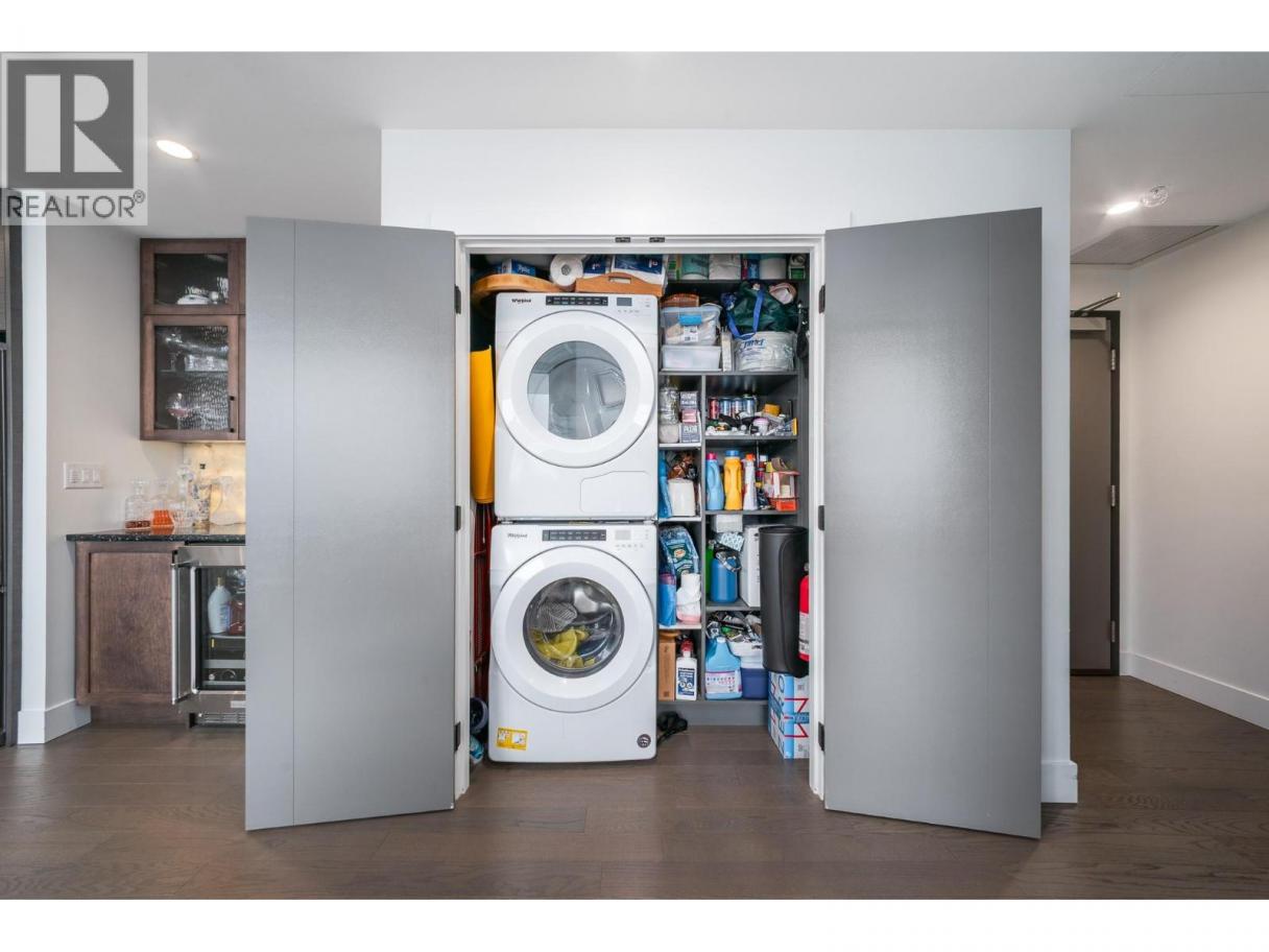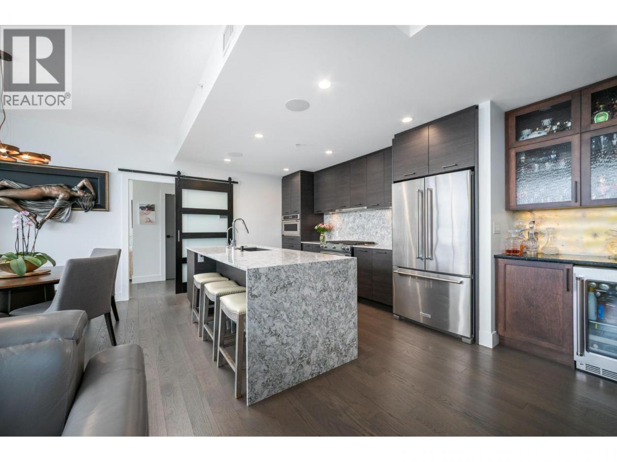 Perched on the 21st floor, this upgraded residence offers exceptional privacy and sweeping views from a large outdoor deck designed for entertaining and relaxation with a natural gas outlet and a truly unobstructed vantage point — a rare combination of elevation, privacy, and outdoor living. Inside, oak hardwood floors and floor-to-ceiling windows create a bright, refined living space that seamlessly blends modern design with smart functionality. The kitchen is a standout with waterfall-edge counters, granite sink, gas range, KitchenAid appliances and combi oven. A built-in bar with dual-zone KitchenAid beverage fridge adds an entertaining hub with a striking LED backlit onyx backsplash. Smart home features are integrated throughout, including touchscreen controls for lighting and music, along with built-in ceiling speakers in the kitchen and primary bedroom. Extra insulation along common walls enhances comfort and quiet. The primary suite offers a spacious walk-in closet and a stylish 3-piece ensuite with glass and tile shower. A generous second bedroom features large floor-to-ceiling windows and a full closet. The main bath includes a 4-piece layout with tile surround to the ceiling. Additional highlights include stacked laundry with added storage, and thoughtful upgrades throughout that elevate everyday living. Resort-style amenities including two pools, hot tub, fitness club with gym and yoga studio, pickleball court, dog park, BBQ and fire pit areas, and more! (id:6769)