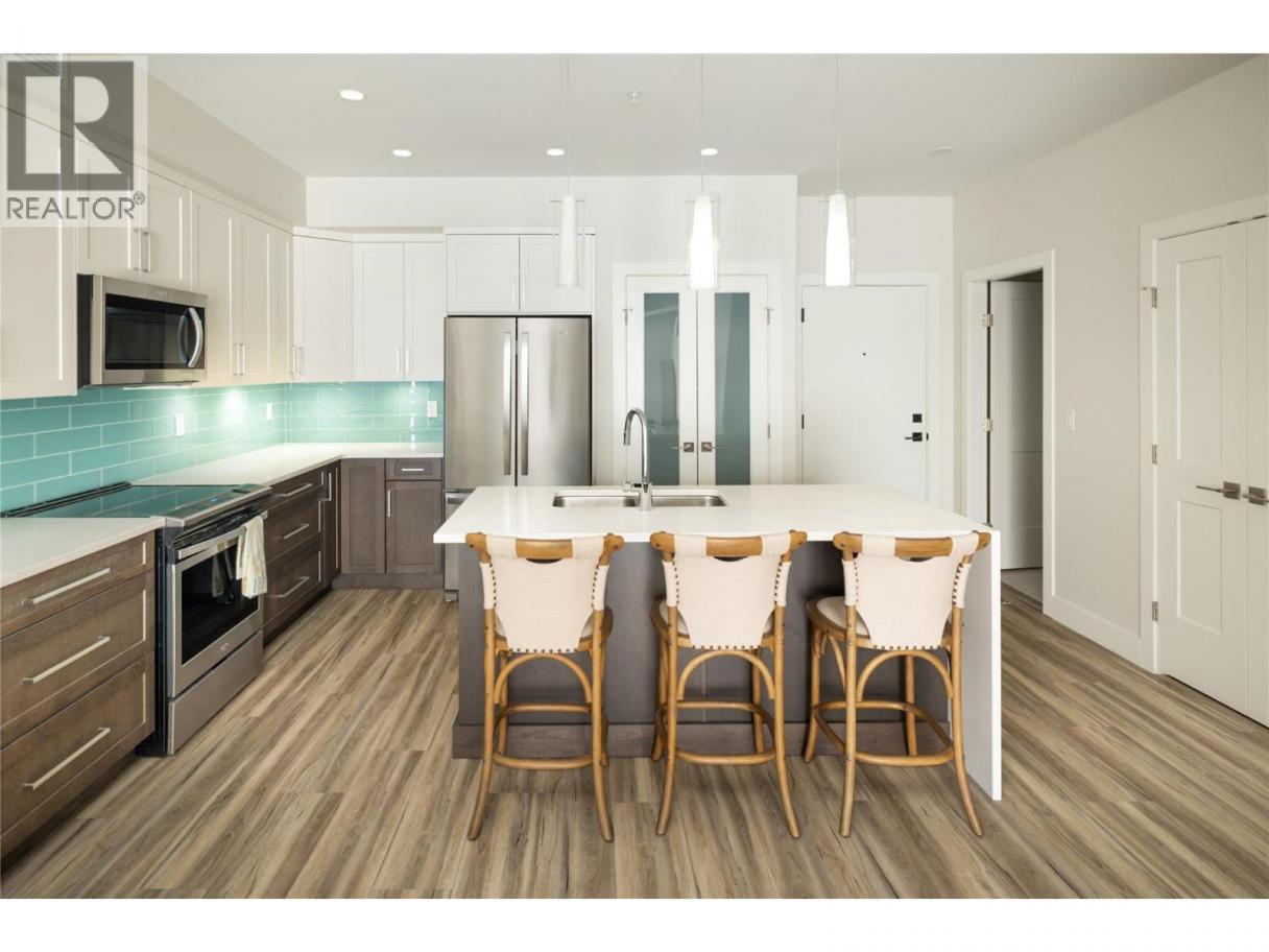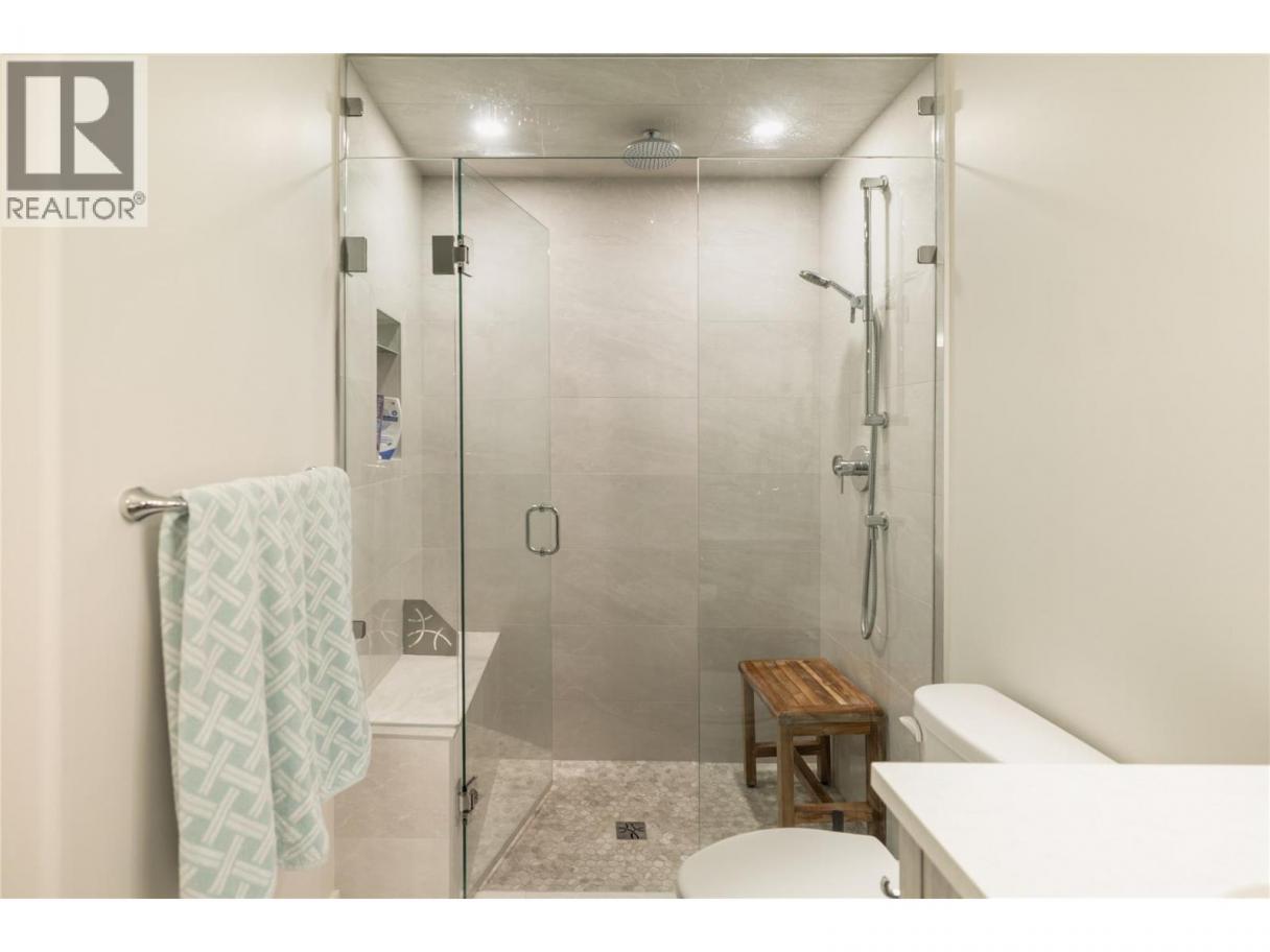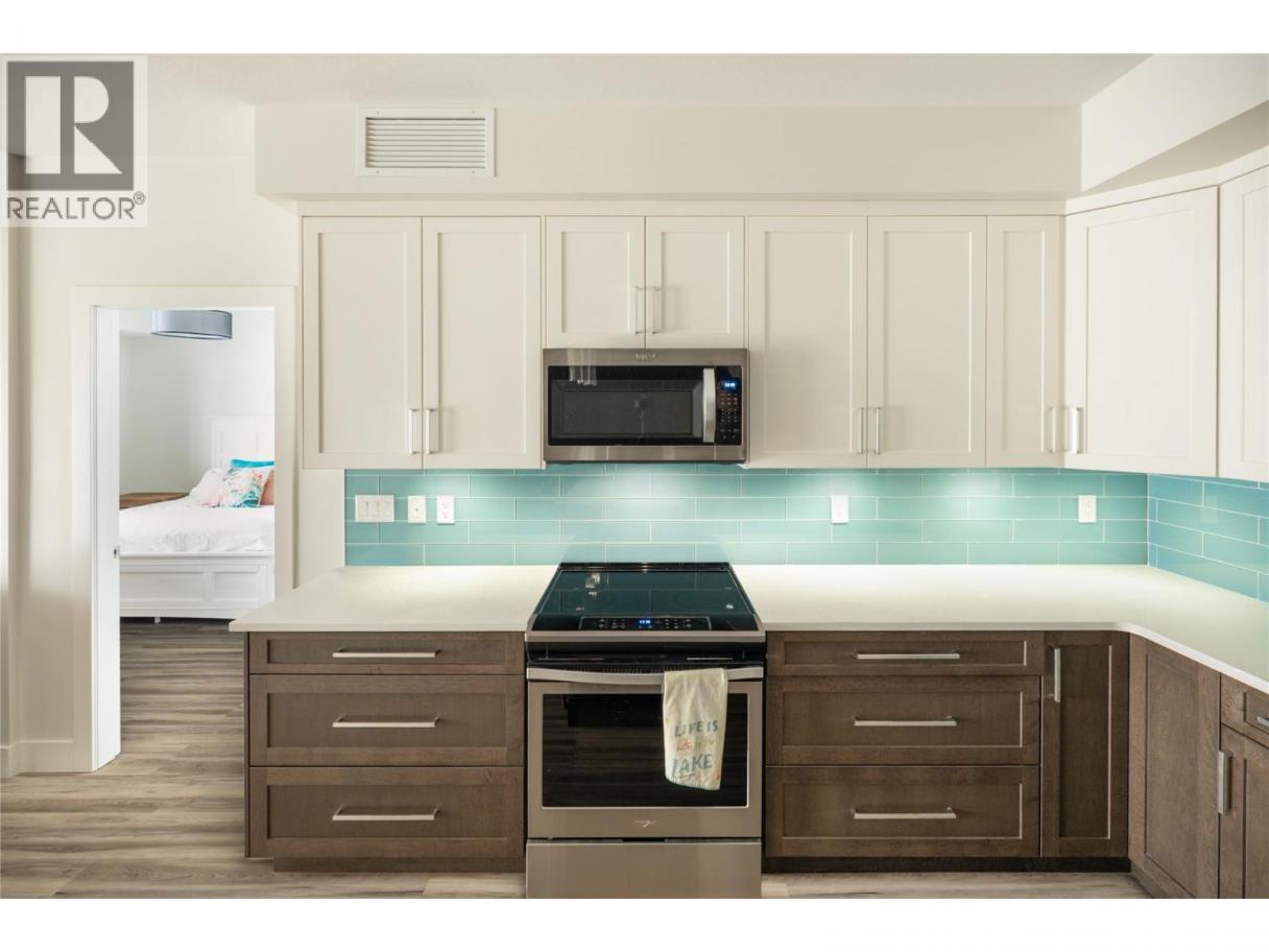 Perched above Okanagan Lake in the sought-after Granite community, this beautifully maintained 2 bedroom, 2 bathroom residence offers the rare opportunity to own a home that has been exceptionally lightly lived in. Proudly maintained by the original owners, the property has only been used periodically as a private retreat—resulting in a space that presents with remarkable care and pride of ownership throughout. The open-concept living area is designed to maximize both comfort and the surrounding views. A modern kitchen with large island, quartz countertops, stainless appliances, and stylish two-tone cabinetry flows seamlessly into the dining and living areas, creating an inviting space for everyday living and entertaining. Expansive windows and sliding doors draw the outdoors in, leading to a generous covered deck where sweeping lake and mountain views create a spectacular backdrop. The primary bedroom offers a peaceful retreat with lake views, a spacious ensuite with double vanity and steam shower, and ample closet space. A second bedroom and full bathroom provide flexibility for guests or a home office. Positioned on the fourth floor, the home enjoys elevated views and natural light, along with a rare oversized storage space—ideal for seasonal gear and additional convenience. Furnishings may be negotiated, offering the potential for a seamless, turn-key opportunity. (id:6769)