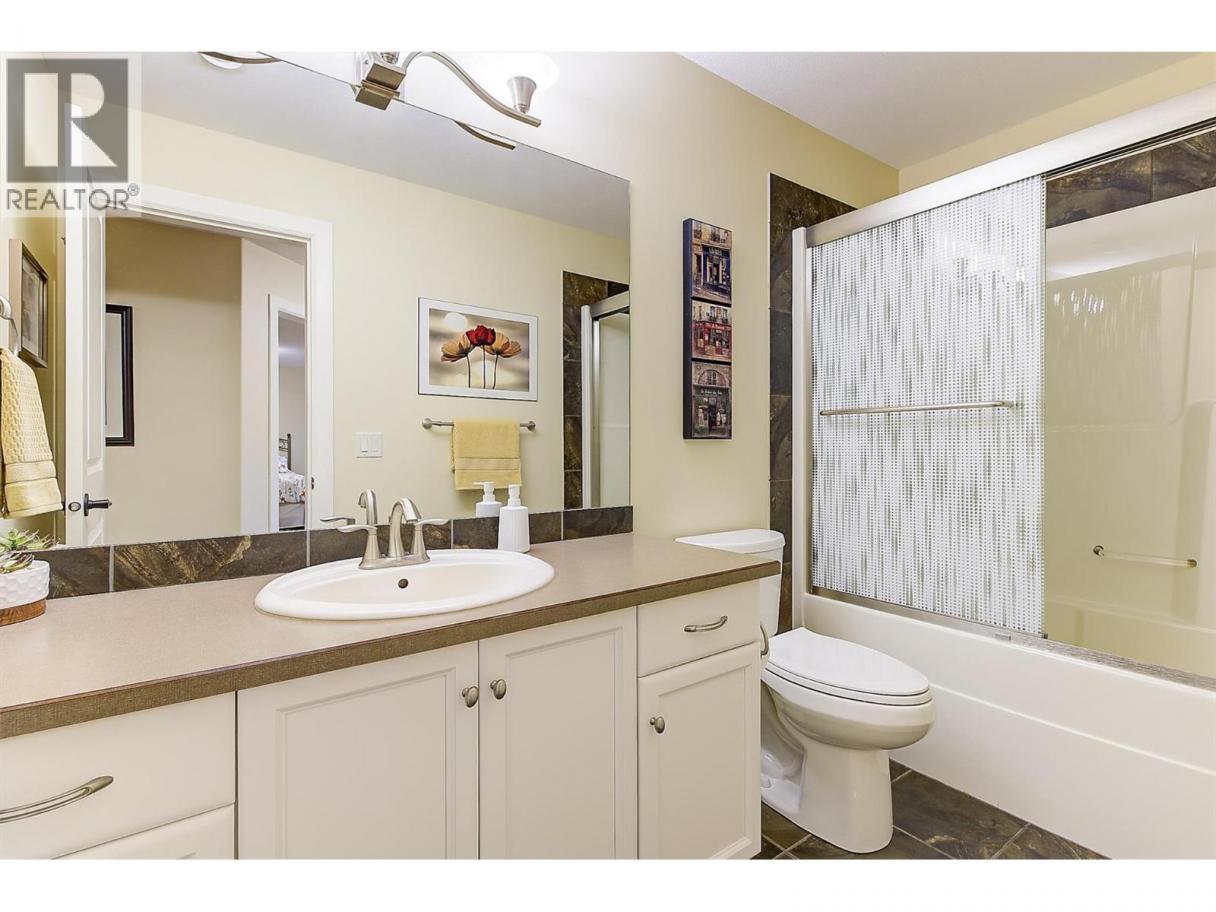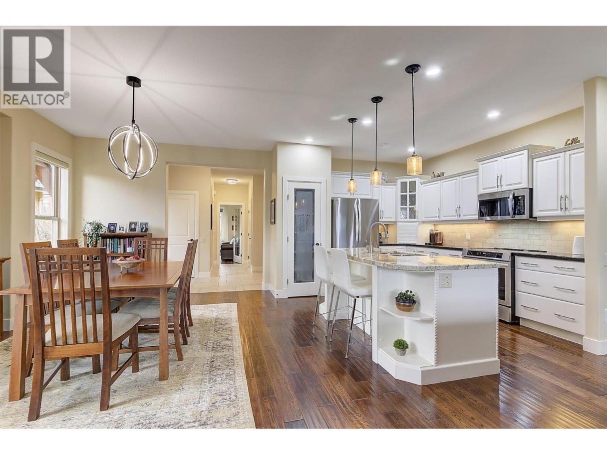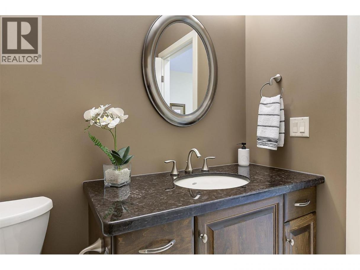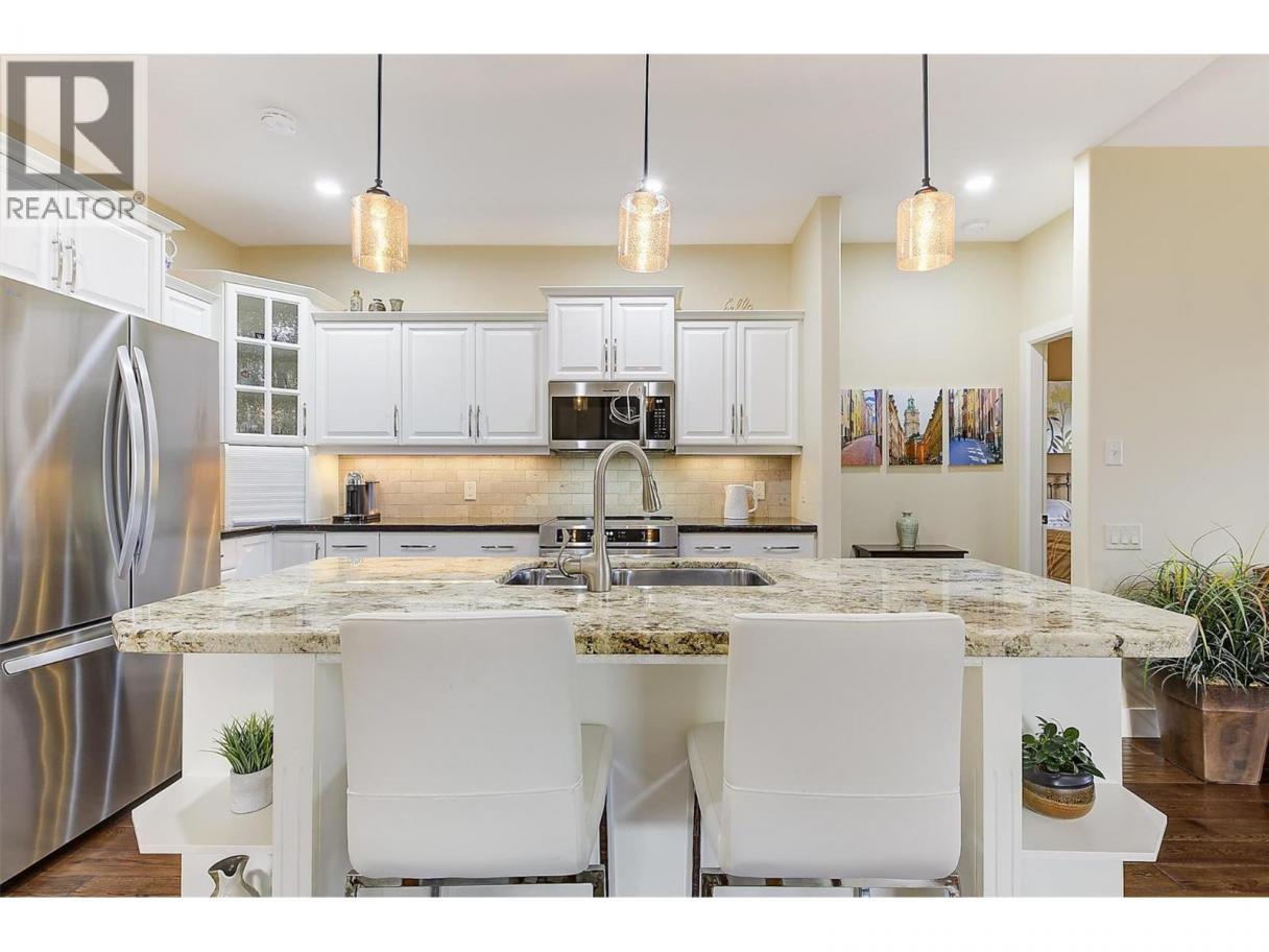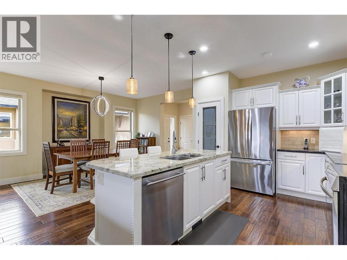 One of the largest homes in Sonoma Pines! This well maintained semi-detached home offers 3 bedrooms + den, 3 bathrooms, and a double car garage, just minutes from Okanagan Lake. Bright open concept main floor featuring a den, powder room, and spacious living/dining area. The kitchen impresses with granite countertops, a large island, pantry, and newer stainless steel appliances. The living room includes a gas fireplace and access to a view deck with motorized blinds and beautiful lake and mountain views. Main floor primary bedroom with walk-in closet and ensuite with double sinks and walk in shower. Laundry on the main with access to the oversized 400+ sq ft garage. Fully finished lower level includes a rec room with lake views and covered patio, 2 bedrooms, full bath, and hobby room (currently set up with free standing model train). Additional features: built-in vacuum, hot water tank (2022), recently serviced furnace, elegant main floor tiles, engineered hardwood flooring and new backyard rock wall (landscaping to be completed in Spring). Located in the desirable Sonoma Pines community at Two Eagles Golf Course, close to shopping, restaurants, and recreation. Clubhouse amenities include fitness room, library, billiards, and social spaces. RV & boat parking available. (id:6769)