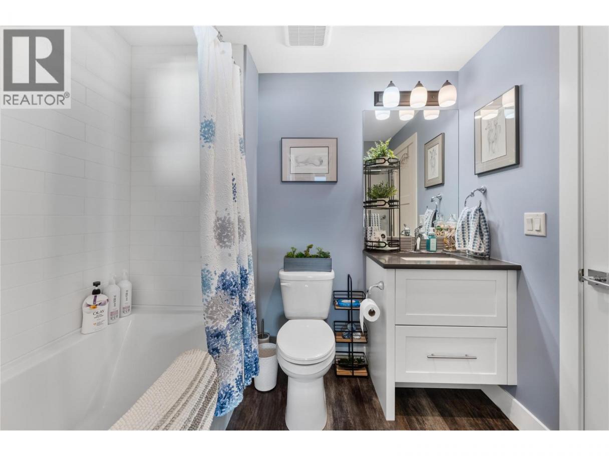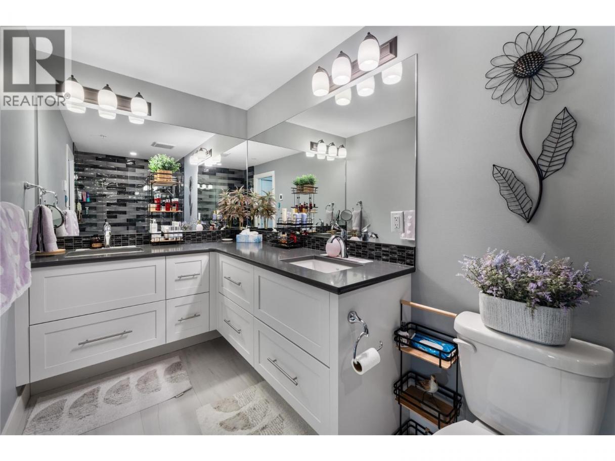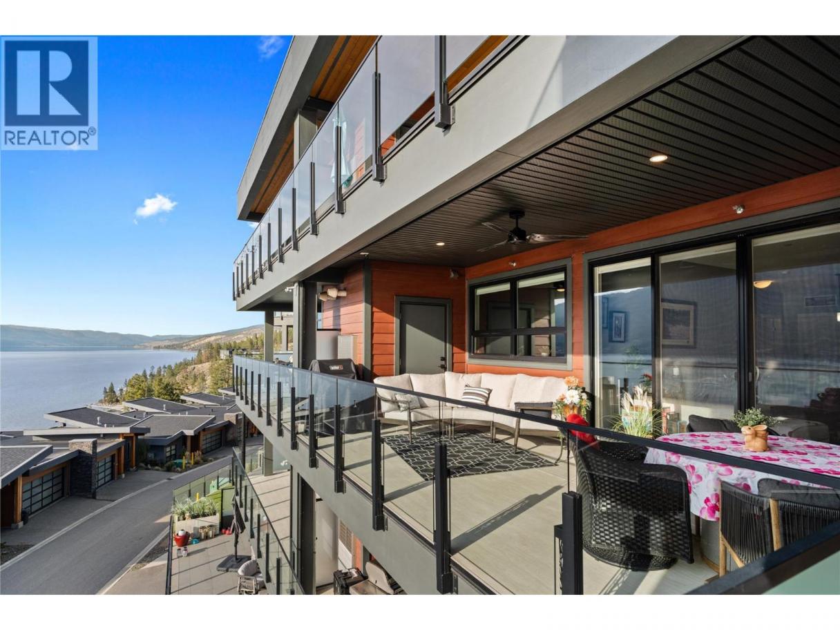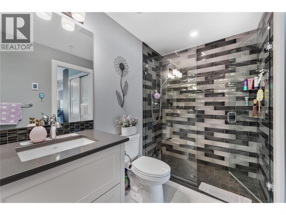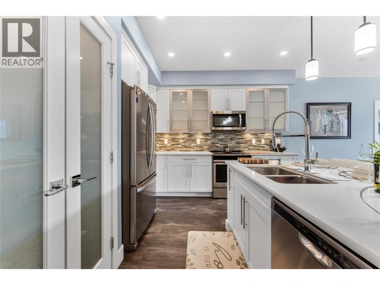 Stunning lakeview 2 bedroom, 2 bathroom condo offering two spacious balconies. This thoughtfully designed floorplan features custom finishes throughout, including over $30,000 in California Closets upgrades that add both function and a high-end, tailored feel. The chef inspired kitchen offers stainless steel appliances, custom cabinetry, a pantry, and a large island that anchors the open concept living and dining space, complete with a Dimplex electric fireplace and ideal for entertaining. The primary bedroom offers a private retreat with a beautifully appointed ensuite featuring a generous walk in shower, along with access to a covered deck perfect for morning coffee with breathtaking lake views. A second full bathroom with a bathtub provides comfort for guests or family. Enjoy year round comfort with forced air heating, central air conditioning, and on demand hot water, complemented by a fresh, modern designer colour palette that shows like new. An oversized storage locker on the same floor adds everyday convenience. At Granite, residents enjoy a rooftop hot tub outdoor pool, plus full access to McKinley Beach amenities including a marina, fitness centre, courts, gardens, and the Our Place Amenity Centre. Located 15 minutes to the airport, 20 minutes to downtown Kelowna, and 6 minutes to Glenmore shopping, this home offers the perfect blend of luxury, convenience, and lakeside living. (id:6769)