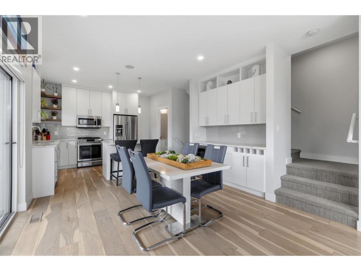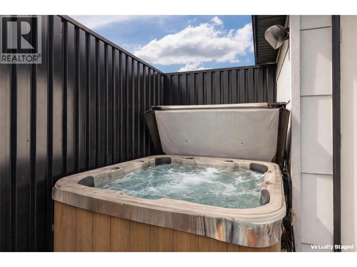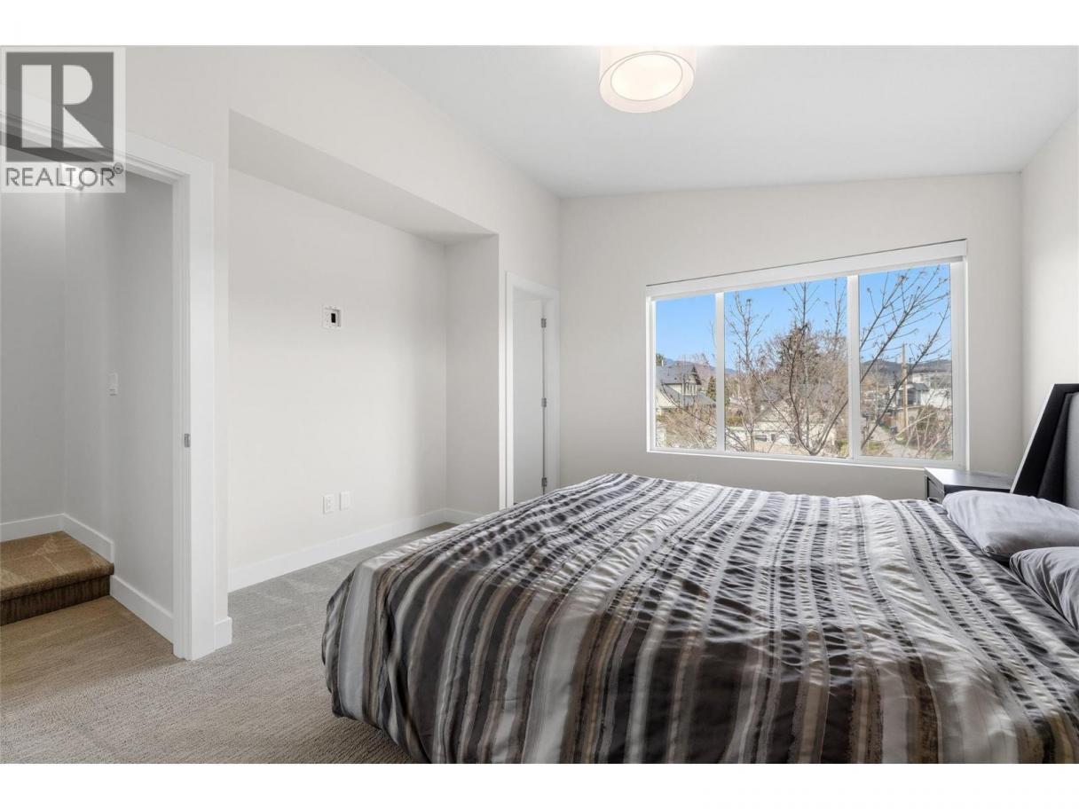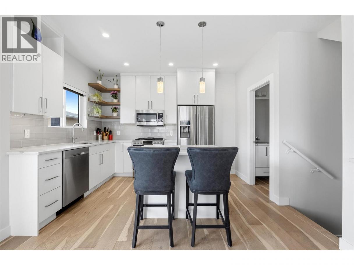Situated in sought after KELOWNA SOUTH, close to the amenity rich SOUTH PANDOSY (""SOPA"") neighbourhood, you'll love the convenience of this INCREDIBLE LOCATION and the brilliance of this PERFECT HOME. This home ""checks all the boxes"" as it includes a PRIVATE ROOFTOP DECK (with hot-tub), a SECURE GARAGE, an AMENITY RICH LOCATION and a PERFECT FLOOR PLAN. Inside you'll love the open concept design, modern paint colors (freshly painted) and high end finishings. The kitchen is stunning; offering lots of cabinet & counter space (quartz counter-tops), stainless steel appliances, plus beautiful hardware and backsplash. A built-in dining room bar (with wine fridge) and an oversize living room provide an ideal space for entertaining. Easily accessed from the kitchen is an oversize deck, ideal for BBQing or a morning coffee. The second floor offers 2 bedrooms and 2 bathrooms, plus laundry. The primary bedroom retreat includes a walk in closet and a gorgeous ensuite. Go up a few stairs and you're sure to be impressed by the private rooftop deck. The rooftop deck provides great views, is plumbed with gas (for bbq), includes a hot-tub, and offers room for most any patio furniture set. Downstairs, the lower level provides a FULL WASHROOM plus a huge and open space offering lots of options (media room, games room, or perhaps you add a 3rd bedroom). Extras include brand new paint, tankless hot water heater, quartz counters throughout, no pet restrictions and a low monthly $100 strata fee. (id:6769)