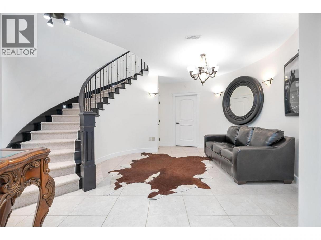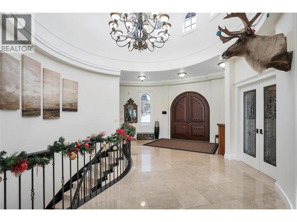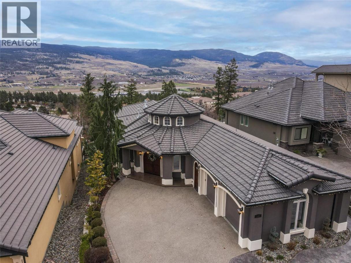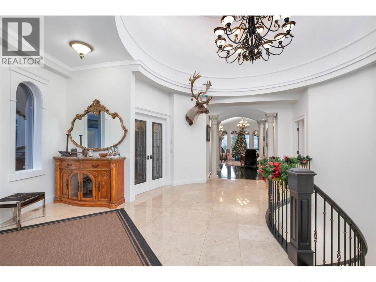 Welcome to an exceptional residence where timeless elegance meets breathtaking scenery. Enter through the grand rotunda foyer and be immediately drawn into the expansive living room, an architectural showpiece with high ceilings and walls of windows framing uninterrupted valley and mountain views. Designed for both refined entertaining and everyday luxury, the chef’s kitchen is a true centerpiece featuring an oversized island and stainless steel appliances. The adjoining dining room easily accommodates large gatherings while enjoying stunning outlooks. The primary suite is a private retreat offering walk-out access, sweeping vistas, and a spa-inspired ensuite finished in granite and tile, complete with a Jacuzzi soaker tub, bidet, and walk-in closet, creating an ideal sanctuary at day’s end. A dedicated office and a second bedroom or guest suite with a multi-jetted shower complete the upper level. A curved custom staircase leads to the finished walk-out lower level, offering a spacious recreation room, entertainment kitchen and bar, theatre room, gym space, two additional bedrooms, and a full bathroom. Outdoors, covered patios and a fountain-accented backyard provide the perfect setting for entertaining or quiet relaxation. Ideally located near golf courses like The Okanagan Golf Club, parks and trails, and everyday amenities, with convenient access to YLW, this home offers luxury, scale, and unforgettable views in a highly sought-after setting. Make it yours today! (id:6769)