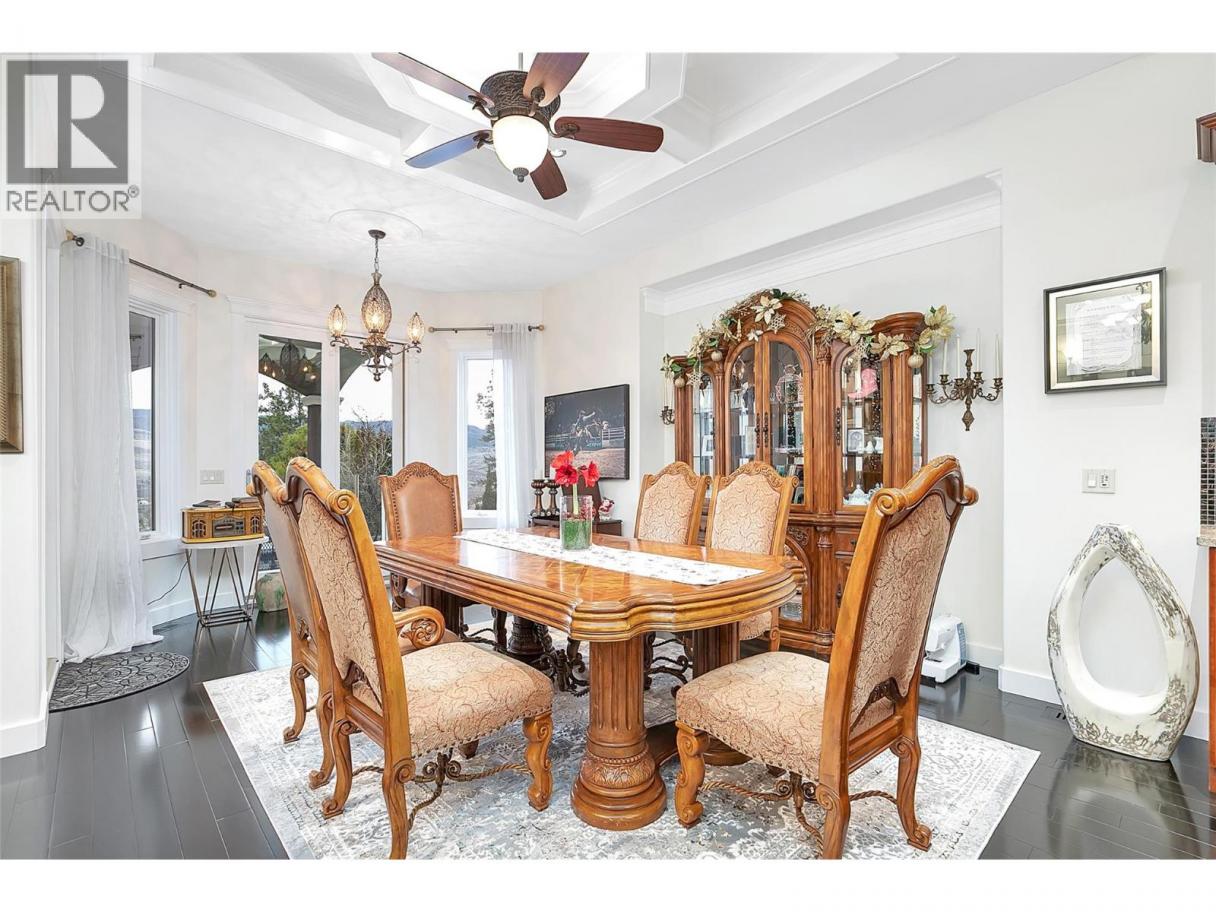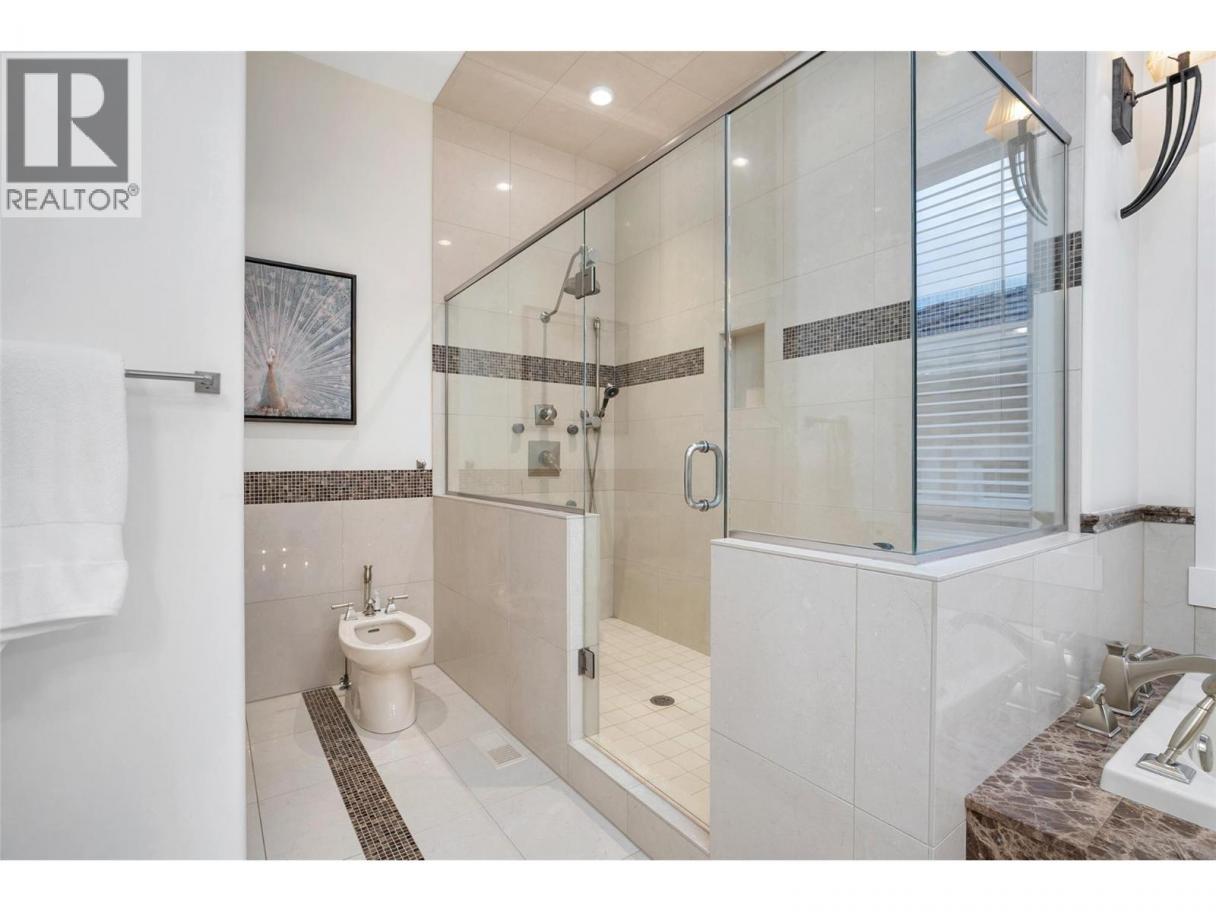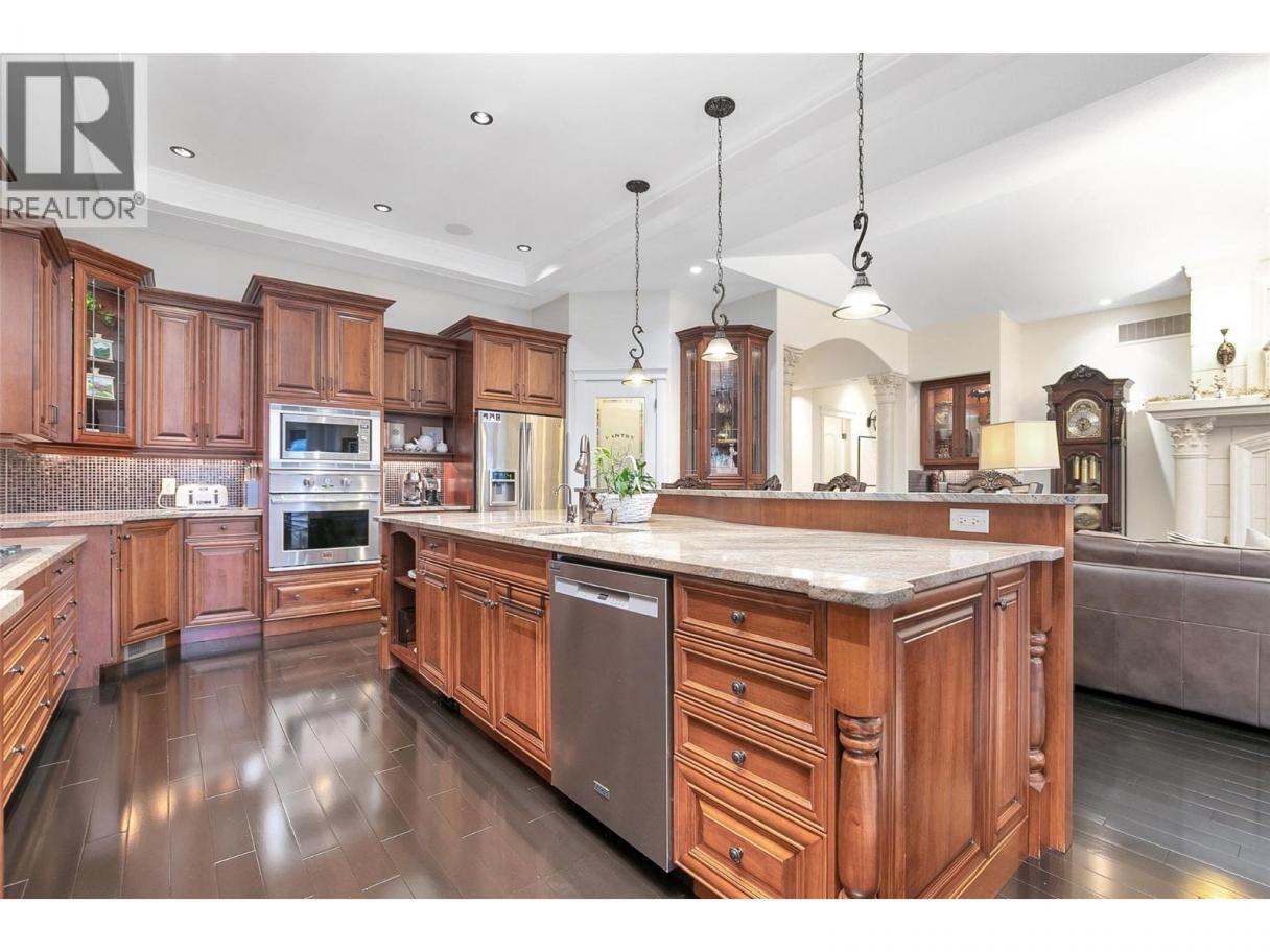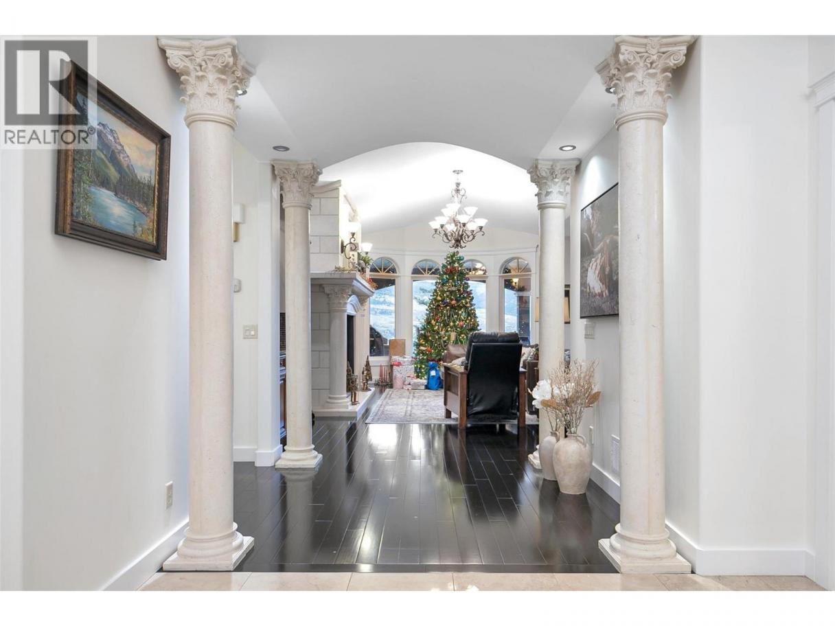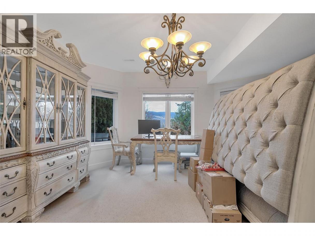 Welcome to an exceptional residence where timeless elegance meets breathtaking scenery. Enter through the grand rotunda foyer and be immediately drawn into the expansive living room, an architectural showpiece with high ceilings and walls of windows framing uninterrupted valley and mountain views. Designed for both refined entertaining and everyday luxury, the chef’s kitchen is a true centerpiece featuring an oversized island and stainless steel appliances. The adjoining dining room easily accommodates large gatherings while enjoying stunning outlooks. The primary suite is a private retreat offering walk-out access, sweeping vistas, and a spa-inspired ensuite finished in granite and tile, complete with a Jacuzzi soaker tub, bidet, and walk-in closet, creating an ideal sanctuary at day’s end. A dedicated office and a second bedroom or guest suite with a multi-jetted shower complete the upper level. A curved custom staircase leads to the finished walk-out lower level, offering a spacious recreation room, entertainment kitchen and bar, theatre room, gym space, two additional bedrooms, and a full bathroom. Outdoors, covered patios and a fountain-accented backyard provide the perfect setting for entertaining or quiet relaxation. Ideally located near golf courses like The Okanagan Golf Club, parks and trails, and everyday amenities, with convenient access to YLW, this home offers luxury, scale, and unforgettable views in a highly sought-after setting. Make it yours today! (id:6769)