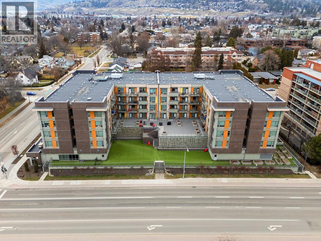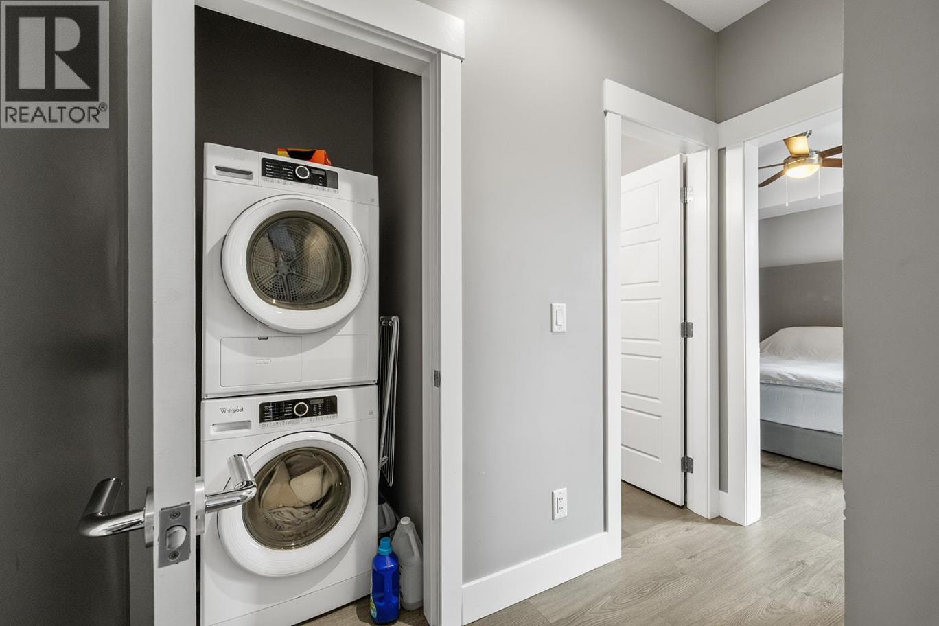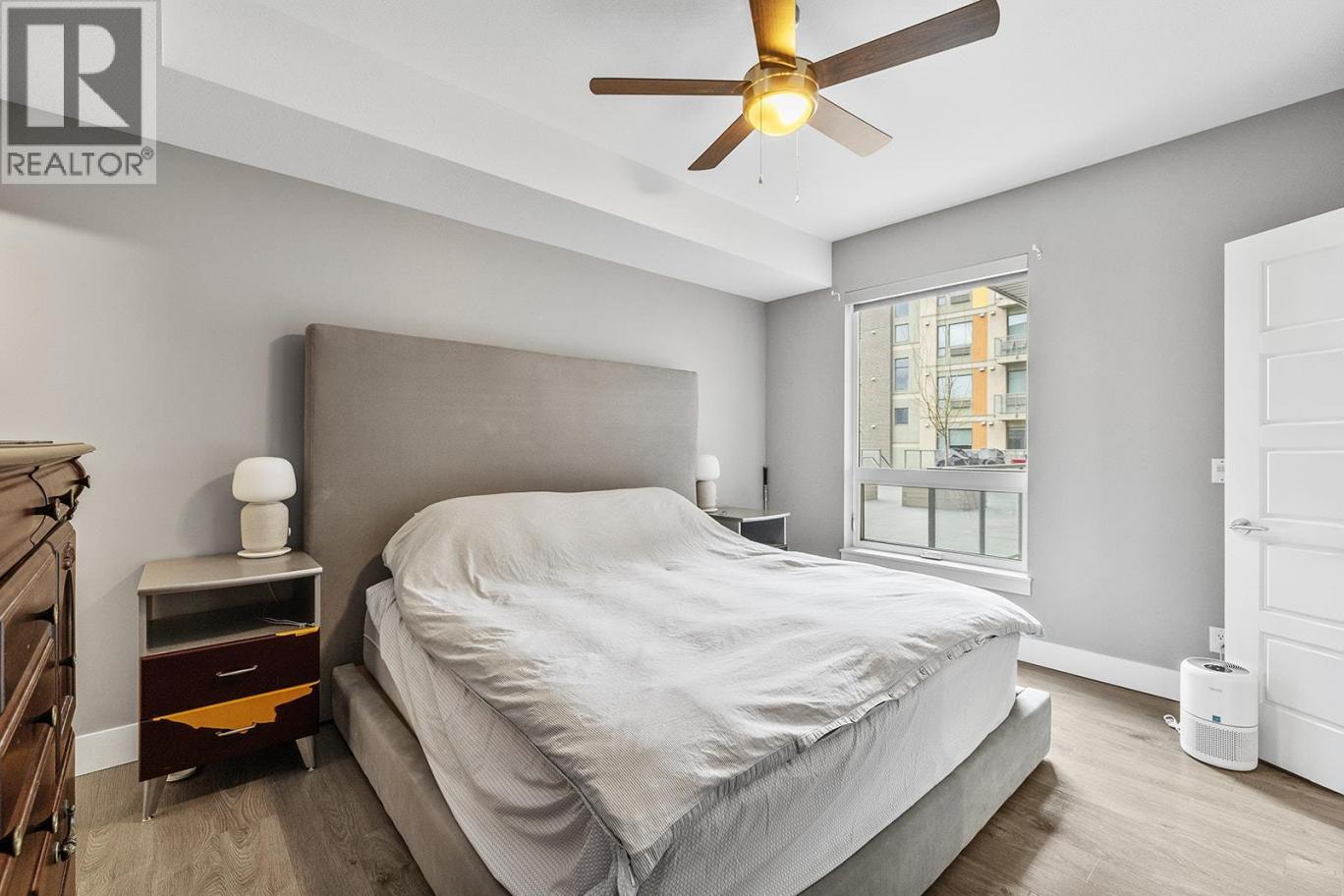 SHORT TERM RENTAL FRIENDLY - One of only 8 larger floorplans in this newer, modern building—this is a rare opportunity to secure extra space in a prime central location. Proudly offered by the original owner, this home has been gently lived in part-time and shows beautifully. The layout is functional and open, with generous room sizes throughout. Featuring 2 bedrooms (second bedroom includes a full closet, no window) and 2 full bathrooms, the space is ideal for a variety of living setups. The south-facing exposure brings in great natural light, complemented by mountain views that add to the overall feel. Thoughtful upgrades include additional in-suite storage and a storage locker. 2 parking stalls is also a rare find at this price point! Residents enjoy access to a well-equipped fitness room, social/games room, and outdoor space with BBQs—everything you need, right at home. Step outside and you’re minutes to downtown, beaches, parks, shopping, and dining. Walk or bike with ease—Ethel Street offers direct access to the Rail Trail, and you’re close to Capri Centre, Orchard Park, transit, and the Bennett Bridge. Pet-friendly (2 cats or dogs up to 25lbs, no dangerous breeds). Short term rentals are permitted with a minimum stay of one week. (id:6769)