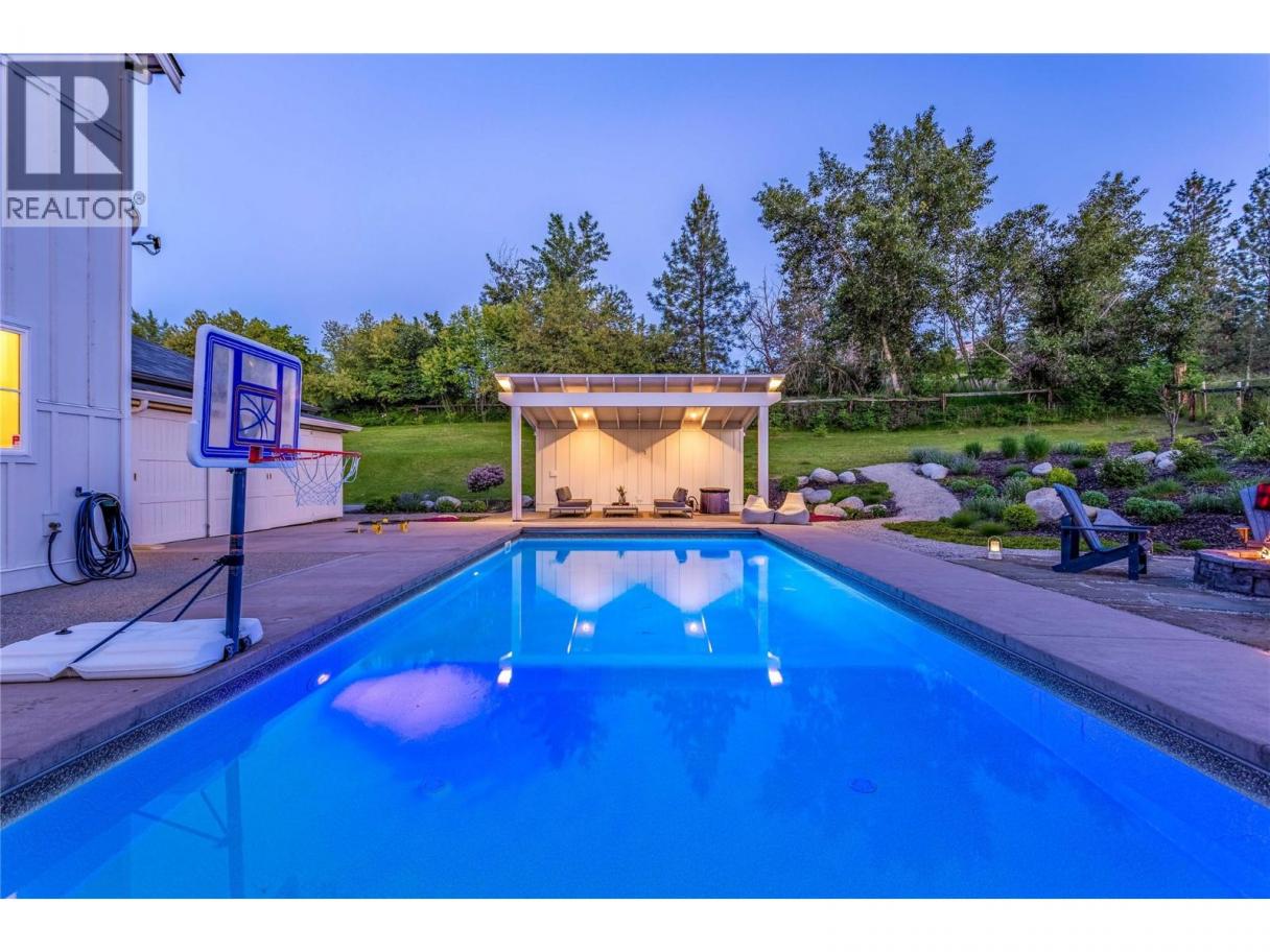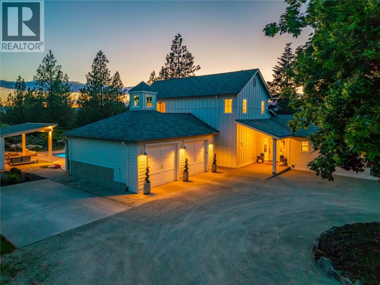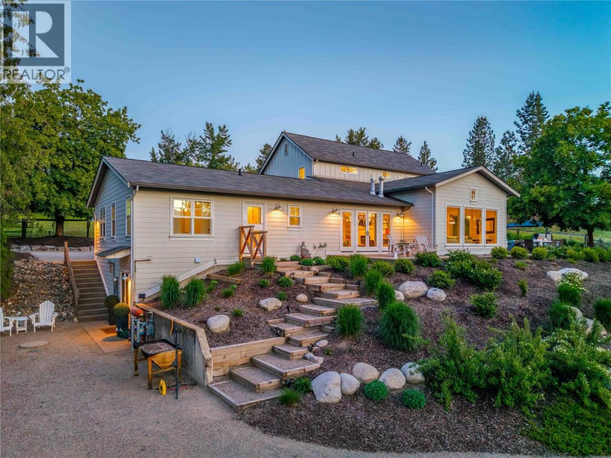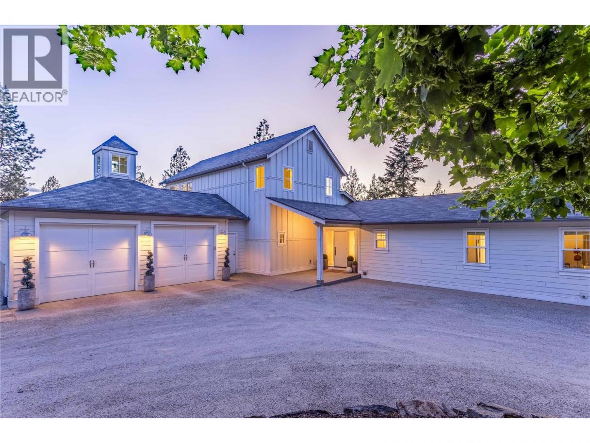 Tucked away on 4.25 private acres in Southeast Kelowna, this modern farmhouse offers refined living and complete seclusion. Thoughtfully designed and surrounded by nature, this property feels worlds away, yet remains effortlessly connected to everything that matters. Welcome to your private sanctuary in Southeast Kelowna, where nature and everyday luxury come together. Mature trees surround this modern farmhouse, and 5,600 sq ft of living space set the stage for quiet moments or lively gatherings. The heart of the home is the kitchen, which features double islands, quartz counters, and a spacious walk-in pantry. The vaulted ceiling in the dining and living areas, with white-washed beams, a brick fireplace, and a sparkling crystal chandelier, exudes warmth and style. French doors open onto a wraparound patio, an in-ground pool, and a fire pit framed by lush landscaping, inviting you to relax and unwind in complete privacy. The main level offers two bedrooms with en-suite bathrooms, walk-in closets, a den, laundry, and a mudroom for convenience. Upstairs, the primary suite is a private retreat, complete with a spa-like ensuite and a balcony overlooking the property, your perfect spot for a morning coffee or evening wine. The lower level features a second kitchen, multiple living areas, and two additional bedrooms. A heated double garage with front and rear access, plus a basement entry, adds extra convenience. This is more than just a home, it’s a lifestyle! (id:6769)