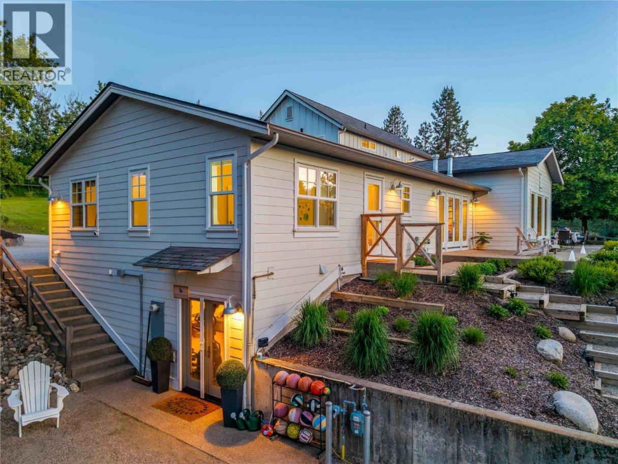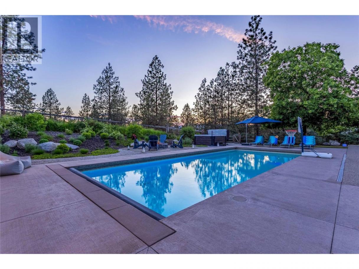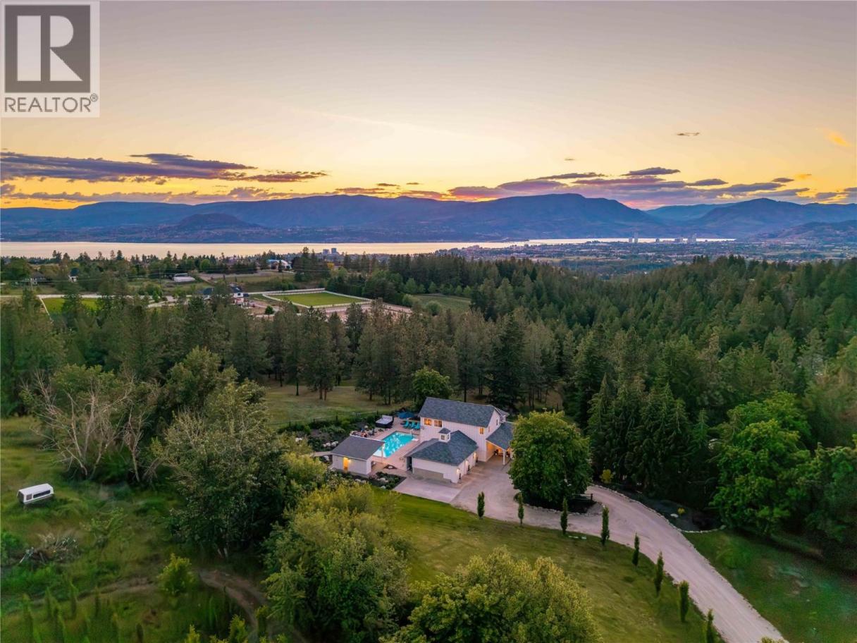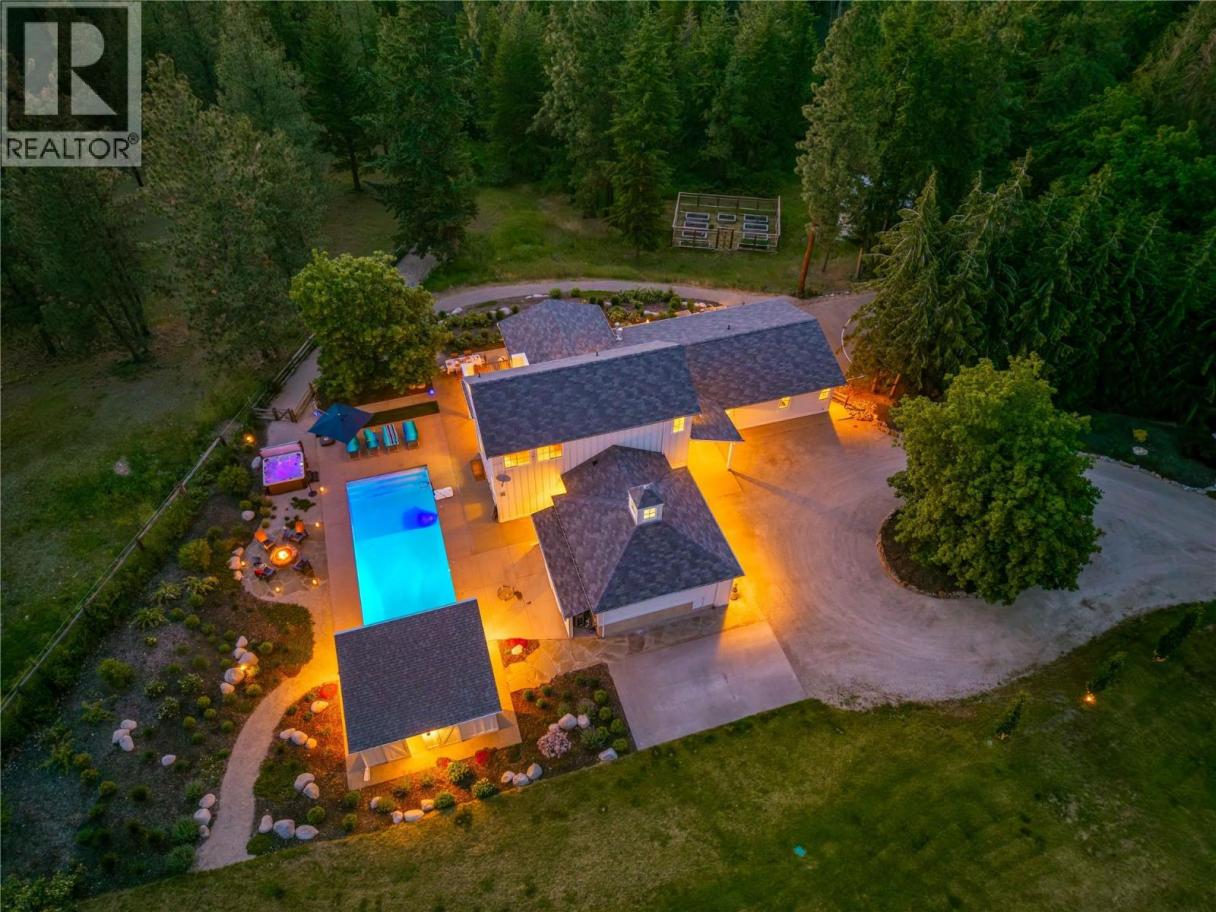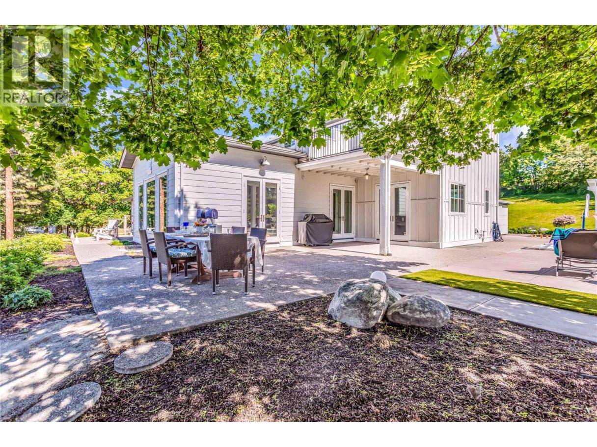 Tucked away on 4.25 private acres in Southeast Kelowna, this modern farmhouse offers refined living and complete seclusion. Thoughtfully designed and surrounded by nature, this property feels worlds away, yet remains effortlessly connected to everything that matters. Welcome to your private sanctuary in Southeast Kelowna, where nature and everyday luxury come together. Mature trees surround this modern farmhouse, and 5,600 sq ft of living space set the stage for quiet moments or lively gatherings. The heart of the home is the kitchen, which features double islands, quartz counters, and a spacious walk-in pantry. The vaulted ceiling in the dining and living areas, with white-washed beams, a brick fireplace, and a sparkling crystal chandelier, exudes warmth and style. French doors open onto a wraparound patio, an in-ground pool, and a fire pit framed by lush landscaping, inviting you to relax and unwind in complete privacy. The main level offers two bedrooms with en-suite bathrooms, walk-in closets, a den, laundry, and a mudroom for convenience. Upstairs, the primary suite is a private retreat, complete with a spa-like ensuite and a balcony overlooking the property, your perfect spot for a morning coffee or evening wine. The lower level features a second kitchen, multiple living areas, and two additional bedrooms. A heated double garage with front and rear access, plus a basement entry, adds extra convenience. This is more than just a home, it’s a lifestyle! (id:6769)