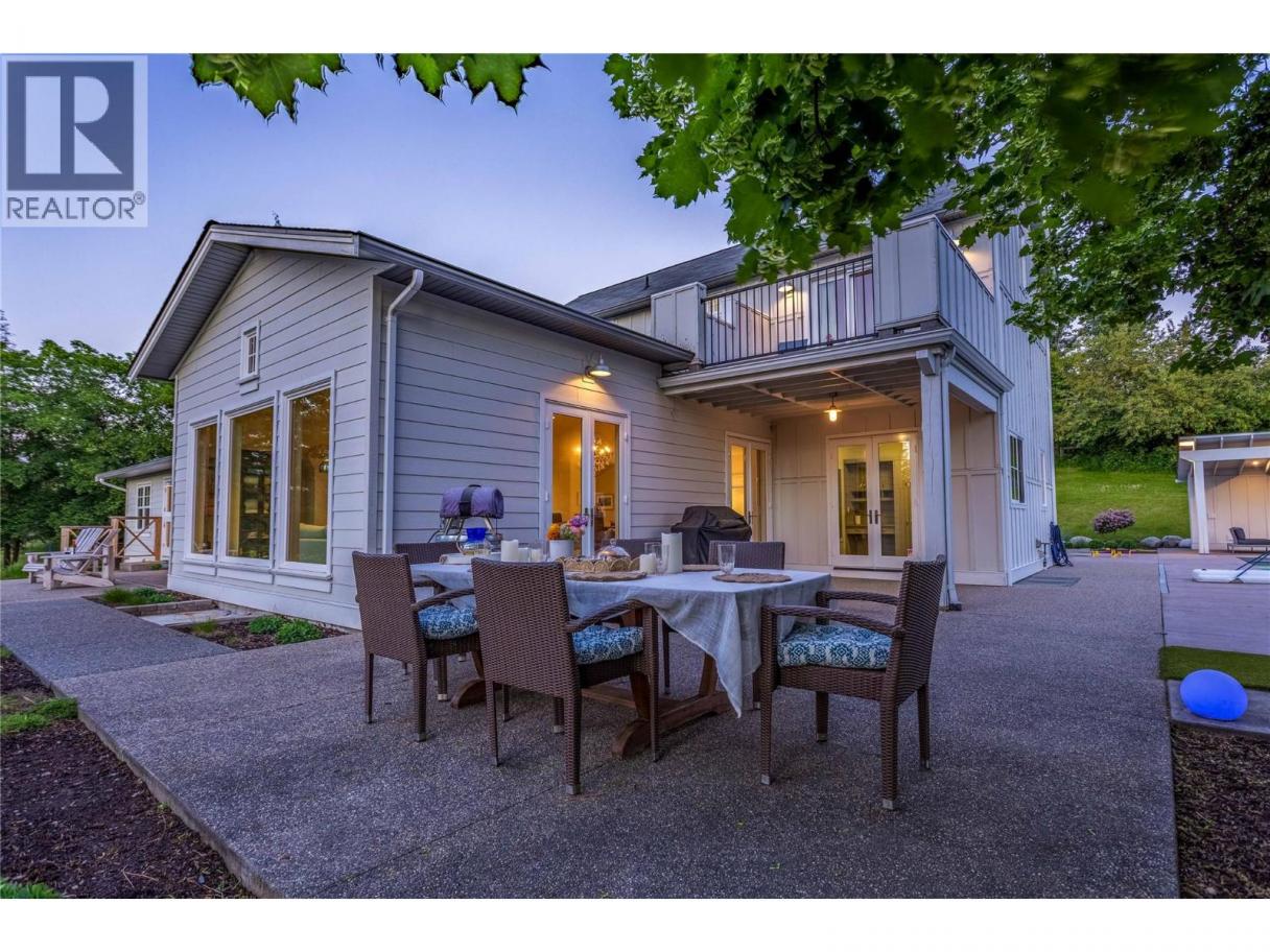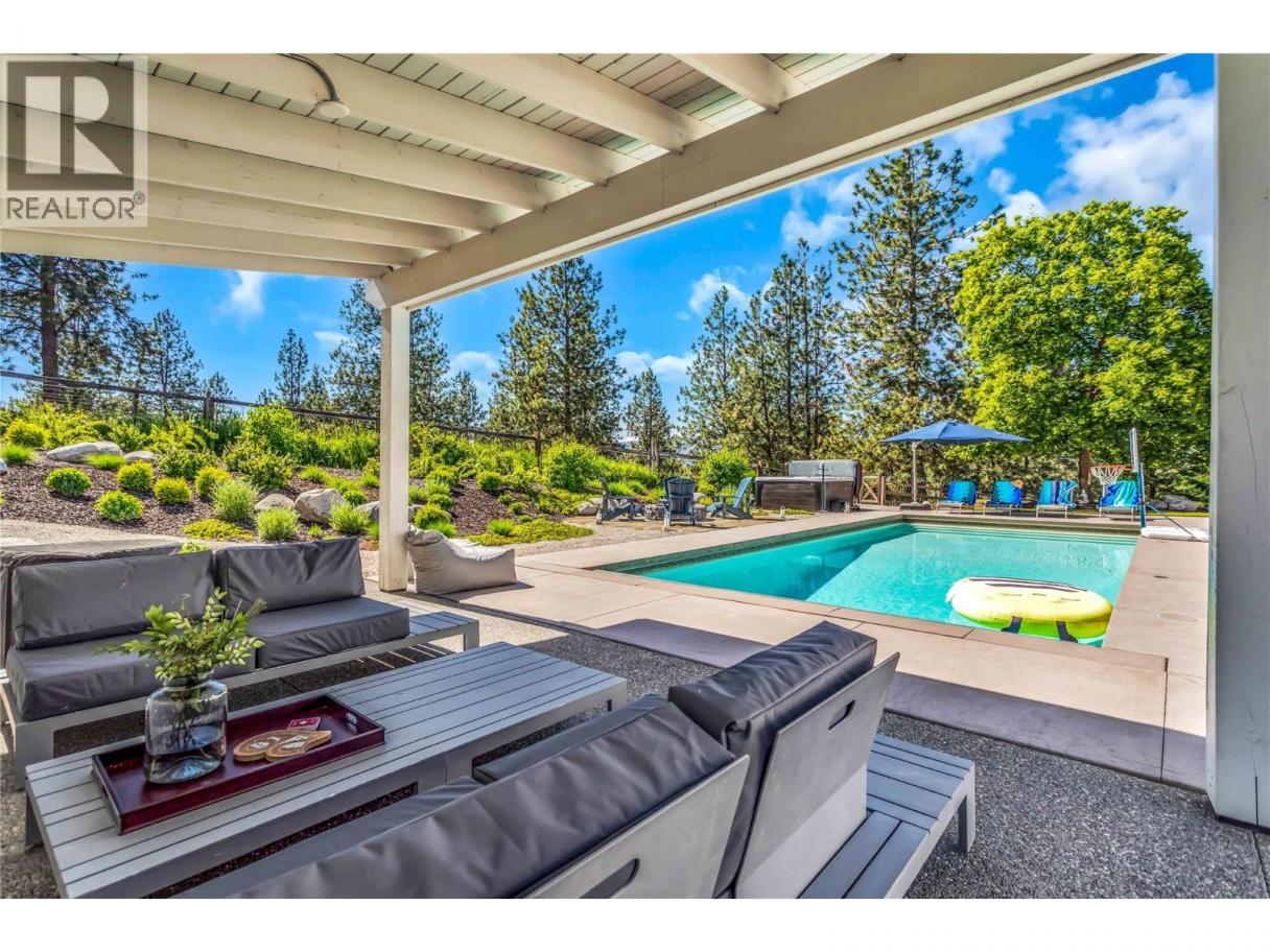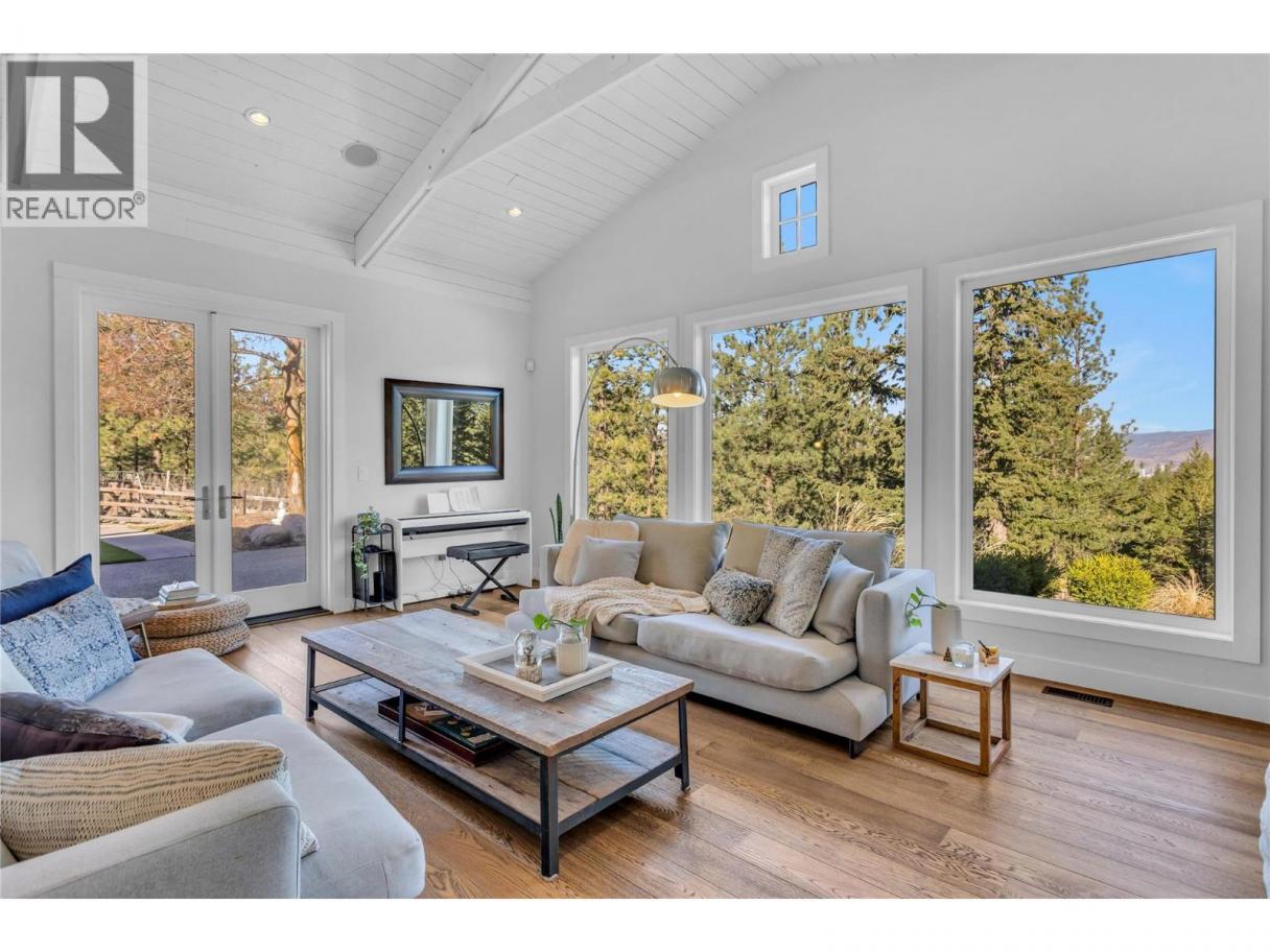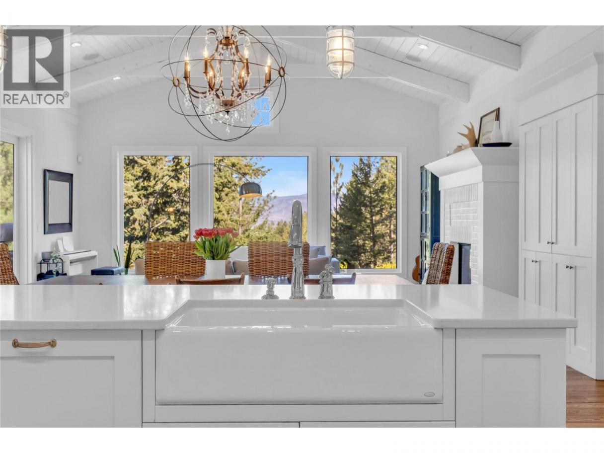 Tucked away on 4.25 private acres in Southeast Kelowna, this modern farmhouse offers refined living and complete seclusion. Thoughtfully designed and surrounded by nature, this property feels worlds away, yet remains effortlessly connected to everything that matters. Welcome to your private sanctuary in Southeast Kelowna, where nature and everyday luxury come together. Mature trees surround this modern farmhouse, and 5,600 sq ft of living space set the stage for quiet moments or lively gatherings. The heart of the home is the kitchen, which features double islands, quartz counters, and a spacious walk-in pantry. The vaulted ceiling in the dining and living areas, with white-washed beams, a brick fireplace, and a sparkling crystal chandelier, exudes warmth and style. French doors open onto a wraparound patio, an in-ground pool, and a fire pit framed by lush landscaping, inviting you to relax and unwind in complete privacy. The main level offers two bedrooms with en-suite bathrooms, walk-in closets, a den, laundry, and a mudroom for convenience. Upstairs, the primary suite is a private retreat, complete with a spa-like ensuite and a balcony overlooking the property, your perfect spot for a morning coffee or evening wine. The lower level features a second kitchen, multiple living areas, and two additional bedrooms. A heated double garage with front and rear access, plus a basement entry, adds extra convenience. This is more than just a home, it’s a lifestyle! (id:6769)