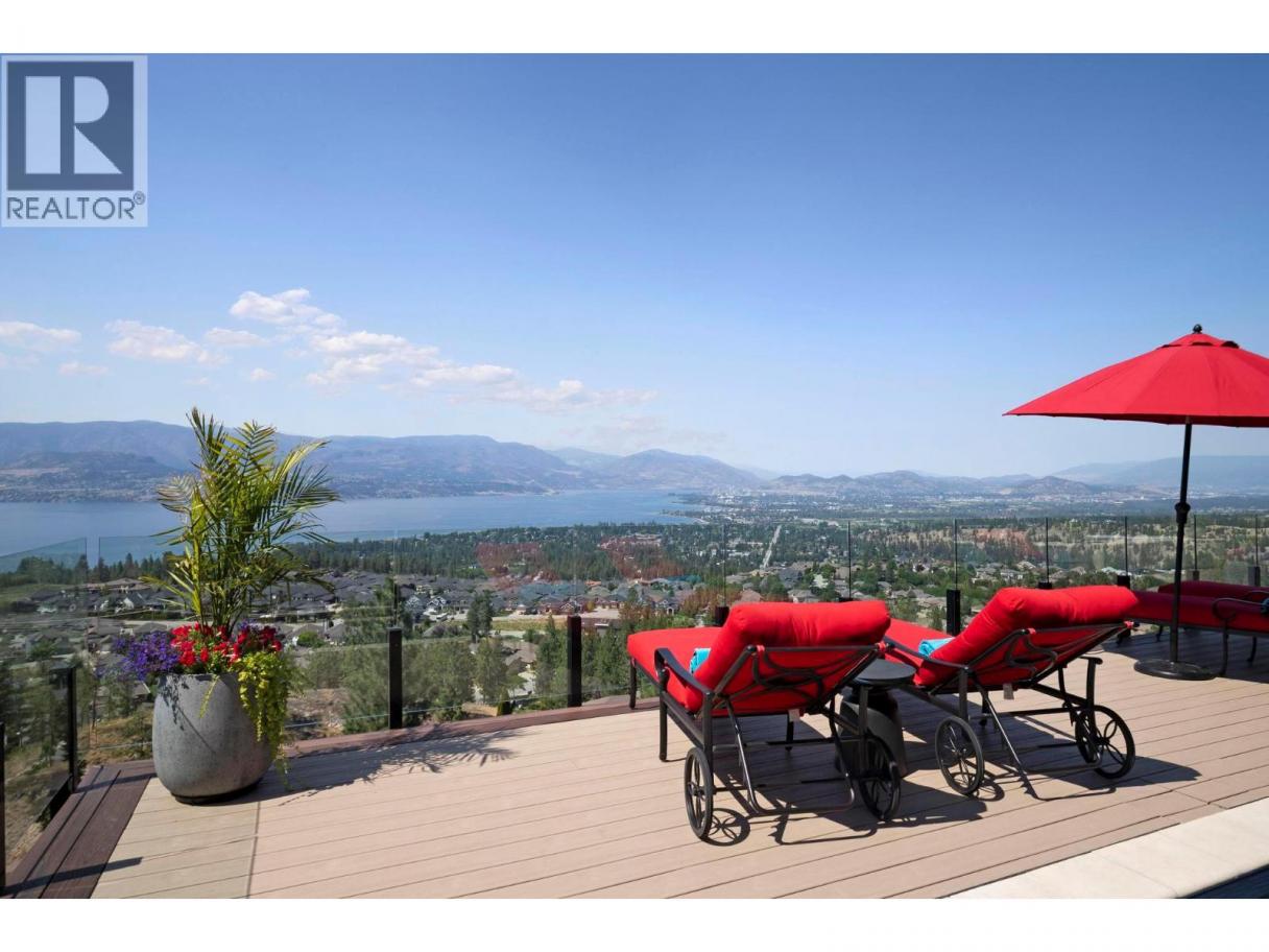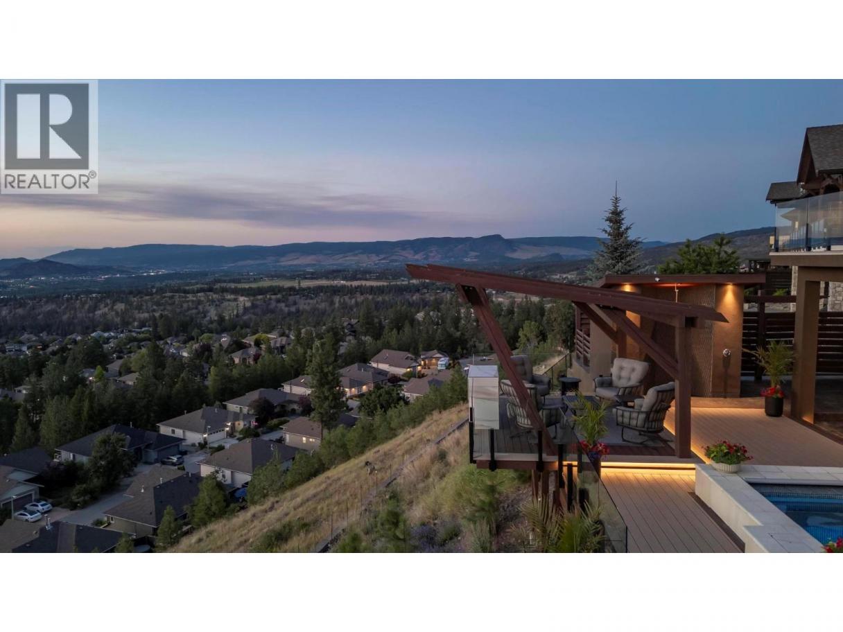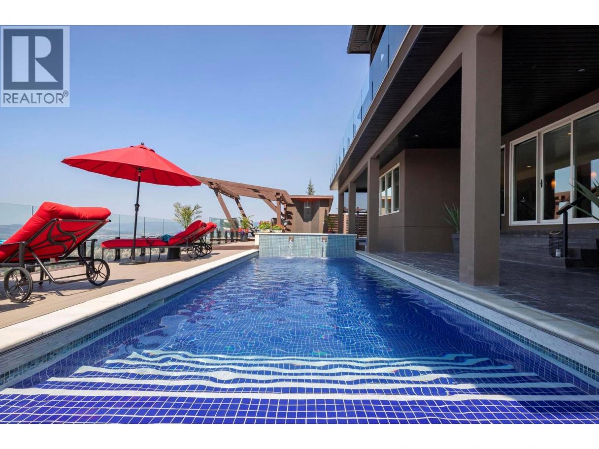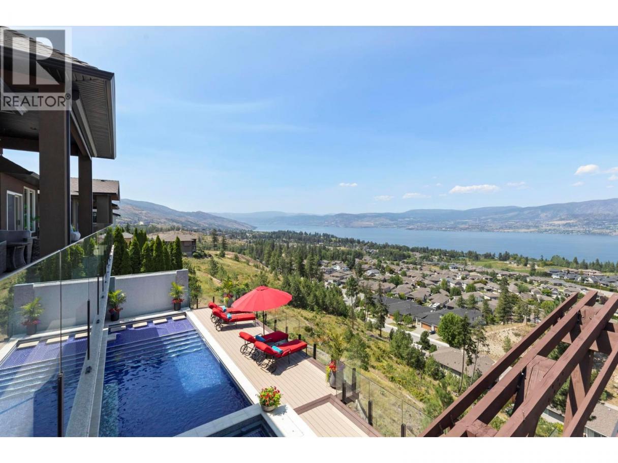 Perched in the prestigious Upper Mission this exceptional luxury residence showcases breathtaking panoramic views of Okanagan Lake, the city, and surrounding mountains. Offering over 5,100 sq.ft. of curated living space, this four-bedroom, five-bathroom residence seamlessly blends technology and lifestyle. Entry through the stunning oversized Walnut pivot door leads to the main level, featuring soaring coffered ceilings, rich hardwood flooring, and expansive windows that frame stunning views and lead to a deck spanning the entire main level. The gourmet kitchen is equipped with new professional appliances, a large island, and 2 walk-in pantries—perfect for both everyday living and entertaining. Another amazing standout feature of this home is a custom built primary closet that will take your breath away. The lower level is designed for recreation and relaxation, complete with; a full wet bar and featuring an amazing; two-tiered theatre room that has been professionally developed. To add to your ultimate comfort, the home is equipped with 2 indoor fireplaces and 3 steam showers, one in each of the ensuites. Outdoors, the showstopper awaits. The backyard featuring a dramatic cantilevered deck with tiled pool and spa, outdoor pool shower, extended fireplace deck & waterfall wall create a striking architectural focal point that complete the nearly 2000 sf of outdoor living space . For ease of maintenance and storage of pool equipment, there is a fully enclosed equipment room containing a newly upgraded Hayward control system managing the pool, spa, water features & lighting. Extensively updated, this home features new flooring, refreshed interior paint, lighting, water softener system, motorized Hunter Douglas blinds; two motorized Phantom sun screens; new glass panel garage door; epoxy garage floors; hardwired EV charger and a fully integrated security system with cameras. Please inquire for a list of comprehensive upgrades. (id:6769)