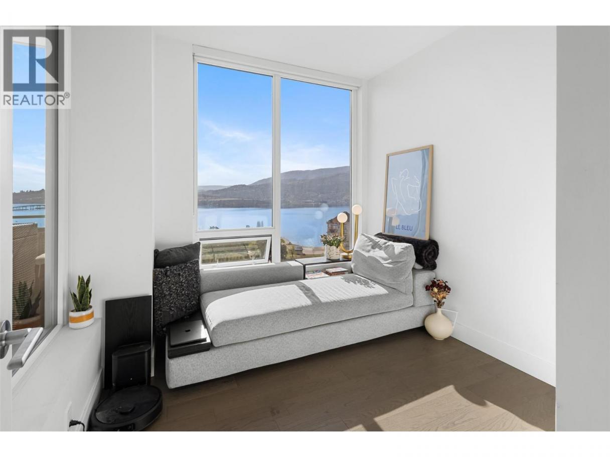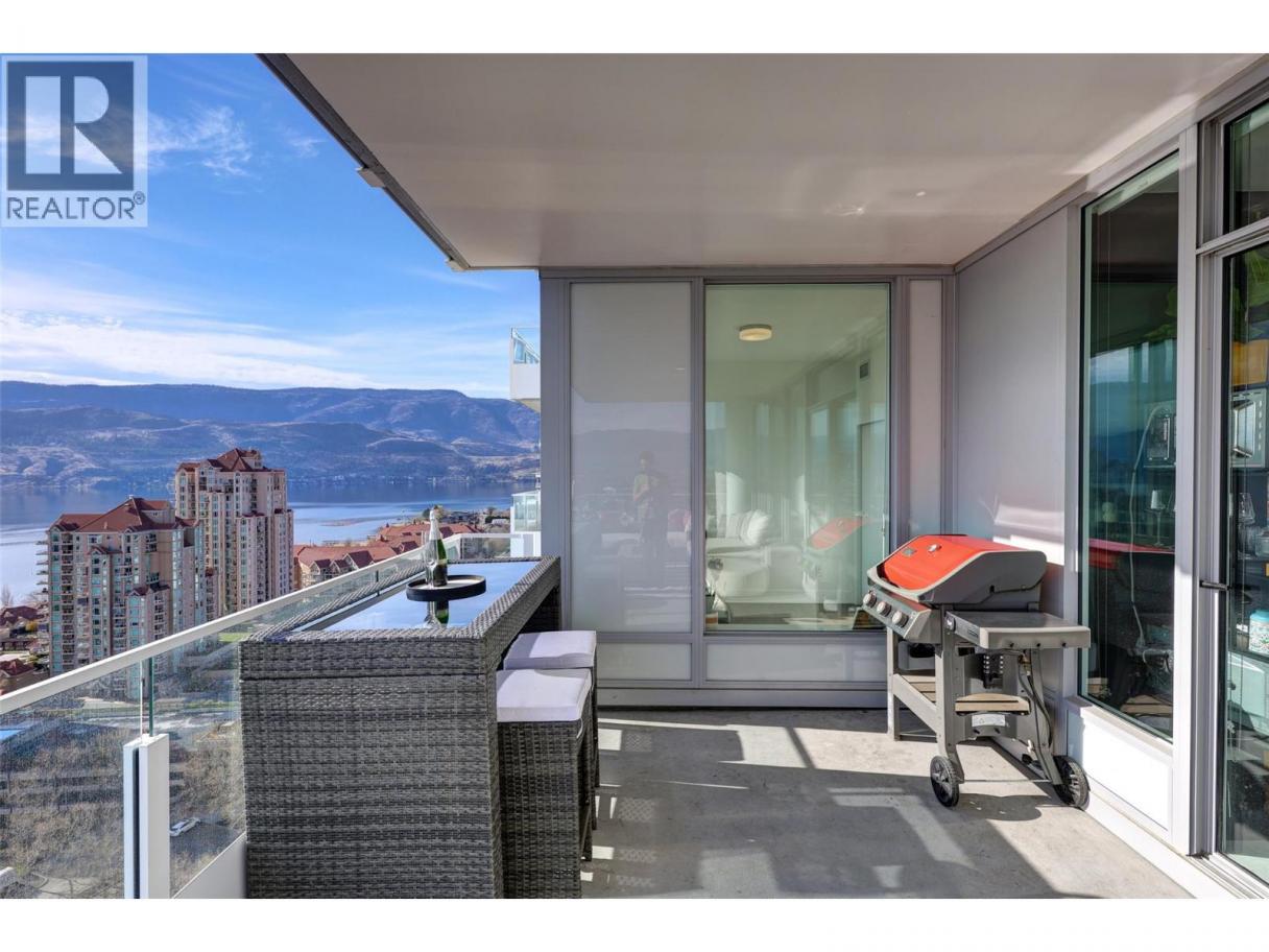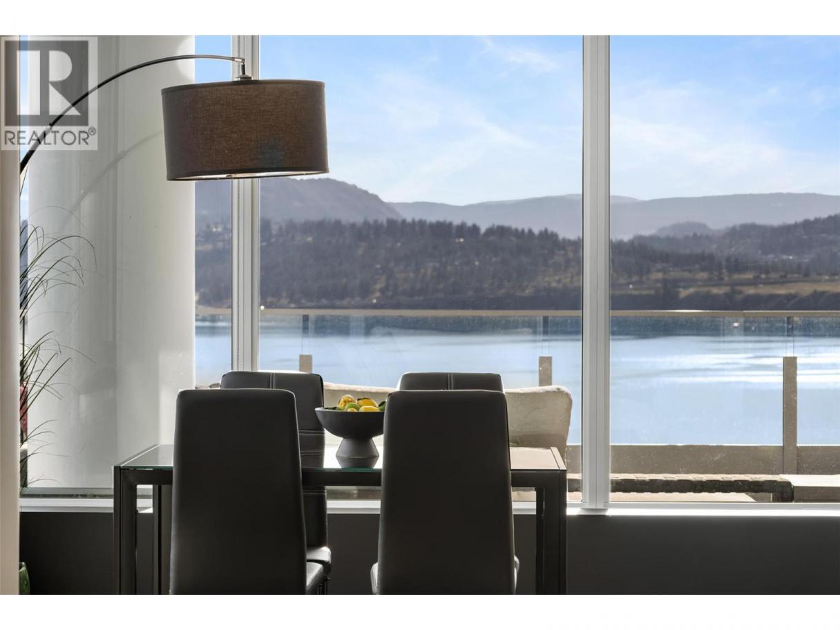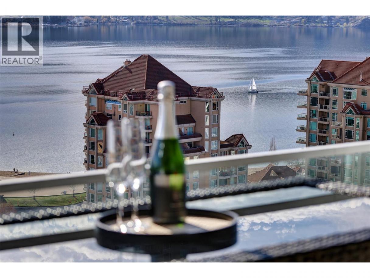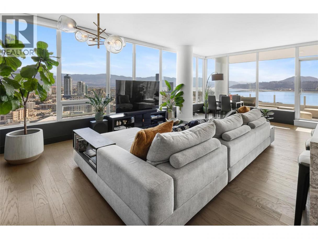 Experience elevated downtown living from this exceptional high-rise residence at One Water Street. Perfectly positioned to capture sweeping east-to-west views, this home showcases an ever-changing backdrop of Okanagan Lake, the bridge, mountains, yacht club, and vibrant city skyline. Designed with both comfort and style in mind, the open-concept layout offers over 1300 sq ft of thoughtfully curated living space, framed by expansive floor-to-ceiling windows that flood the home with natural light. The gourmet kitchen is a true showpiece, featuring premium KitchenAid stainless steel appliances, a gas range, quartz countertops, and a waterfall island, ideal for entertaining. Step outside to the spacious covered deck, complete with a gas BBQ hookup, the perfect setting for relaxing or hosting against a stunning panoramic backdrop. The primary suite is generously sized to accommodate a king bed and includes dual closets along with a spa-inspired ensuite featuring a walk-in tiled shower. A second bedroom, den, and ample in-suite storage provide flexibility for guests, a home office, or additional living space. Residents enjoy access to resort-style amenities including 2 pools, a hot tub, fully equipped fitness centre, pickleball court, fire pit lounges, guest suites, EV charging, and more. Located just steps from the beach, Cultural District, breweries, restaurants, shops, and Prospera Place, this is true walkable urban living. (id:6769)