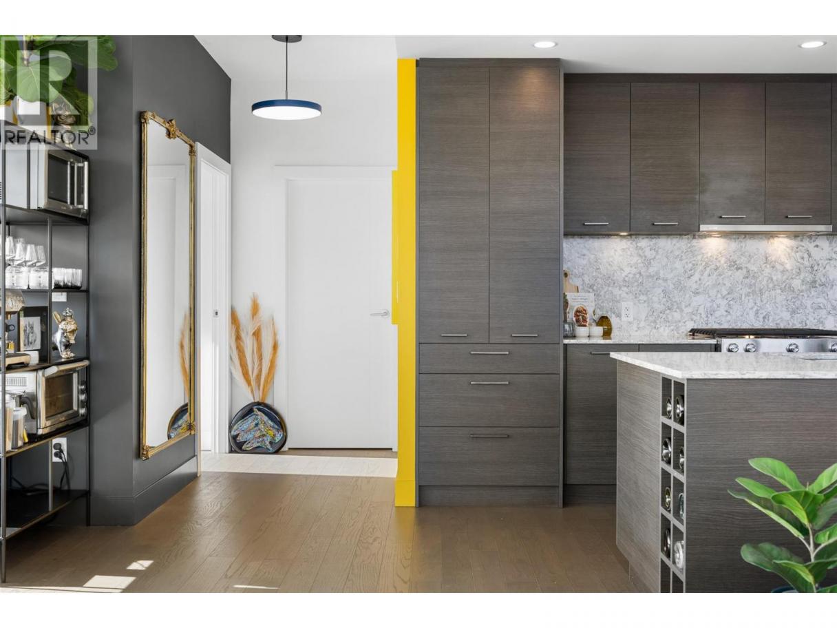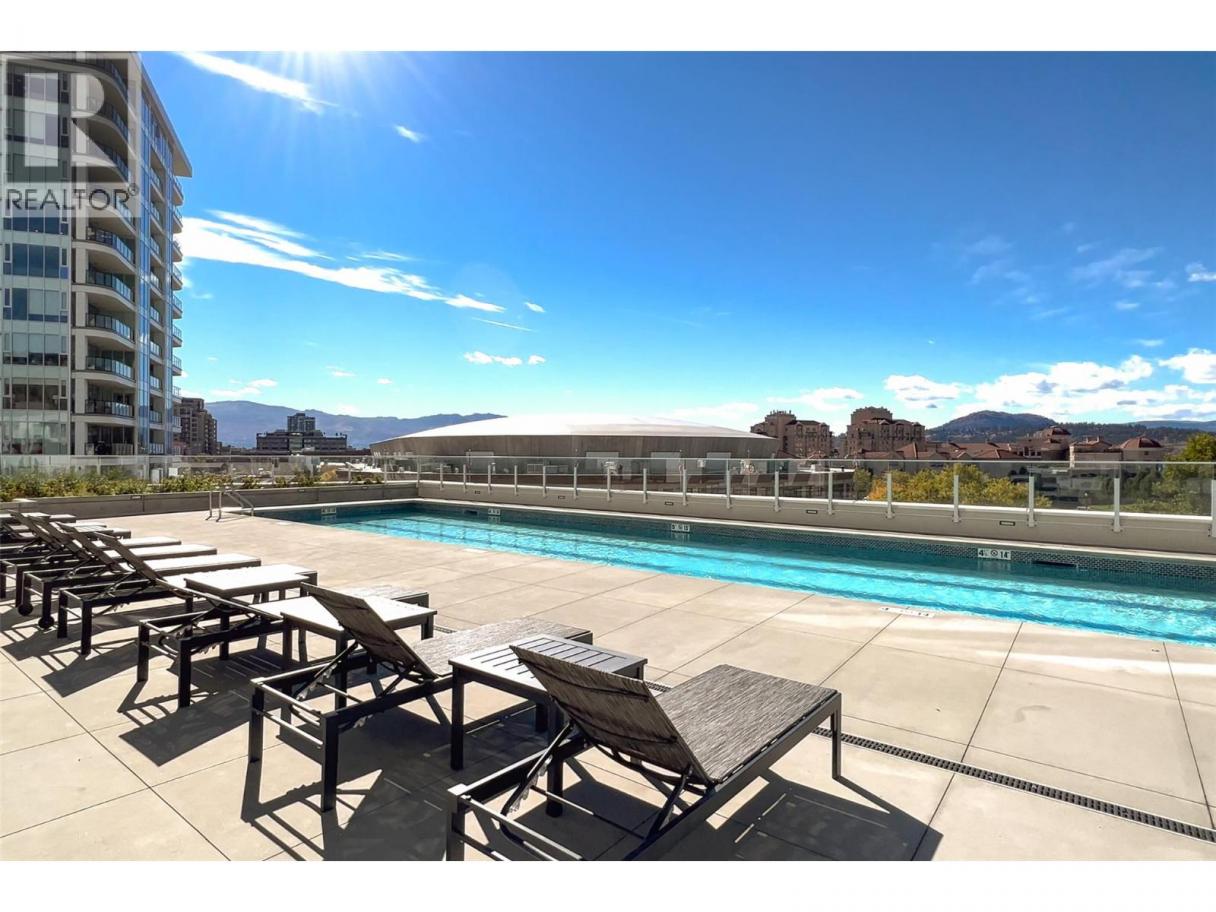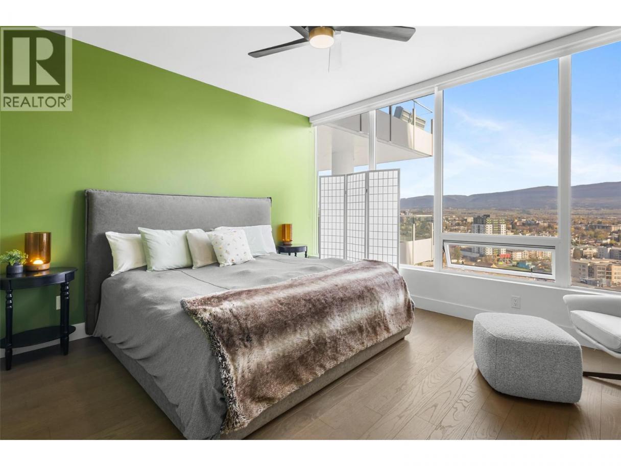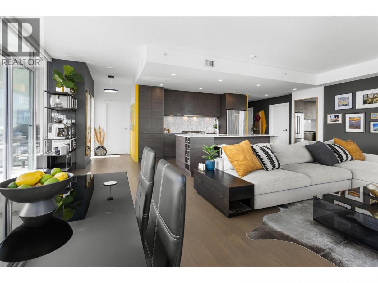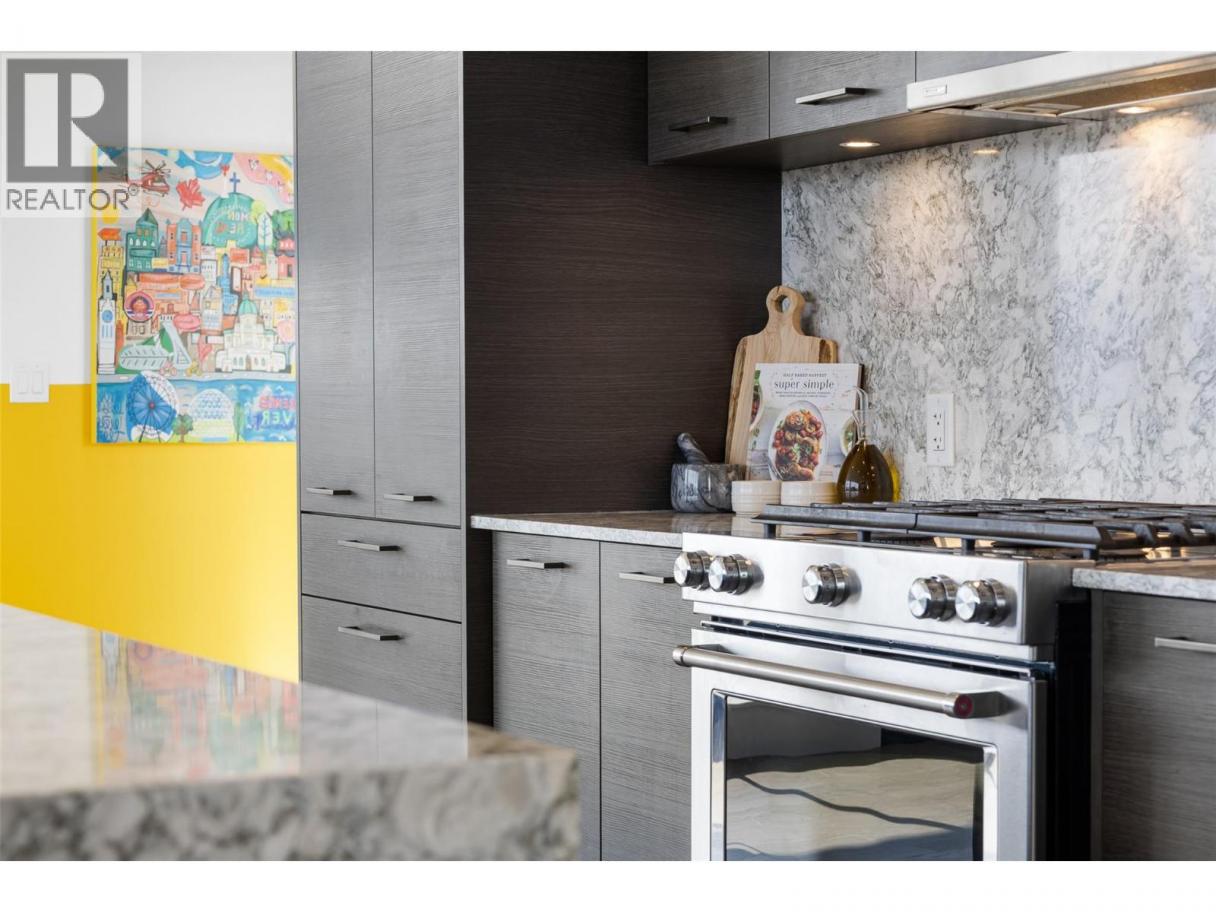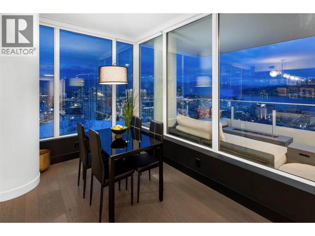 Experience elevated downtown living from this exceptional high-rise residence at One Water Street. Perfectly positioned to capture sweeping east-to-west views, this home showcases an ever-changing backdrop of Okanagan Lake, the bridge, mountains, yacht club, and vibrant city skyline. Designed with both comfort and style in mind, the open-concept layout offers over 1300 sq ft of thoughtfully curated living space, framed by expansive floor-to-ceiling windows that flood the home with natural light. The gourmet kitchen is a true showpiece, featuring premium KitchenAid stainless steel appliances, a gas range, quartz countertops, and a waterfall island, ideal for entertaining. Step outside to the spacious covered deck, complete with a gas BBQ hookup, the perfect setting for relaxing or hosting against a stunning panoramic backdrop. The primary suite is generously sized to accommodate a king bed and includes dual closets along with a spa-inspired ensuite featuring a walk-in tiled shower. A second bedroom, den, and ample in-suite storage provide flexibility for guests, a home office, or additional living space. Residents enjoy access to resort-style amenities including 2 pools, a hot tub, fully equipped fitness centre, pickleball court, fire pit lounges, guest suites, EV charging, and more. Located just steps from the beach, Cultural District, breweries, restaurants, shops, and Prospera Place, this is true walkable urban living. (id:6769)